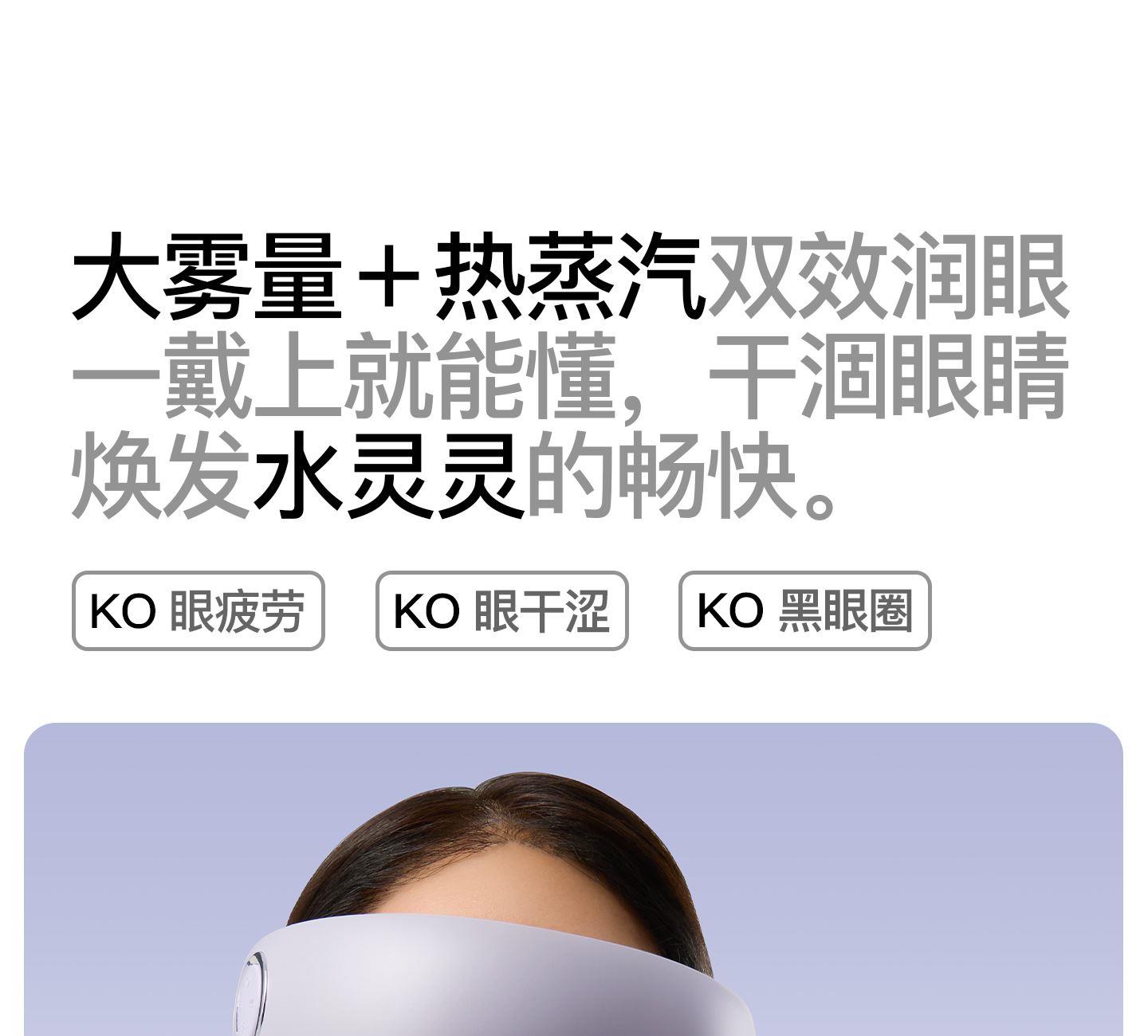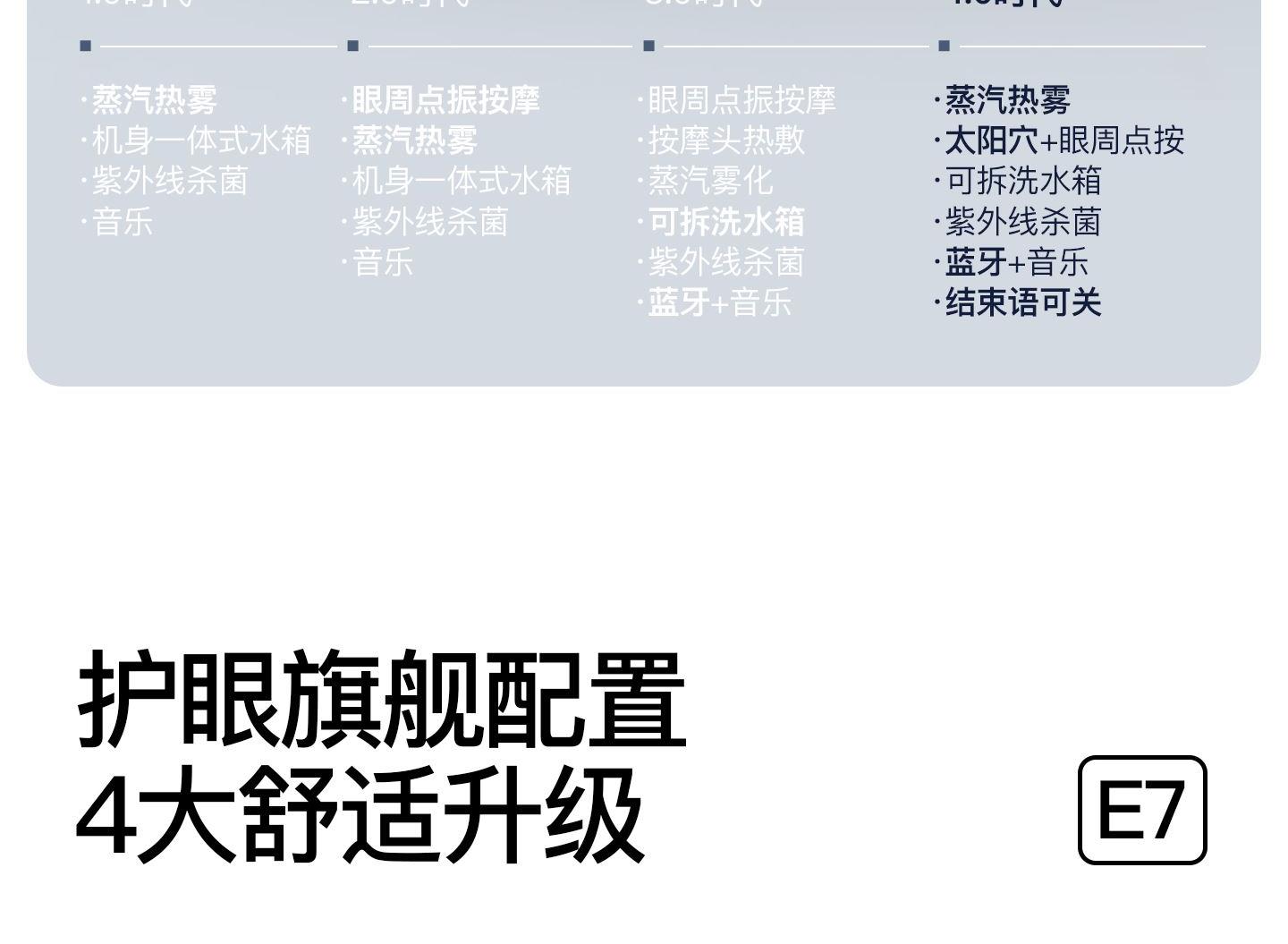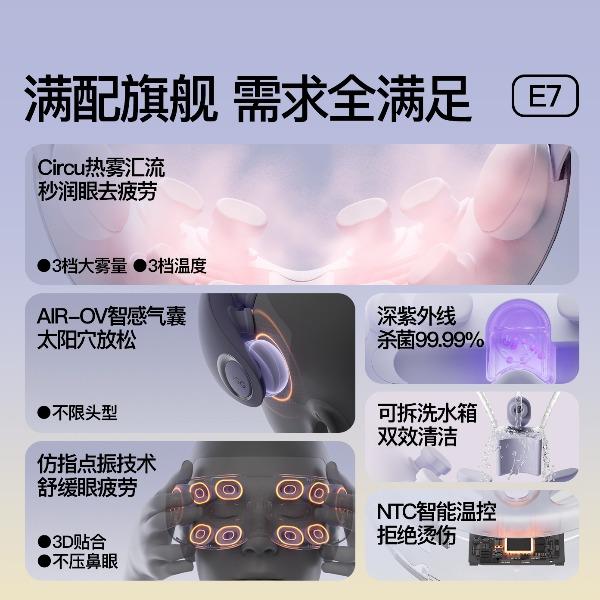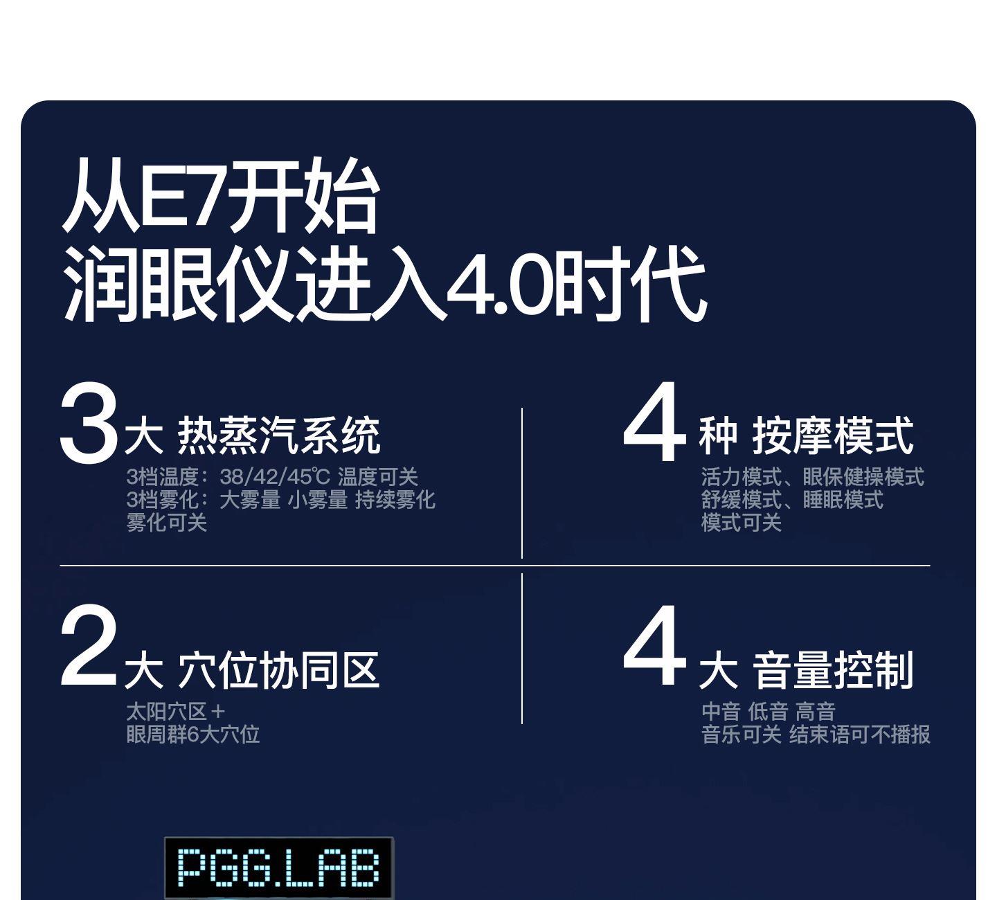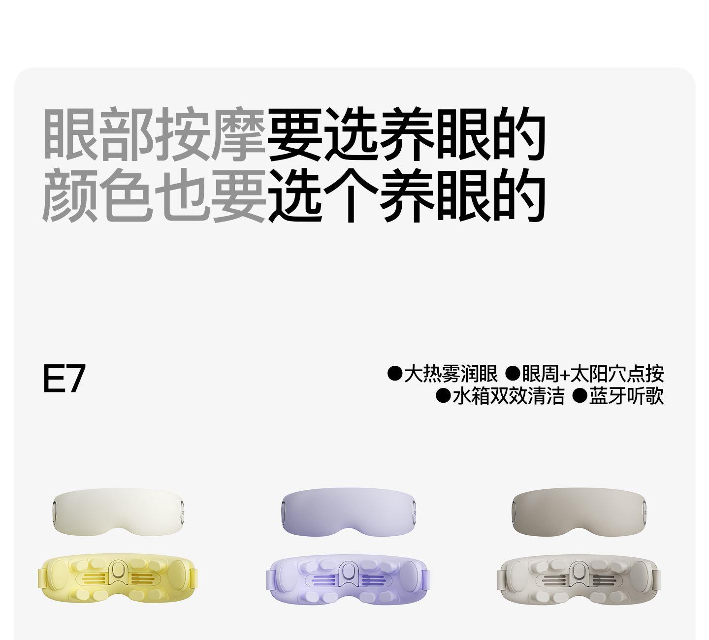 ●980+真人实证,协同权威眼科医生评估 ●从E7开始润眼仪进入4.0时代 ●3大热蒸汽系统﹙3档温度:38/42/45℃ 温度可关 3档雾化:大雾量 小雾量 持续雾化;雾化可关﹚ ●2大穴位协同区﹙太阳区+眼周群6大穴位﹚ ●4种按摩模式:眼保8操模式+热敷;睡眠模式+静音;舒缓模式+白噪音;活力模式+冷敷 ●两种尺寸可选择:145mm和155mm ●双边平衡绑带,佩戴稳,不易掉 ●可拆洗弹性绑带,不挑人不怕脏 ●仿生建模般贴合,不压眼球鼻梁,午睡不花妆。 ●深紫外线*菌水箱有效*菌率99.99%,10W+加重眼症状大肠杆菌、霉菌等等