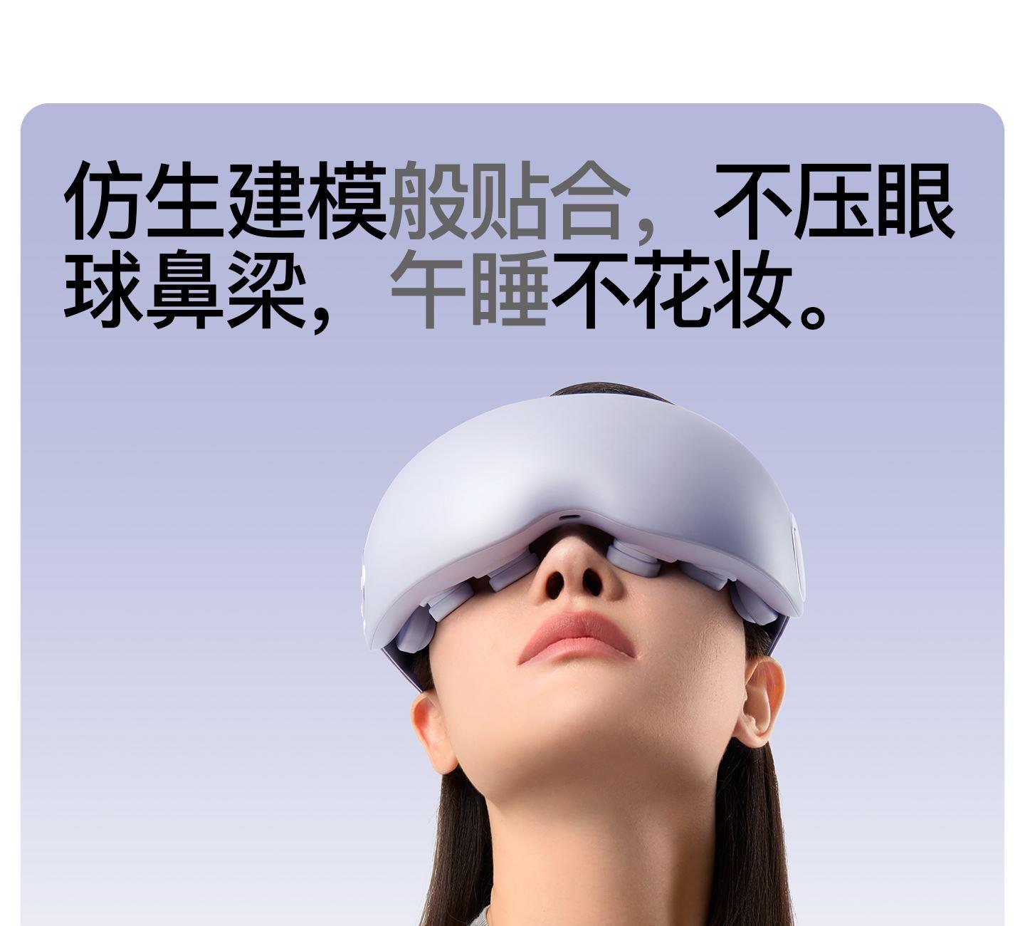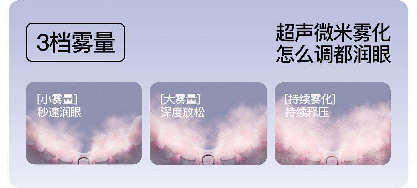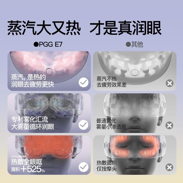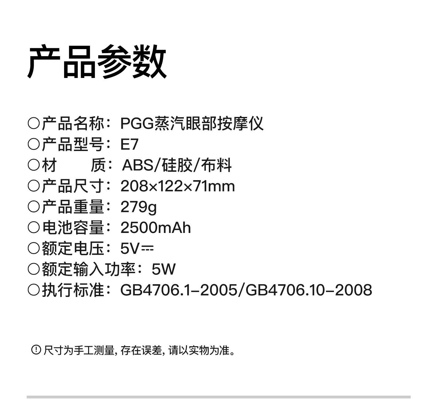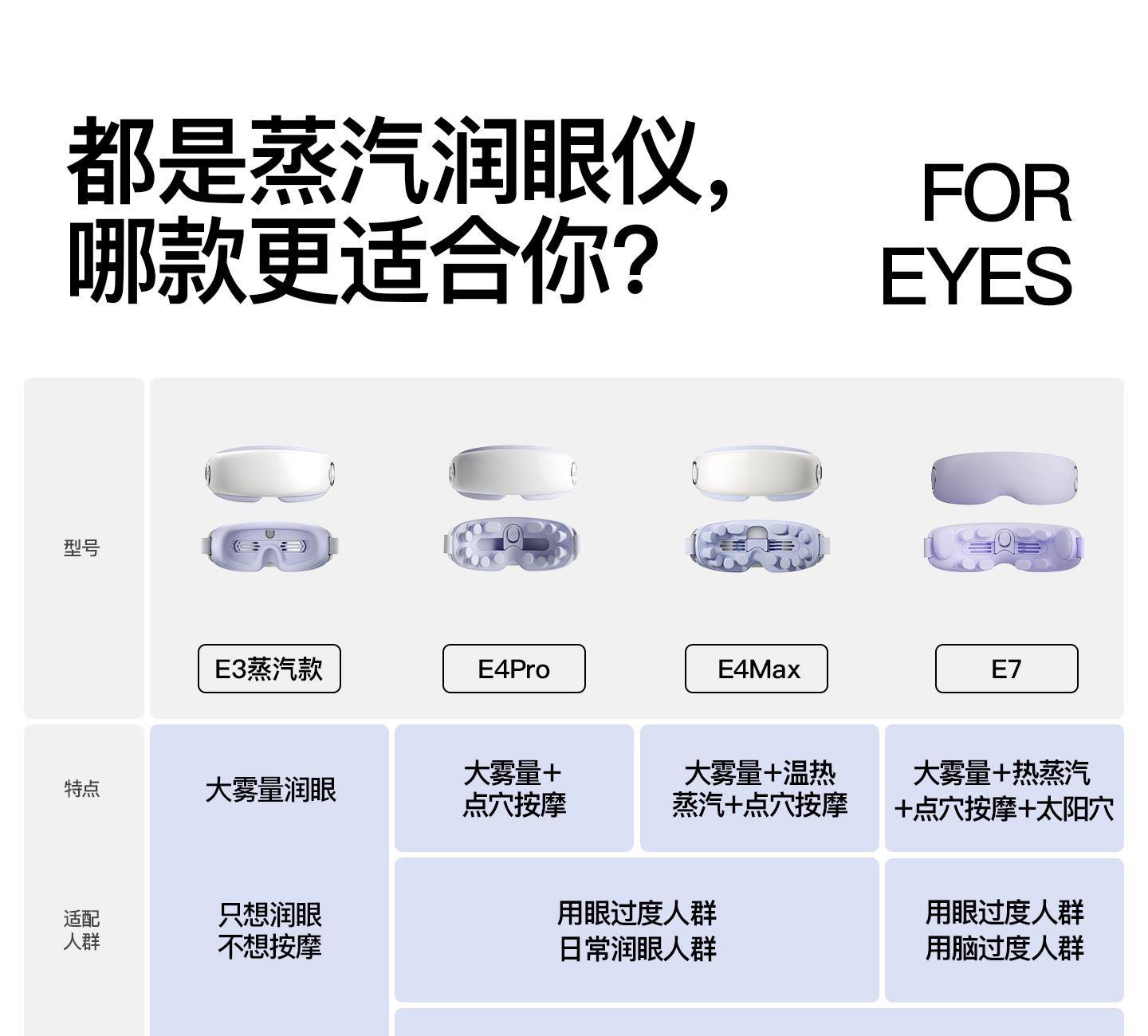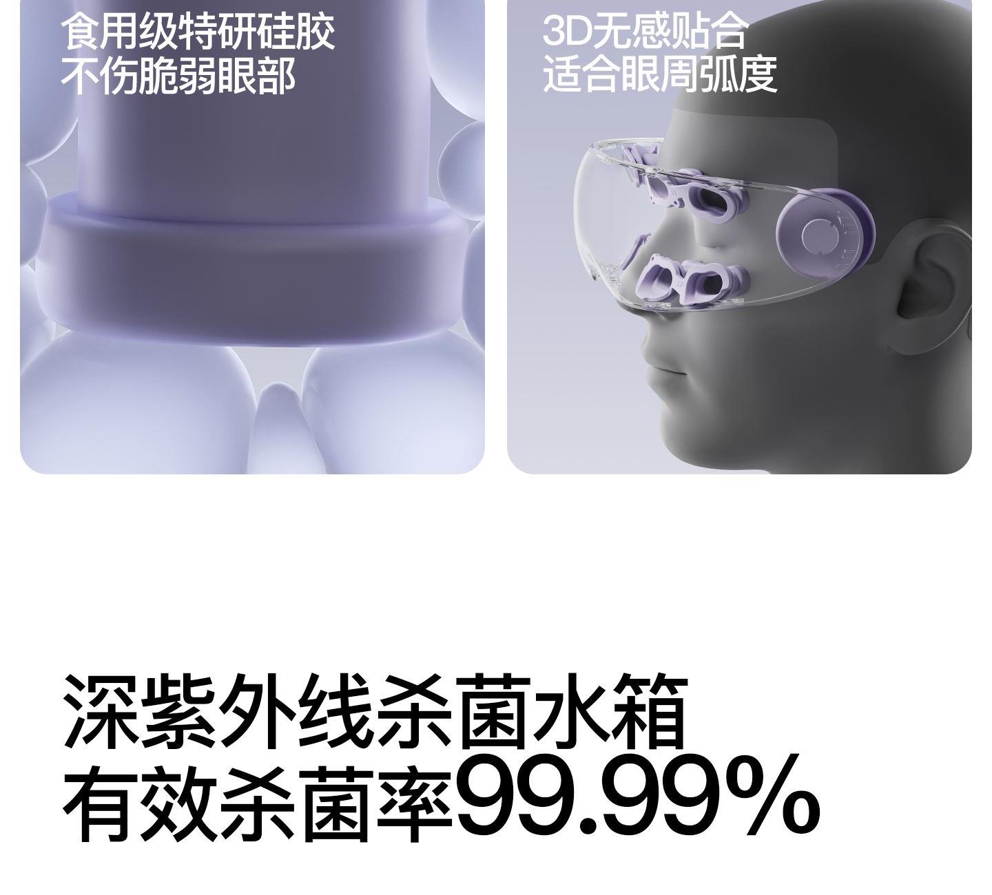 ●980+真人实证,协同权威眼科医生评估 ●从E7开始润眼仪进入4.0时代 ●3大热蒸汽系统﹙3档温度:38/42/45℃ 温度可关 3档雾化:大雾量 小雾量 持续雾化;雾化可关﹚ ●2大穴位协同区﹙太阳区+眼周群6大穴位﹚ ●4种按摩模式:眼保8操模式+热敷;睡眠模式+静音;舒缓模式+白噪音;活力模式+冷敷 ●两种尺寸可选择:145mm和155mm ●双边平衡绑带,佩戴稳,不易掉 ●可拆洗弹性绑带,不挑人不怕脏 ●仿生建模般贴合,不压眼球鼻梁,午睡不花妆。 ●深紫外线*菌水箱有效*菌率99.99%,10W+加重眼症状大肠杆菌、霉菌等等