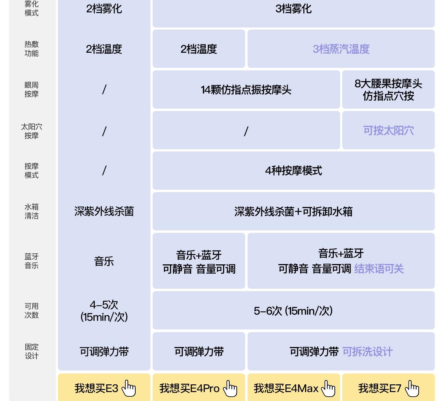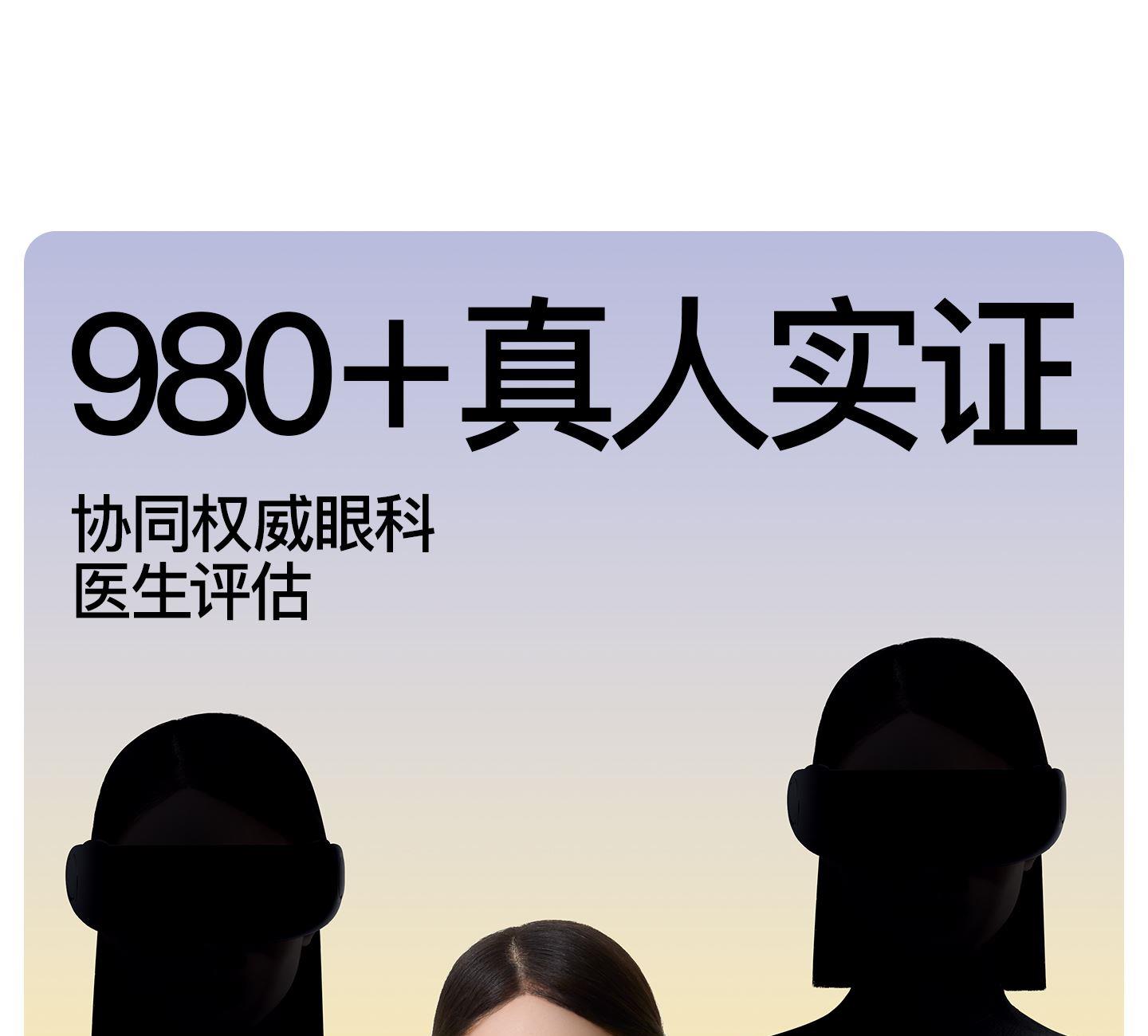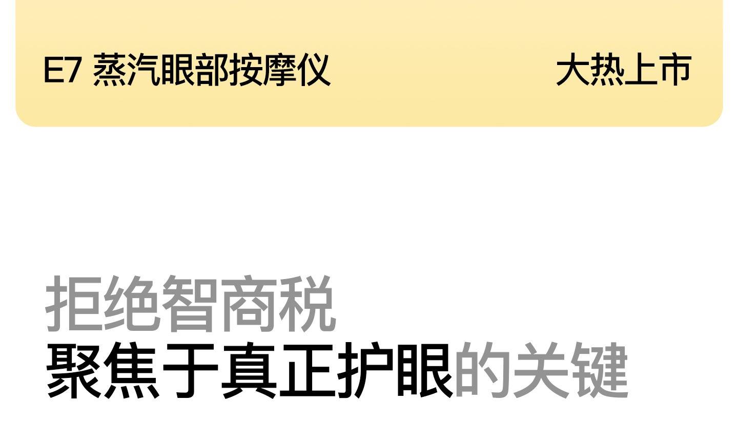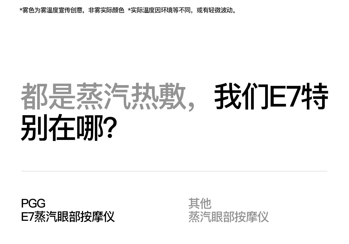 ●980+真人实证,协同权威眼科医生评估 ●从E7开始润眼仪进入4.0时代 ●3大热蒸汽系统﹙3档温度:38/42/45℃ 温度可关 3档雾化:大雾量 小雾量 持续雾化;雾化可关﹚ ●2大穴位协同区﹙太阳区+眼周群6大穴位﹚ ●4种按摩模式:眼保8操模式+热敷;睡眠模式+静音;舒缓模式+白噪音;活力模式+冷敷 ●两种尺寸可选择:145mm和155mm ●双边平衡绑带,佩戴稳,不易掉 ●可拆洗弹性绑带,不挑人不怕脏 ●仿生建模般贴合,不压眼球鼻梁,午睡不花妆。 ●深紫外线*菌水箱有效*菌率99.99%,10W+加重眼症状大肠杆菌、霉菌等等