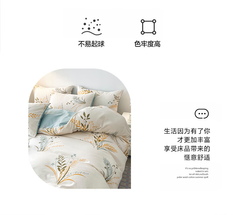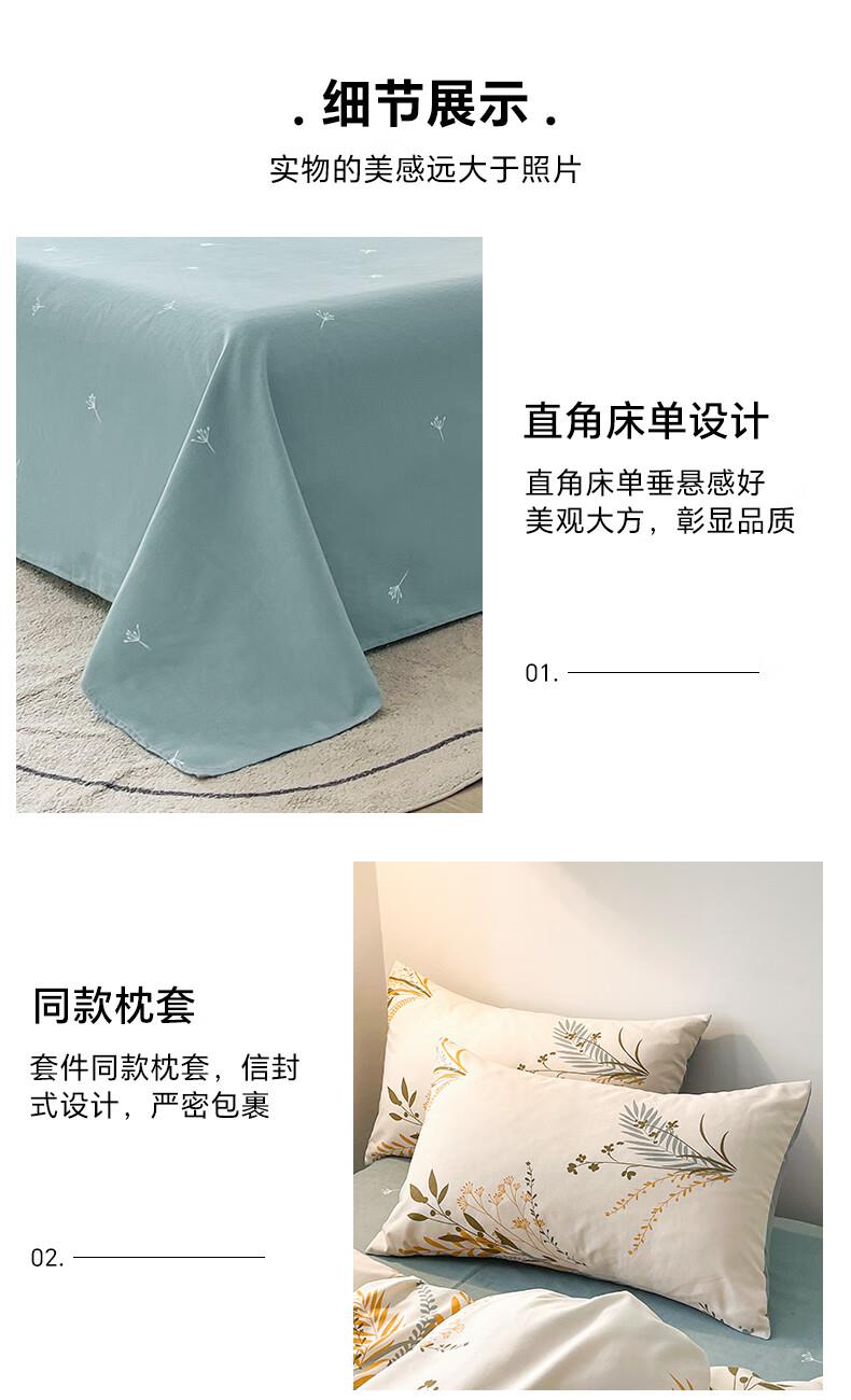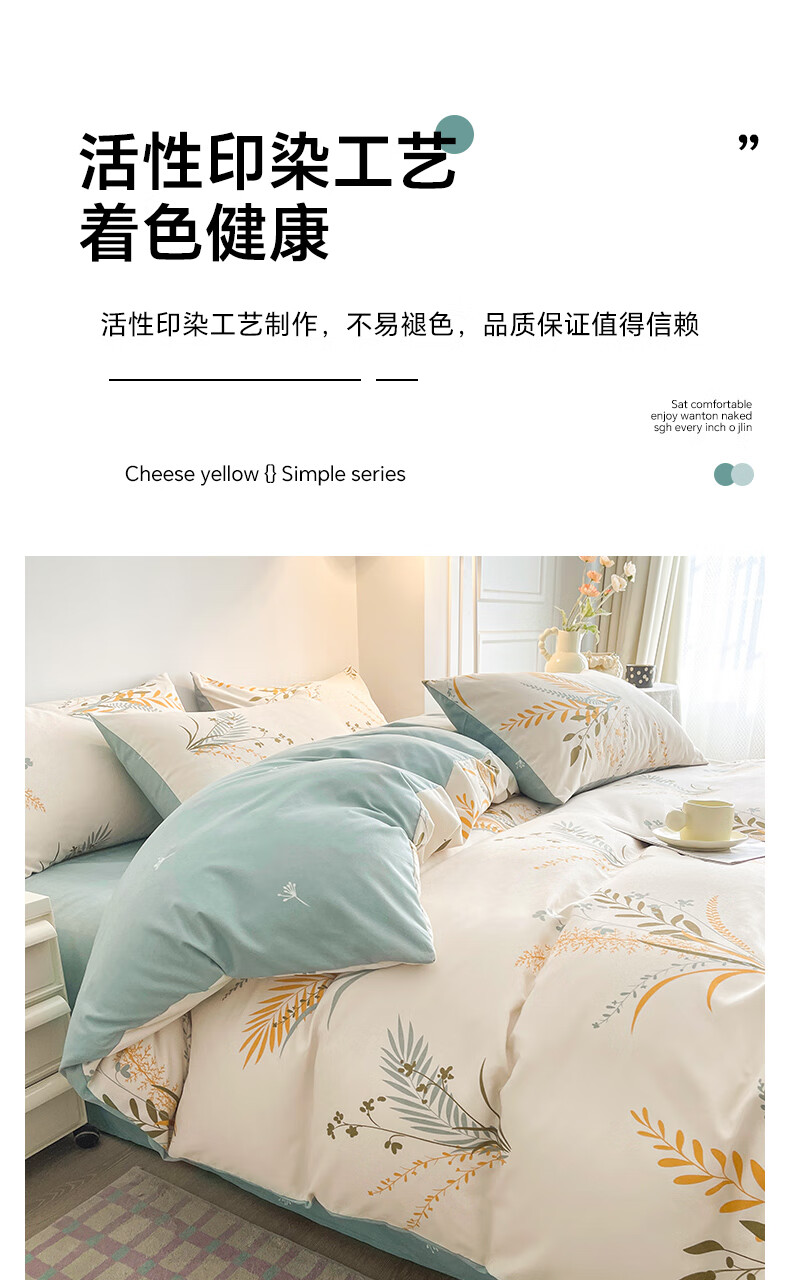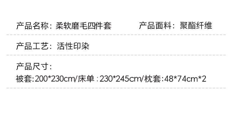 被套:200*230cm 床单:230*245cm 枕套:48*74cm*2 面料:磨毛棉 执行标准:GB/T22796-2021 安全类别:GB18401-2010 B类 1新型环保浆料活性印染,不褪色,不缩水,其生态环保理念在很大程度上满足了消费者对床品舒适度的高要。 2.手感柔软,舒适质感丰厚,而且有厚重感,容易打理。整体套件,色彩丰富自然,阵线细致密实,错落有序,更显档次。