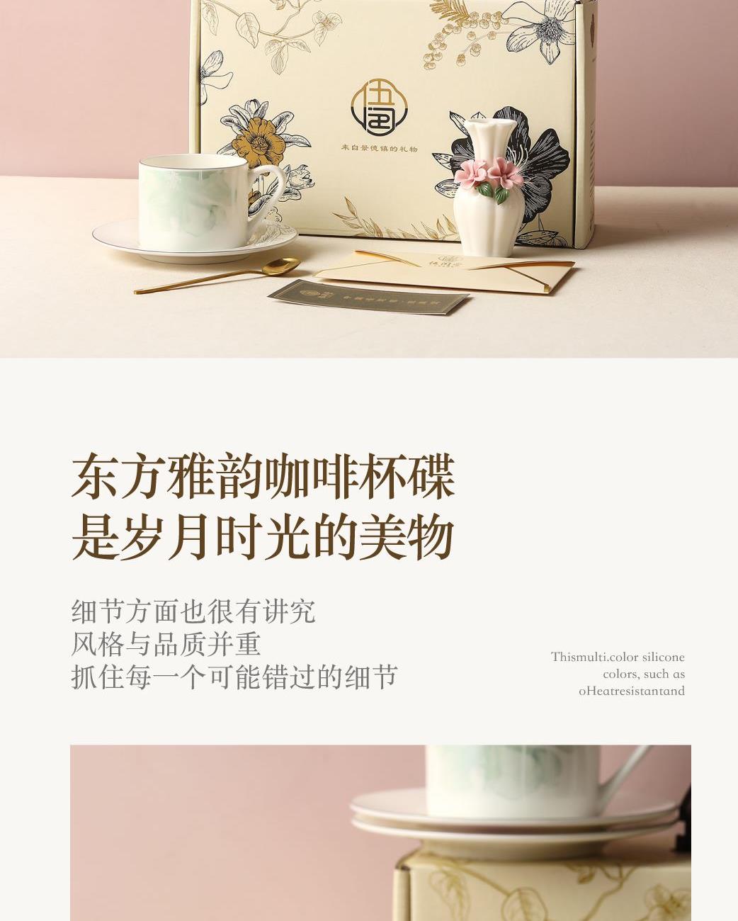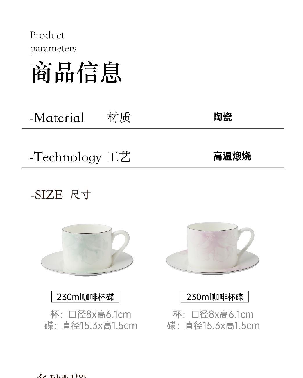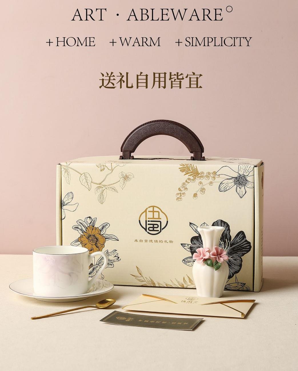 产品组成:茶咖杯2、碟子2、花瓶1、勺子2 产品材质:高骨瓷 产品工艺:贴花+描金 包装尺寸:37.5*18.2*11.5cm 外箱尺寸:39*36*40.5cm