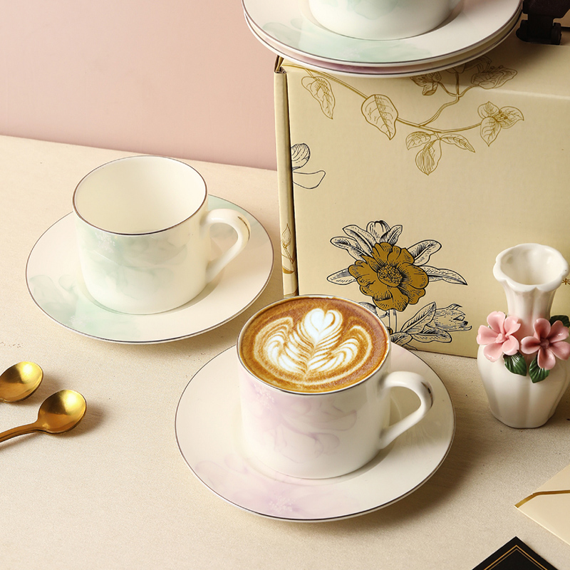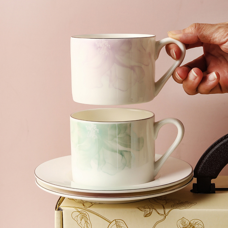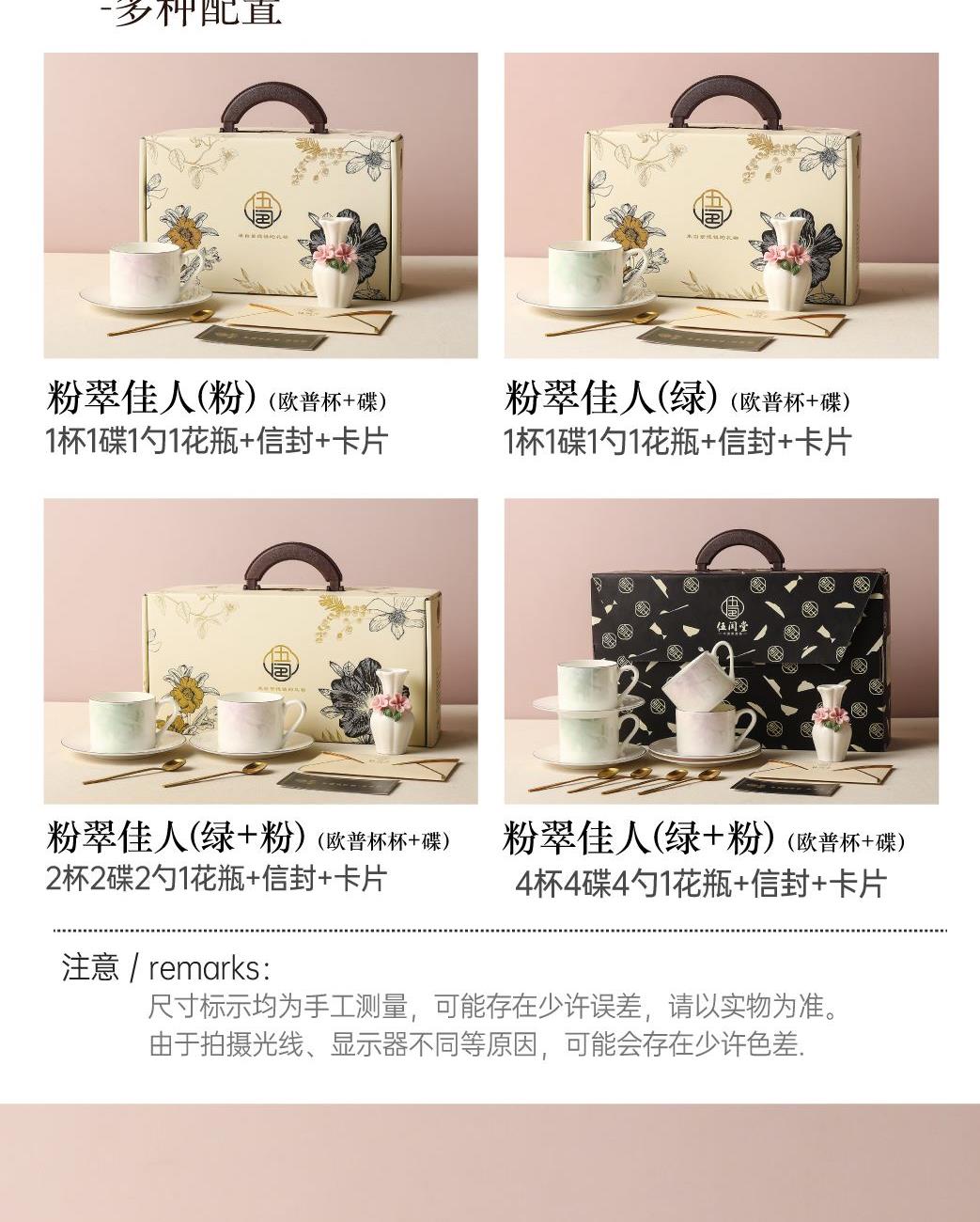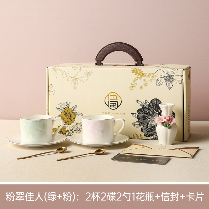 产品组成:茶咖杯2、碟子2、花瓶1、勺子2 产品材质:高骨瓷 产品工艺:贴花+描金 包装尺寸:37.5*18.2*11.5cm 外箱尺寸:39*36*40.5cm