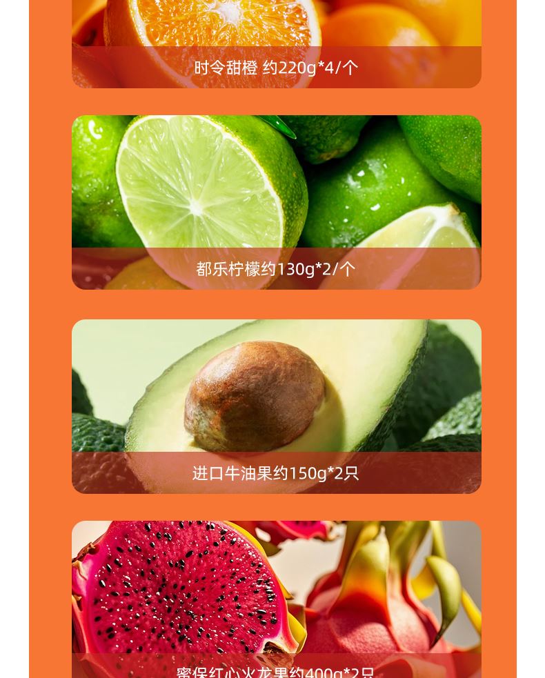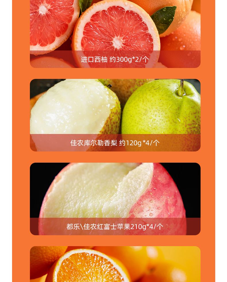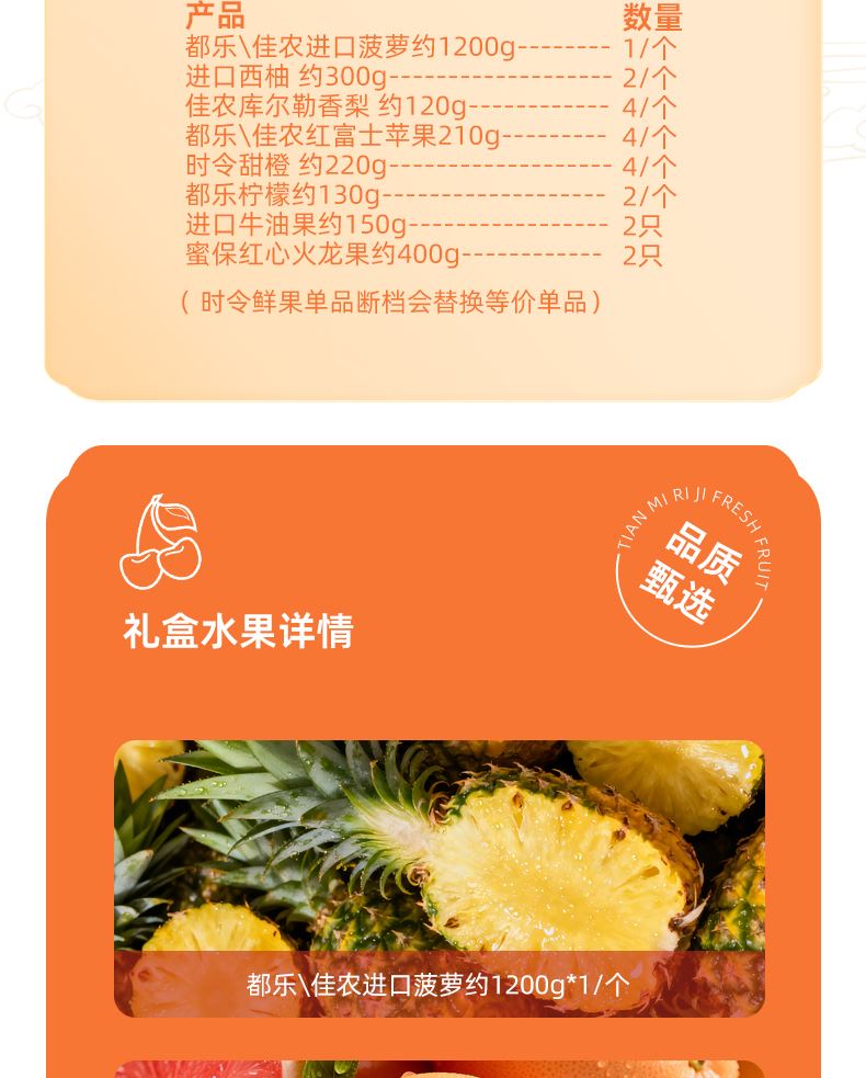 "都乐\佳农进口菠萝约1200g *1/个 进口西柚 约300g*2/个 佳农库尔勒香梨 约120g *4/个 都乐\佳农红富士苹果210g*4/个 时令甜橙 约220g *4/个 都乐柠檬约130g*2/个 进口牛油果约150g*2只 蜜保红心火龙果约400g*2只( 时令鲜果单品断档会替换等价单品)"