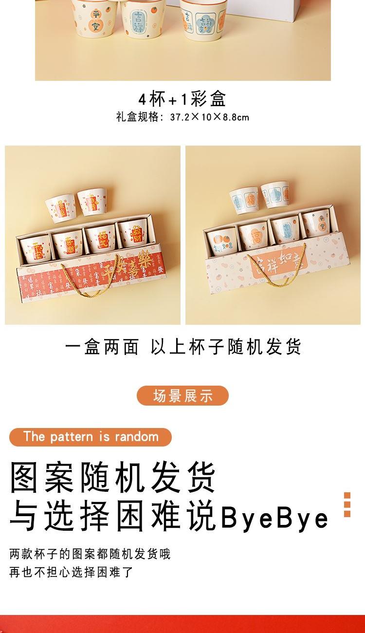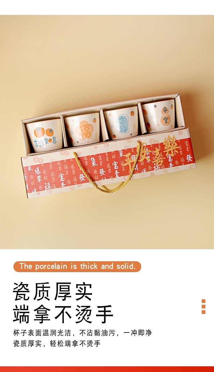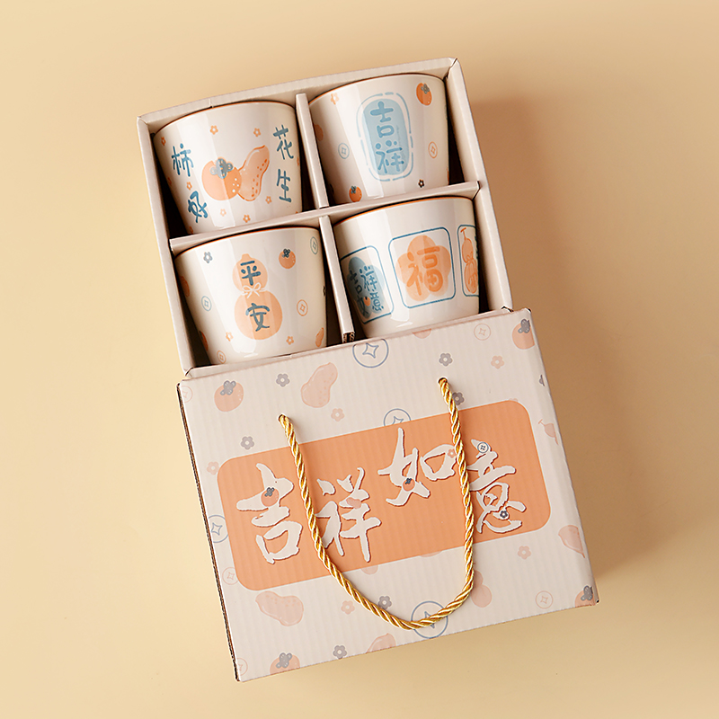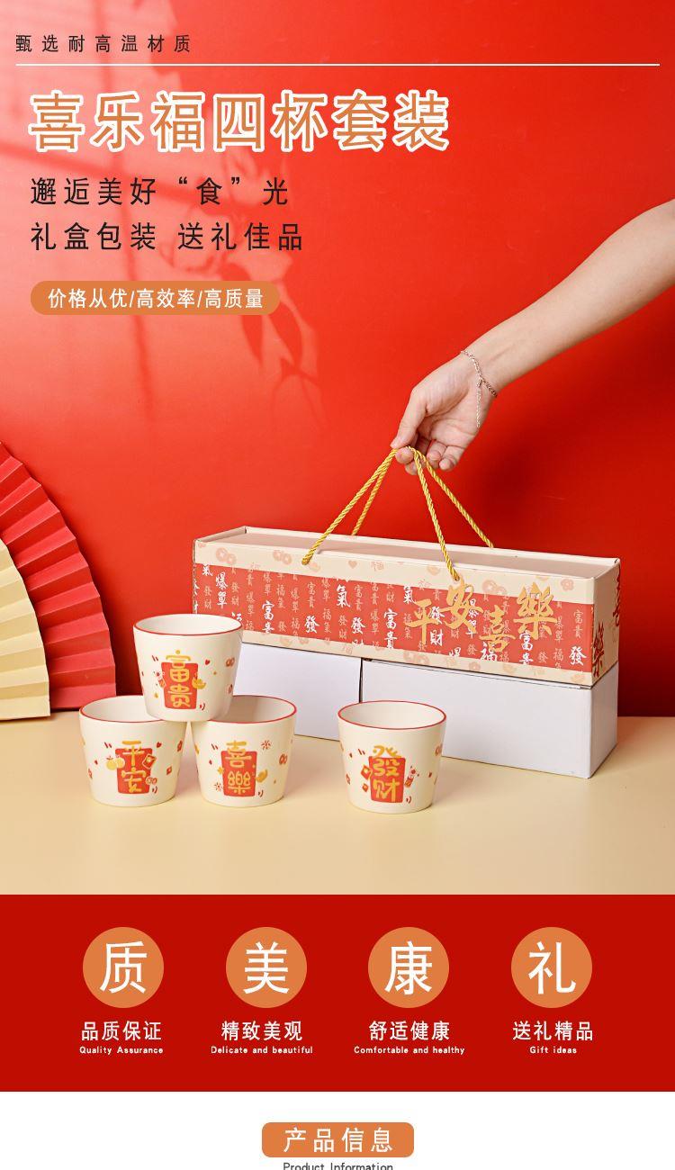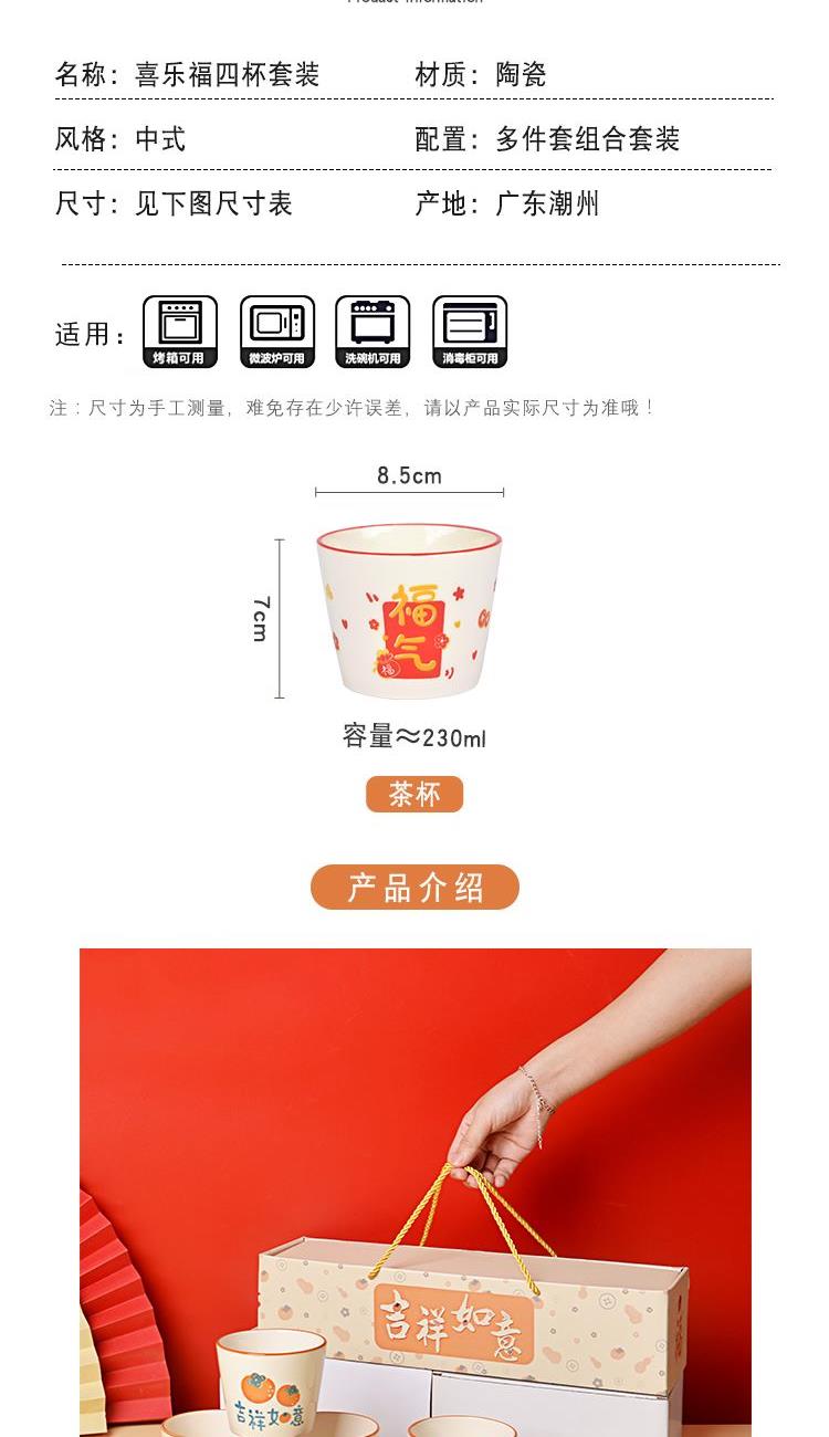 产品组成:整套=4杯+彩盒 产品材质:新骨瓷 产品规格:杯=口径8.5cm,高度7cm,容量230ml; 彩盒尺寸:37.2*10*8.8cm 外箱毛重:24kg 外箱尺寸:61*38.5*46cm -------- ”生活美学搭子”。让每一天,每一刻都自带vibe, 把这套“喜乐福”餐具当礼物再合适不过。细腻瓷质摸得到的踏实,灵动花纹藏着“愿大家常享乐、常伴福”的期许。花纹里的“福”气看得见,用它装着家常菜,连饭菜都多了份温馨。 送长辈是孝心,送手足是心意,让每一次围坐用餐,都是“意满、乐足、福常在”的幸福滋味~轻松拿捏生活里的小确幸,让日子“city感”十足!幸福感直接拉满! 三餐烟火暖,四季皆安然。选意乐福陶瓷,喜乐常伴,福气满满。