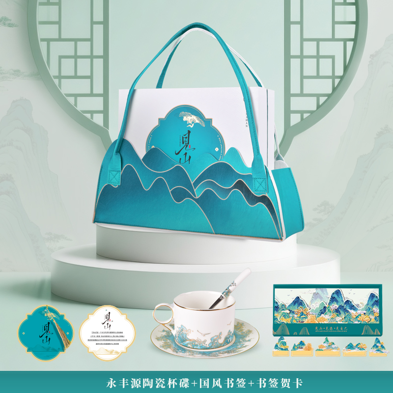 初见山形毛毡包*1 见山礼盒*1 国瓷永丰源陶瓷杯碟三件套*1 五岳文创黄铜书签*1 主题贺卡*1
