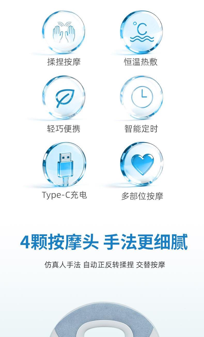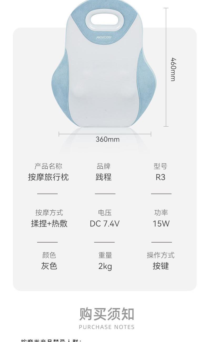 产品:践程 机身材质:麂皮绒 3D网布 供电方式:TYPE-C充电 1800mAh 产品颜色: 灰色 按摩方式:揉捏 热敷 条形码:6952679817271 外箱尺寸:64.5x37.5x47.5cm 产品型号:R3 电源输入:5V 1A 额定功率:12W 按摩时间:15分钟 控制方式:三按键操作 产品净重:2kg 产品尺寸:36*11*37cm 彩盒尺寸:37*12.5*47cm