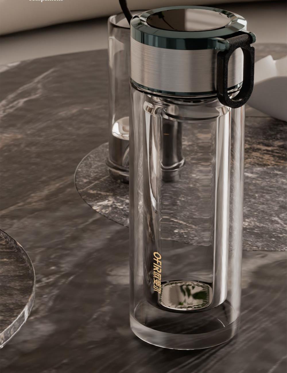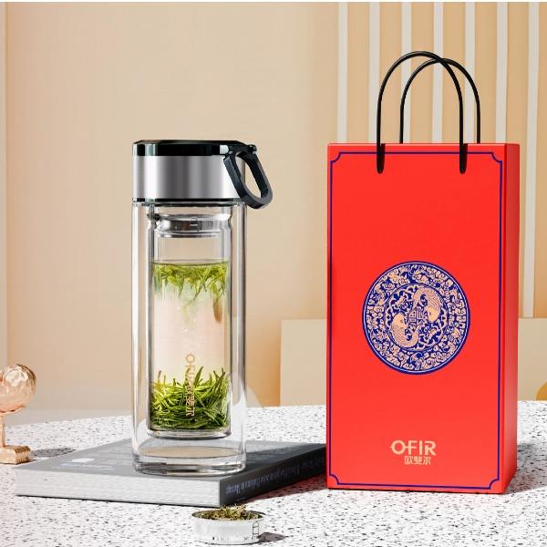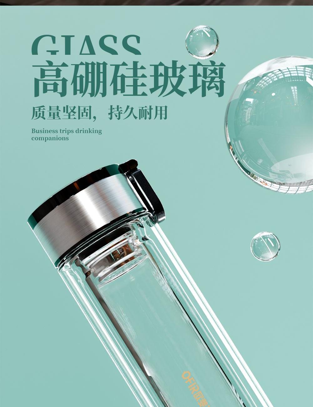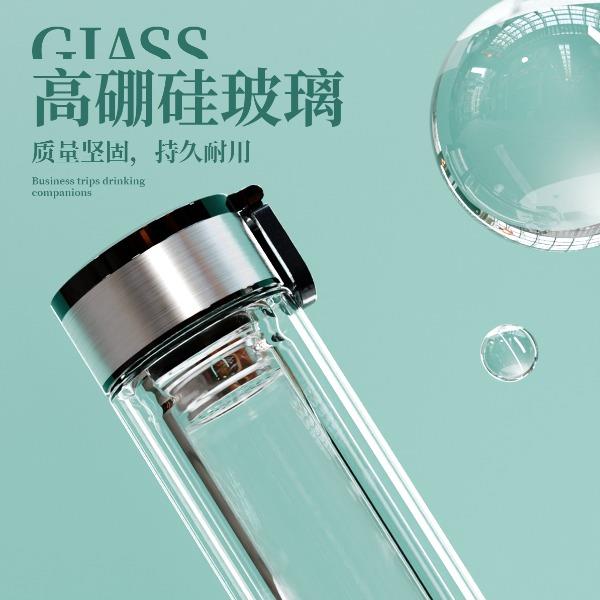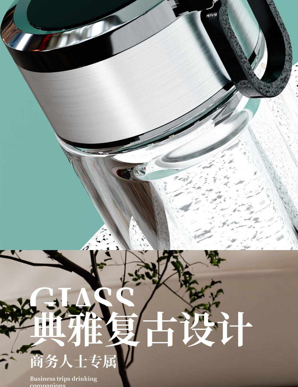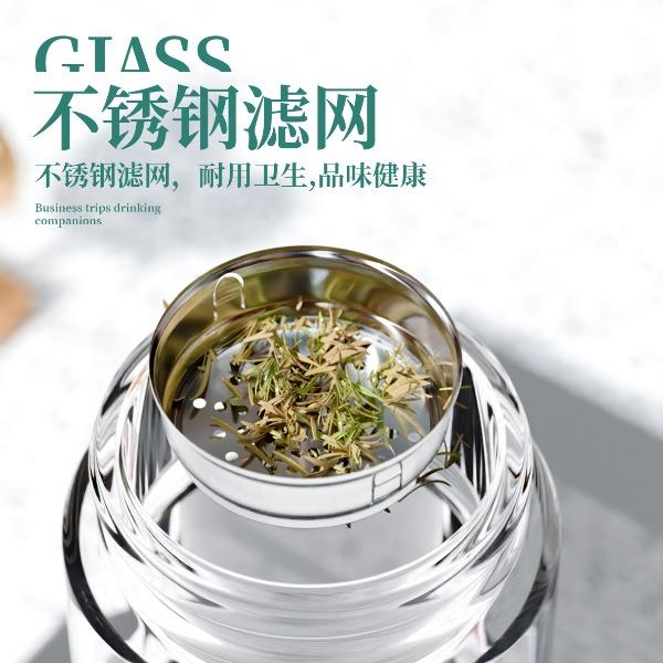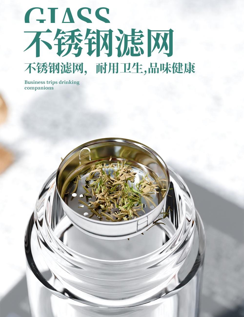 · 材 质 : 高硼硅玻璃 · 塑 料 件:PP(食品接触用);密封圈:硅胶(食品接触用) · 容 量: 320ML · 礼盒尺寸:27.7*11*8.1CM · 外箱尺寸:57*42.5*29.5CM · 毛重(带礼盒):320g 卖点: · 不锈钢杯盖,金属质感强,耐磨、耐划。 · 采用双层高硼硅高透明玻璃构造,高温烧制而成,晶莹剔透。 · 底部加厚处理,高温烧底经久耐磨。 · 提手设计方便随身携带。 · 精选304不锈钢茶漏,轻松过滤茶渣,饮茶体验舒适。