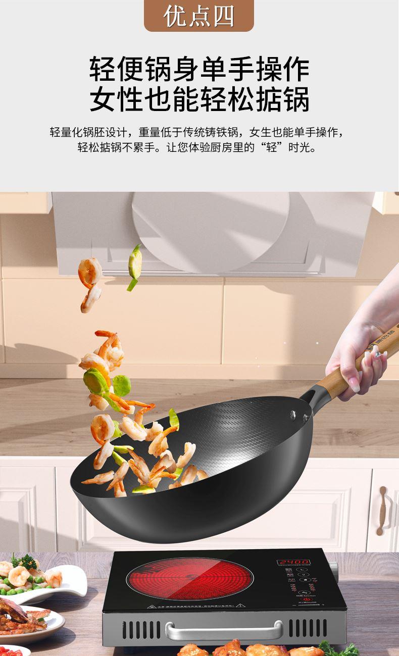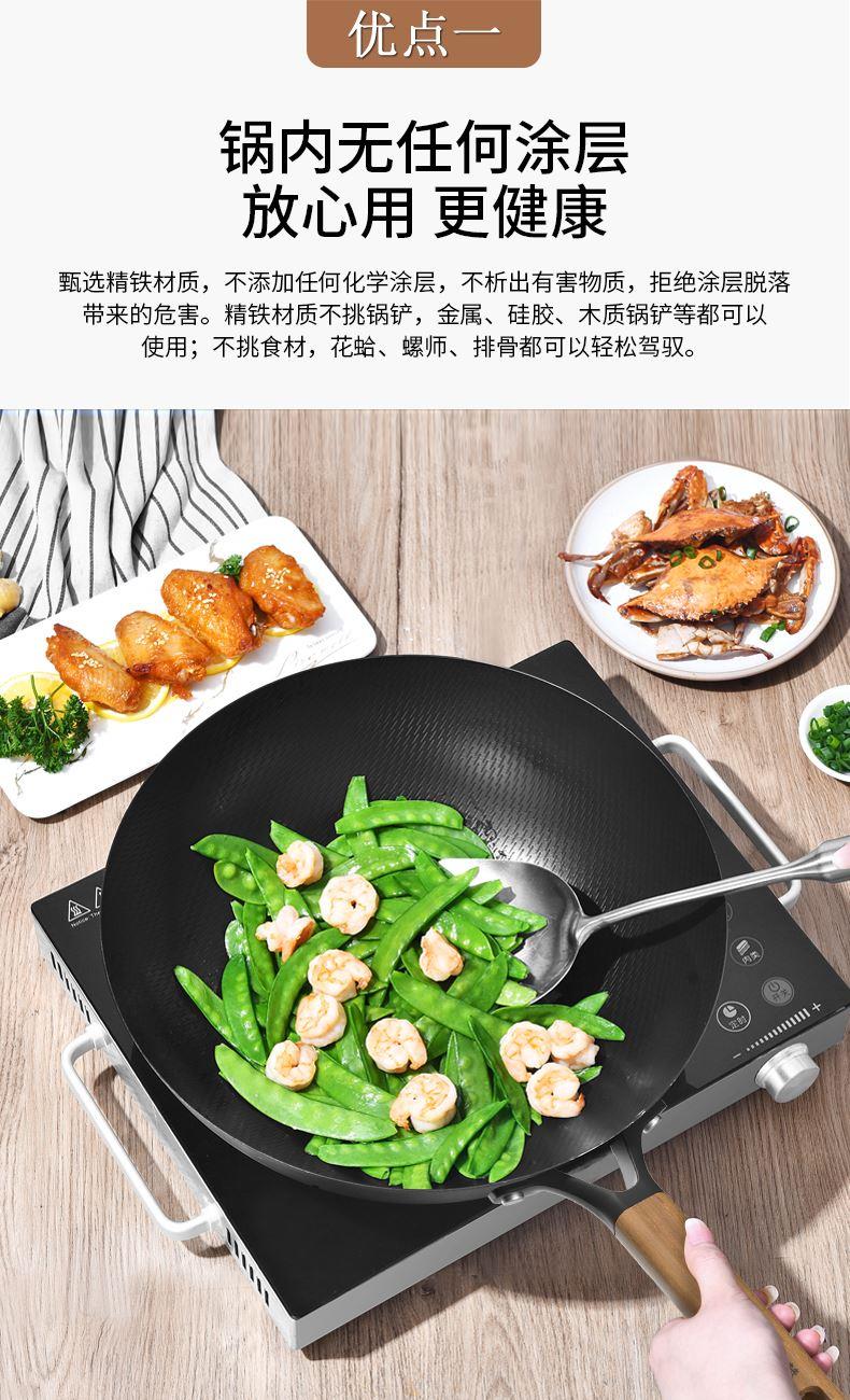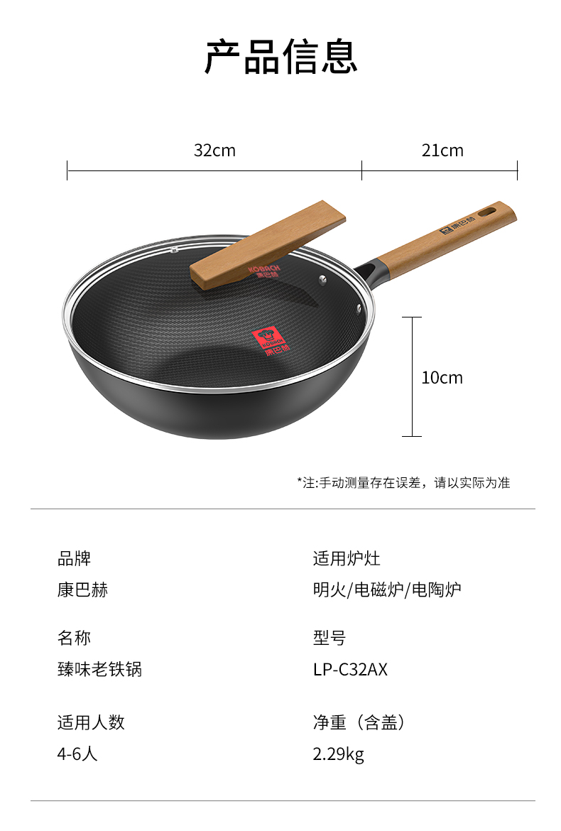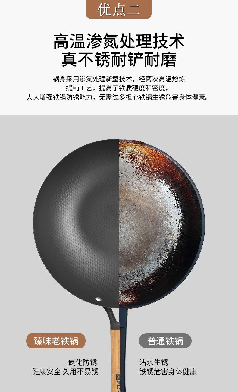规格:32cm 重量:2.6kg 包装尺寸:54.5*36*79.8cm ◎甄选精铁材质,不添加任何化学涂层,不析出有害物质,没有涂层脱落风险,安心每一餐。 ◎高温氮化工艺耐磨耐锈不惧钢铲:锅身采用渗氮处理新型技术,提高了铁质硬度和密度,大大增强铁锅防锈能力,无需过多担心铁锅生锈危害身体健康。 ◎铁锅在正确开锅后,铁锅表面会形成油膜,越用越不粘,使用更健康,炒菜地道有锅气。 ◎轻量化锅胚设计,重量低于传统铁锅,女生也能单手颠锅,轻盈精铁锅体,轻松烹饪。 ◎底部加大螺旋纹设计烹饪防滑不侧翻:锅外底螺纹升级加长,可避免锅底放置不稳,燃气灶爆炒不滑锅,更得心应手。 ◎可视钢化玻璃盖烹饪进程掌握:锅盖采用钢化玻璃加不锈钢的组合,方便实时观察烹饪进程,更有平衡气压的排气孔,让焖煮更入味。