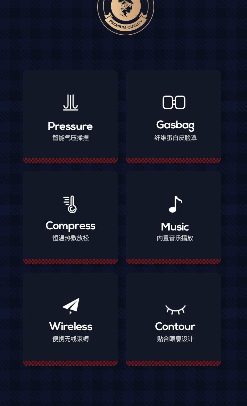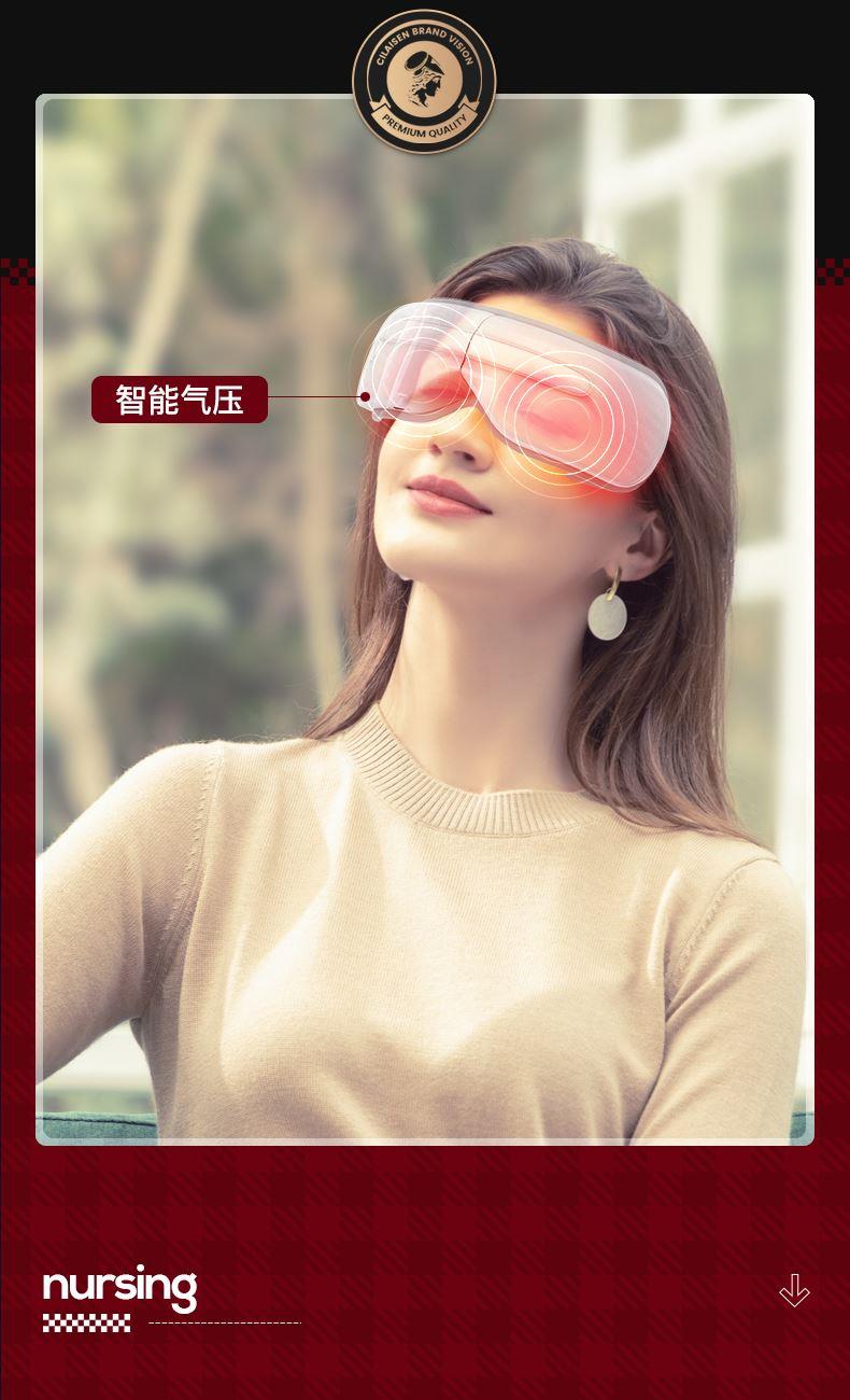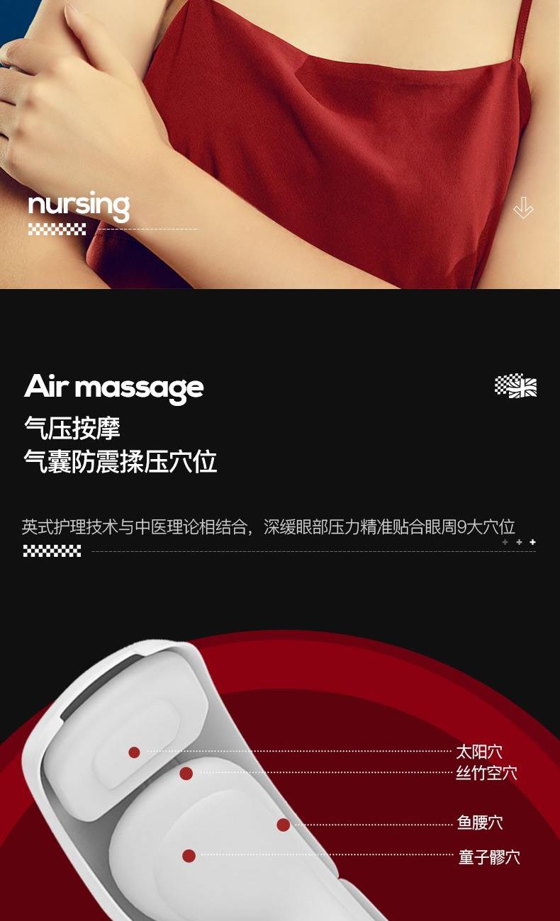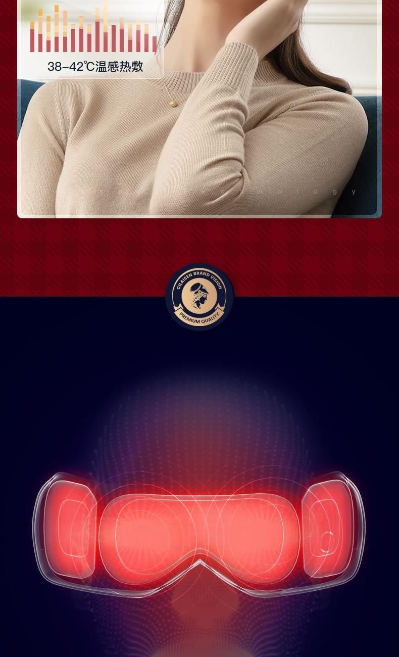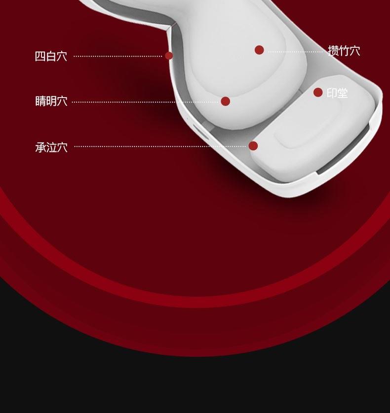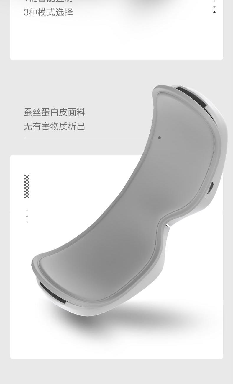 商品条码 : 6972831860051 产品尺寸 : 235X80X95mm 包装尺寸:213X170X92mm 产品毛重 : 640g 包装清单:主机X1、说明书X1、充电线X1、收纳袋X1、视力卡X1 核心卖点: 1、气压按摩,可通过气囊揉压穴位 2、一键手感开关键,10分钟定时工作 3、三种模式选择,并可享受静心音乐 4、蚕丝蛋白皮面料,人体工程 学鼻梁弧形设计 5、Type-C充电,180度折叠设计,方便携带 6、38-42度热敷功能,促进血液循环