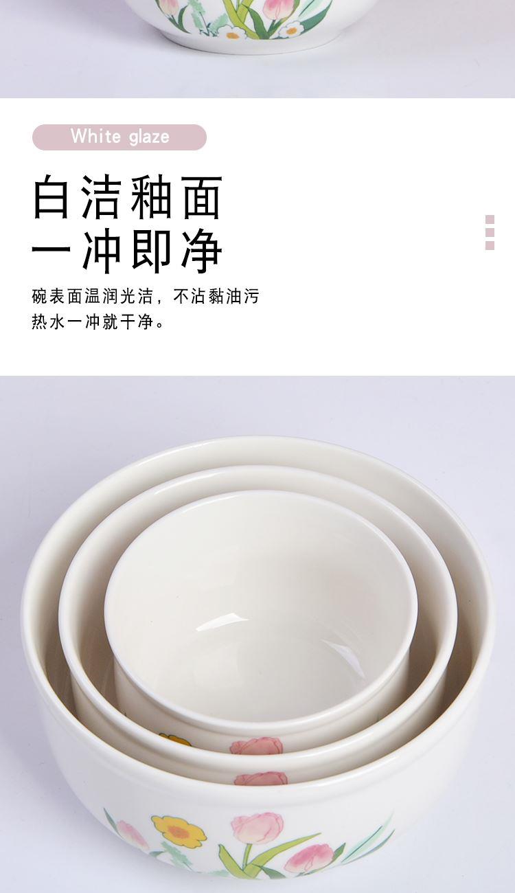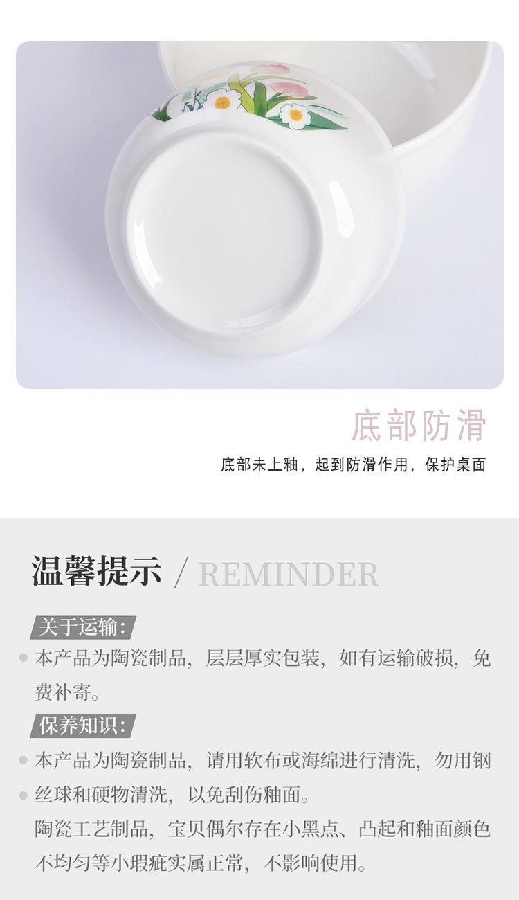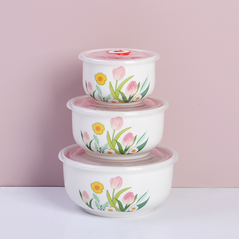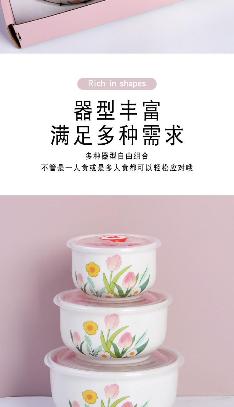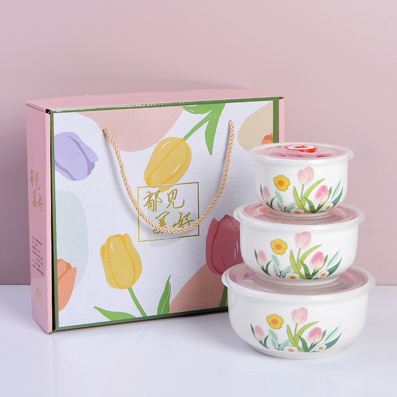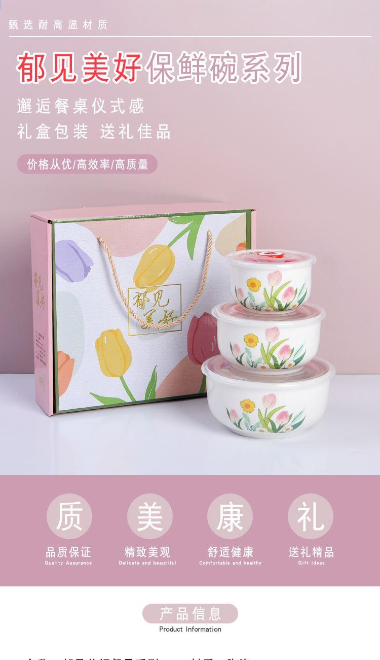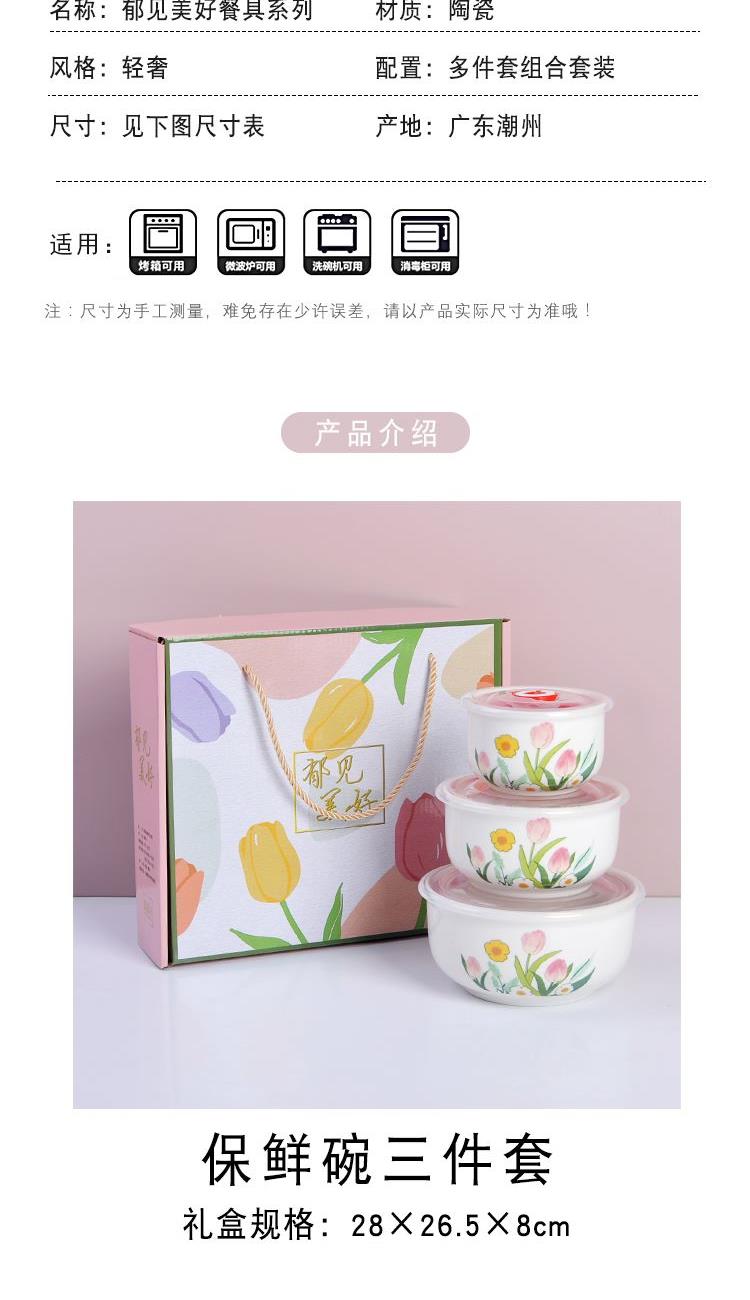 瑾明礼-郁见美好-陶瓷保鲜碗三件套 - 产品组成:整套=大中小陶瓷碗+保鲜盖+彩盒 产品材质:强化瓷 产品规格:大号碗=口径15cm,高7.5cm;中号碗=口径12.5cm,高6.5cm;小号碗=口径9.5cm,高6cm 彩盒尺寸:28×26.5×8cm 外箱毛重:26kg 外箱尺寸:58×43×53cm - 郁金香陶瓷餐具,它包含了很多美丽的花和植物图案,让您在享用美食的同时,也能感受到大自然的美好 💕。这款餐具适合每个年龄段的人适用,赠礼优选。