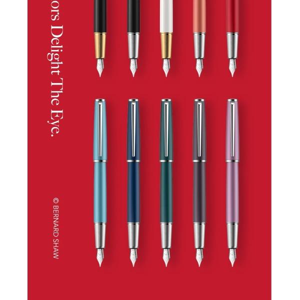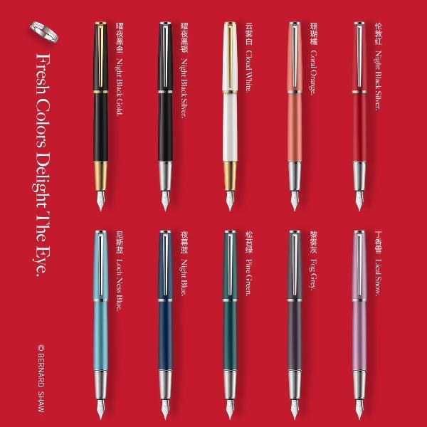 墨水笔类型:螺纹上墨式 墨水笔重量:墨水/宝珠笔31g/35g 颜色分类:曜夜黑金曜夜黑银黎雾灰松苔绿夜幕蓝伦敦红珊瑚橘丁香紫尼斯蓝云雾白 书写粗细:F尖 套餐类型:官方标配 包装方式:鸿运墨水笔记本礼盒装 适用场景:送礼书写 钢笔笔尖成分:不锈钢 笔尖种类:标准型 适用人群:文艺青年 上墨方式:旋转吸墨 笔杆材质:金属笔尖 嵌入方式:明尖 笔身纹理:磨砂 墨水材质:非碳素墨水