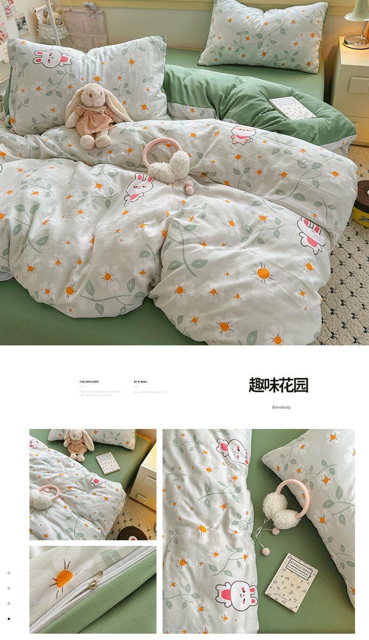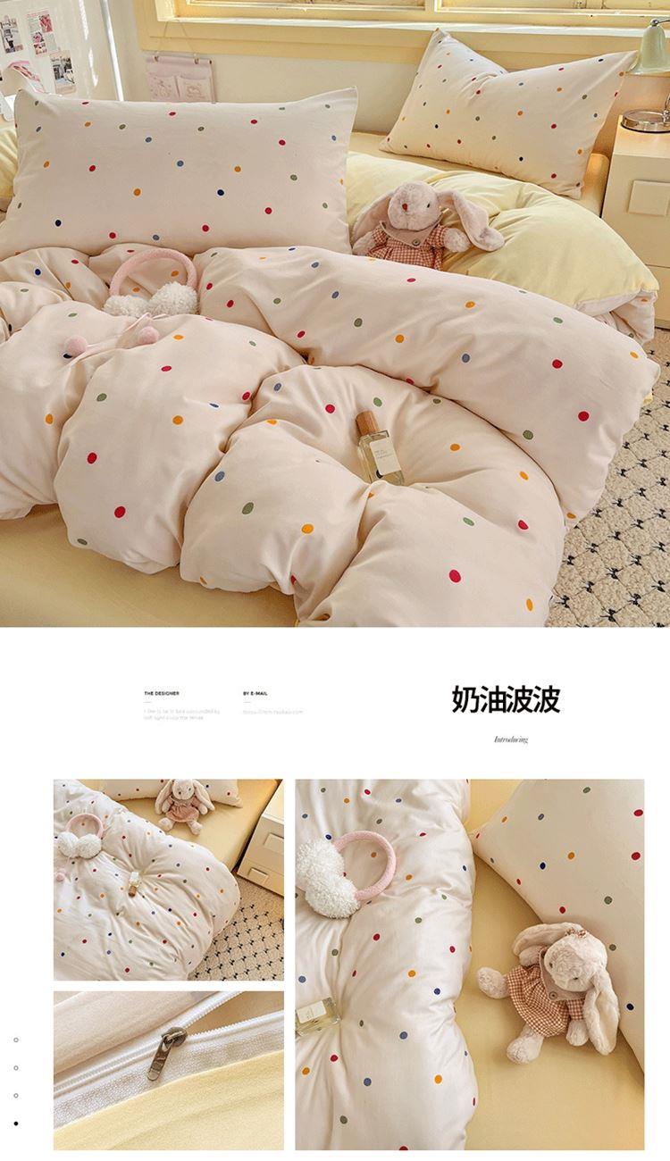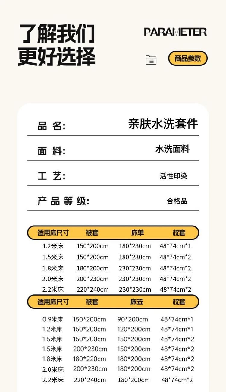 1:甄选绵软水洗棉面料 舒适柔软莹润宠溺你的肌肤 触感细腻 感知好睡眠 2:让睡眠更柔软,绵软透气 如坠云端般睡感 3:撞色搭配设计 层次感丰富有趣 打破单调有颜有范儿 包揽美梦时光 尺寸:被套200*230cm*1 床单:230*230cm*1 枕套:48*74cm*2 包装:彩盒 面料:亲柔棉