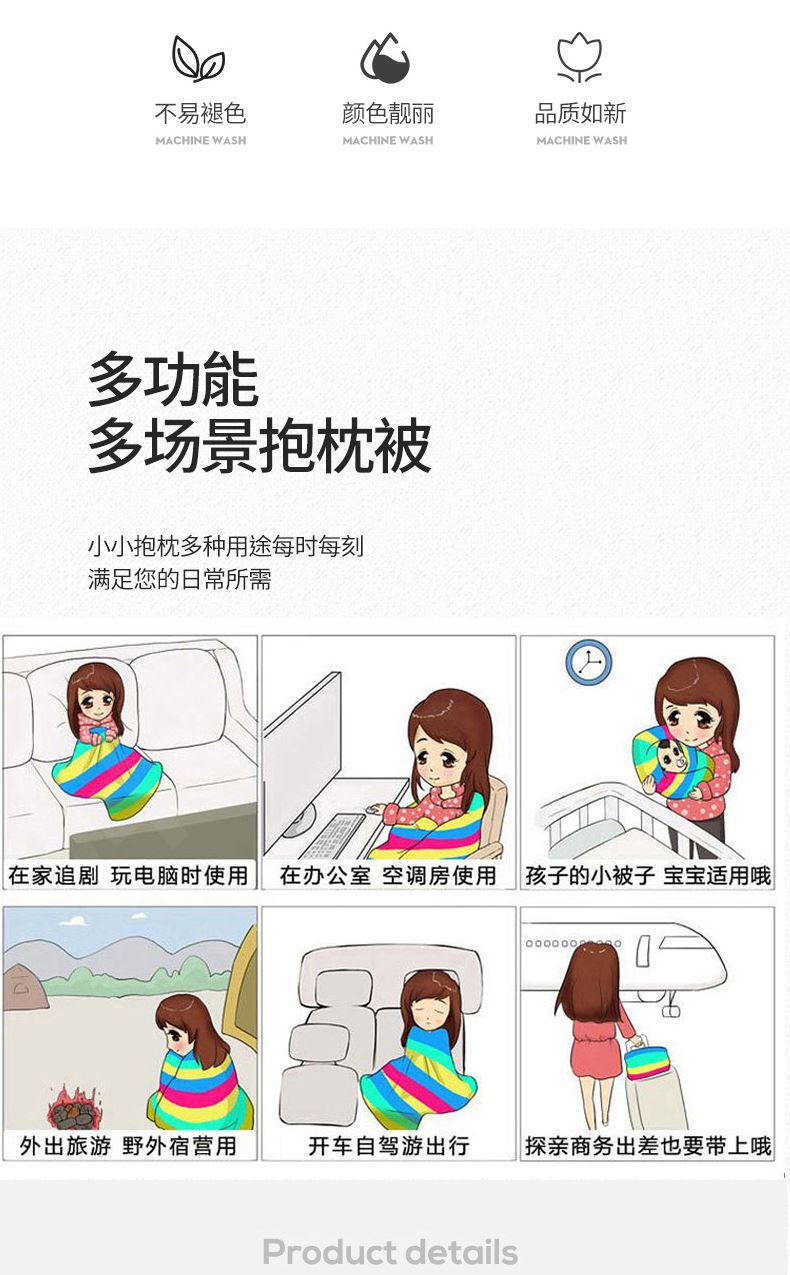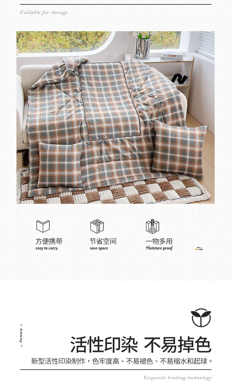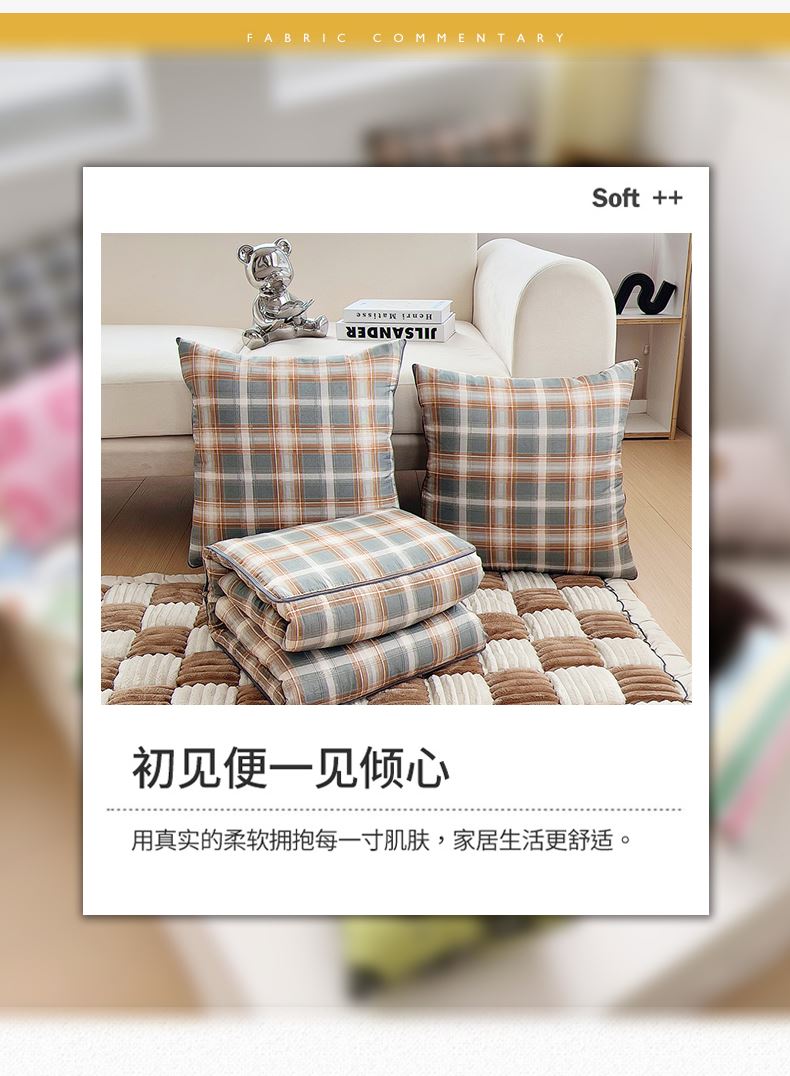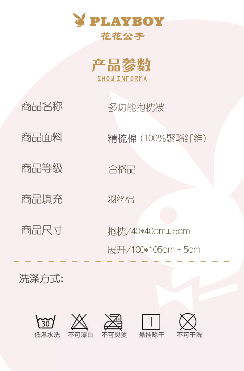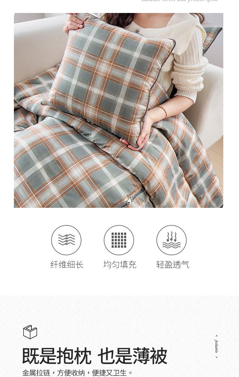 规格:40*40cm±5cm 展开:100*105cm±5cm 面料:精梳棉 填充: 羽丝棉 执行标准:GB/T22796-2021 安全类别:GB18401-2010 B类 1.采用精梳棉面料,颜色鲜艳、丰富、美观大方,手感光滑流畅,洗涤后不收缩。 2.填充环保羽丝纤维,轻薄透气,简约而不简单,适合贴身覆盖, 3.抱枕被方便收纳,折叠后可作为家居抱枕。
