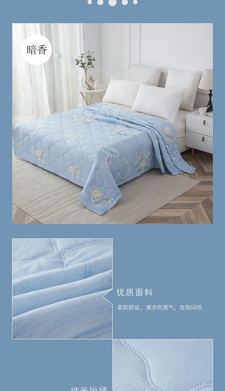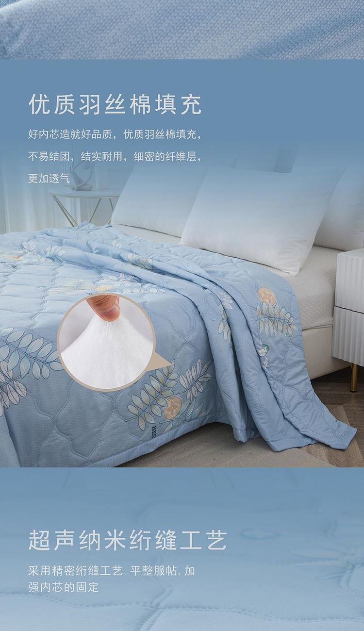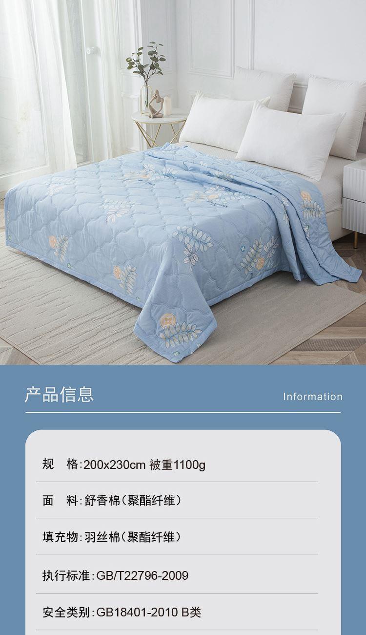 200×230cm 被重:1100g 【面 料】舒香棉(聚酯纤维) 【填充物】羽丝棉(聚酯纤维) 1、面料柔软亲肤,花型清爽,环保印染; 2、填充优质羽丝纤维,轻薄蓬松,用后不板结; 3、超声纳米绗缝工艺,固定填充不跑棉; 4、多用途,易清洗,便于收纳。