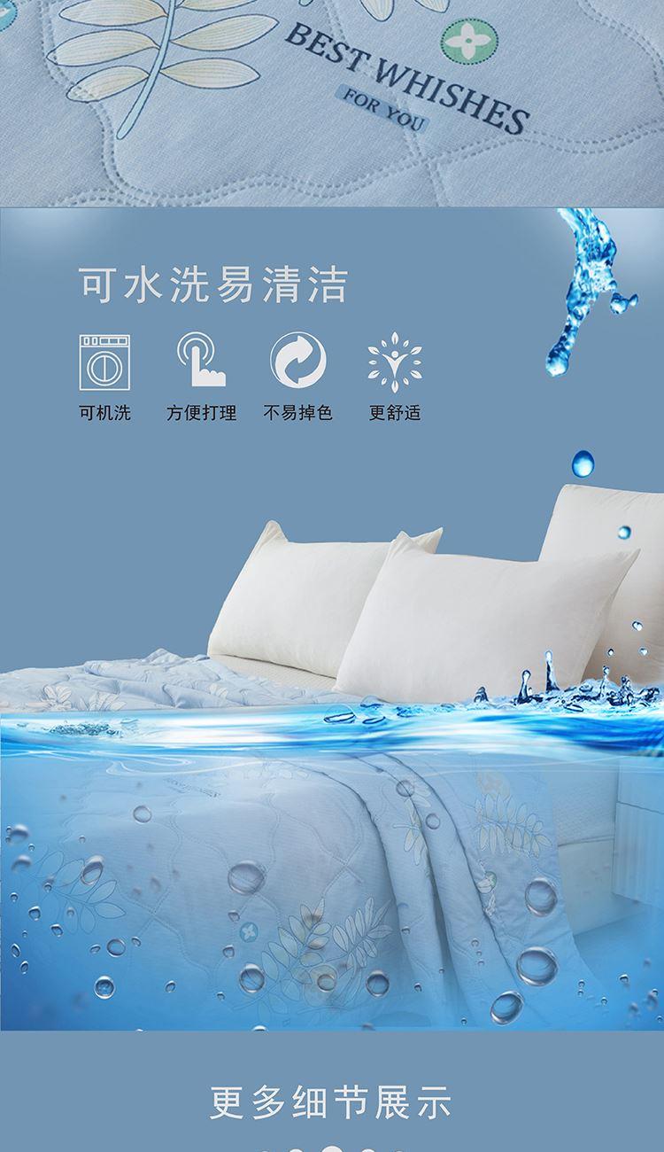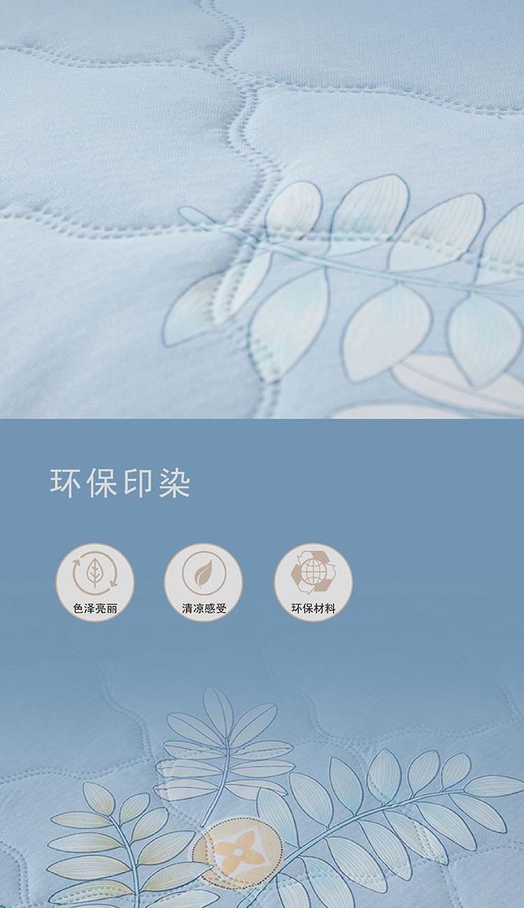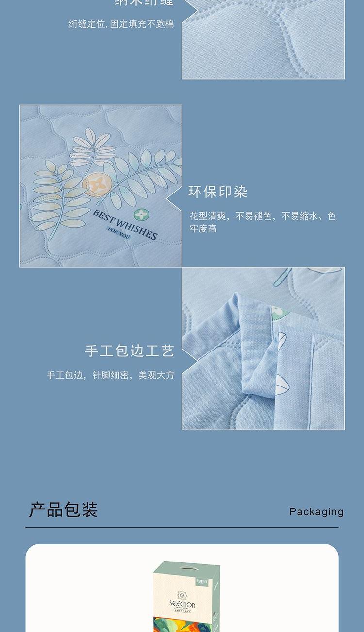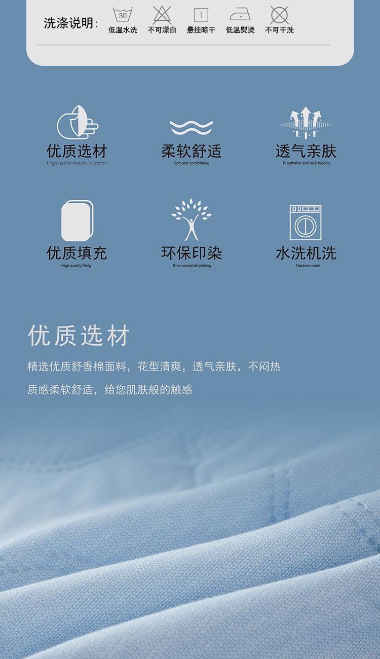 200×230cm 被重:1100g 【面 料】舒香棉(聚酯纤维) 【填充物】羽丝棉(聚酯纤维) 1、面料柔软亲肤,花型清爽,环保印染; 2、填充优质羽丝纤维,轻薄蓬松,用后不板结; 3、超声纳米绗缝工艺,固定填充不跑棉; 4、多用途,易清洗,便于收纳。