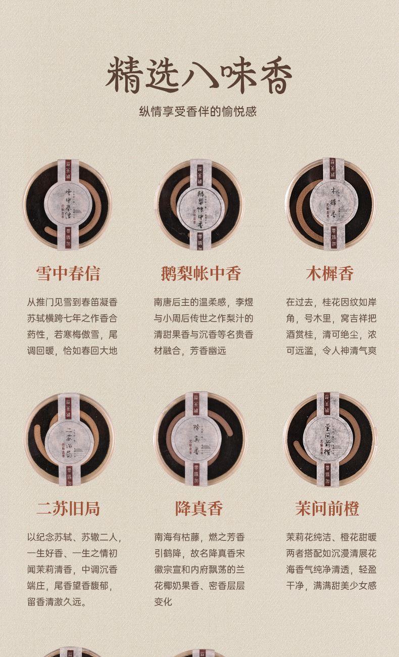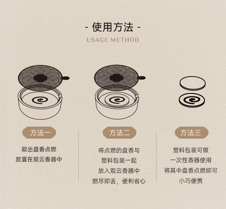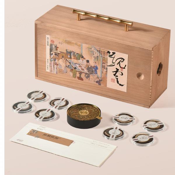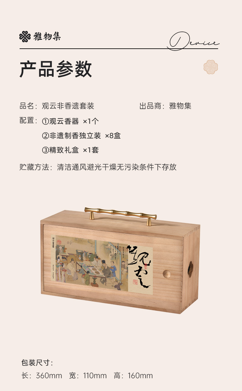 配置 · ① 观云·盘香器×1套 ② 中式盘香·独立装×8盘 ③ 竹枝提梁木匣×1套