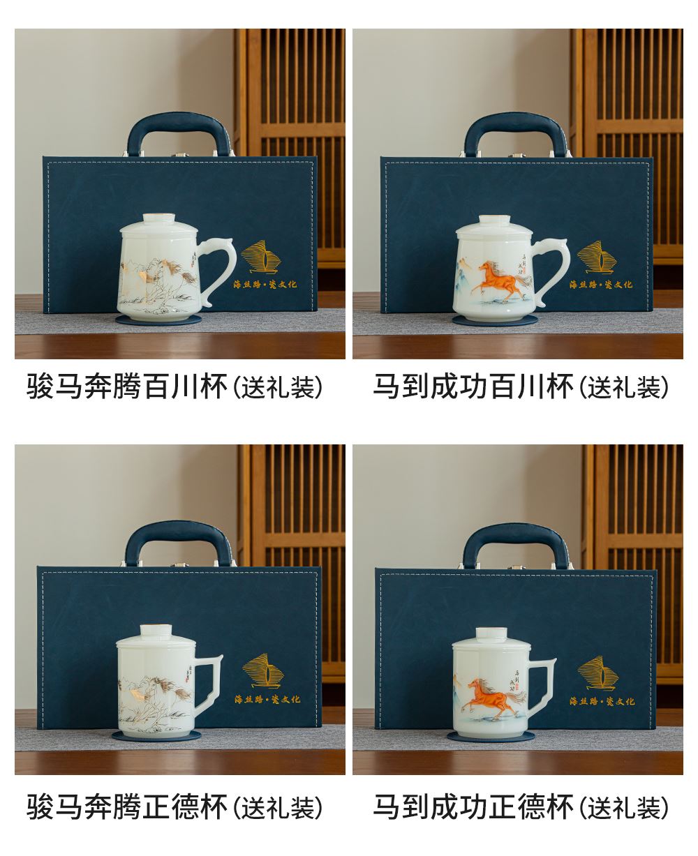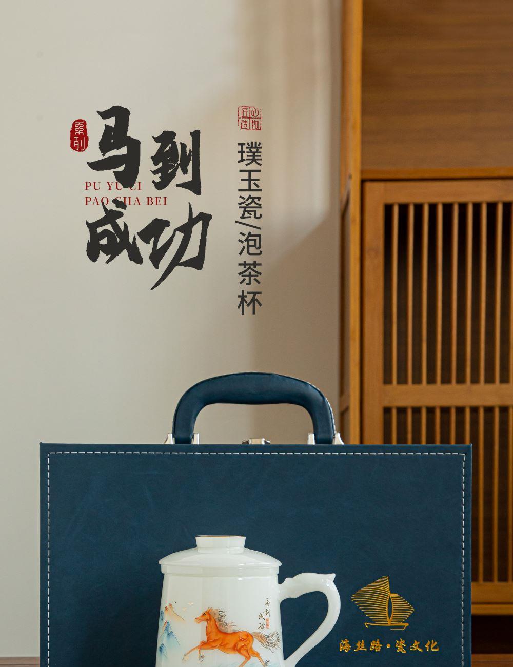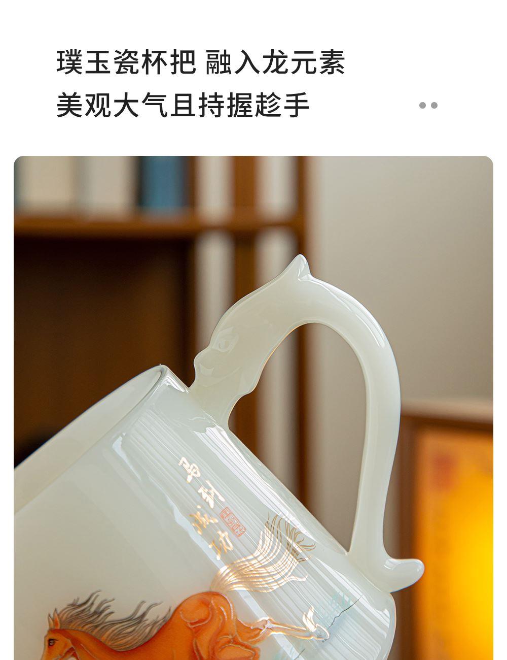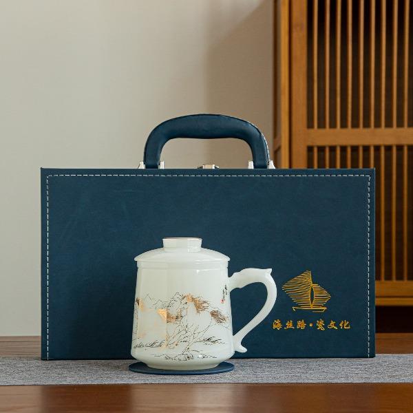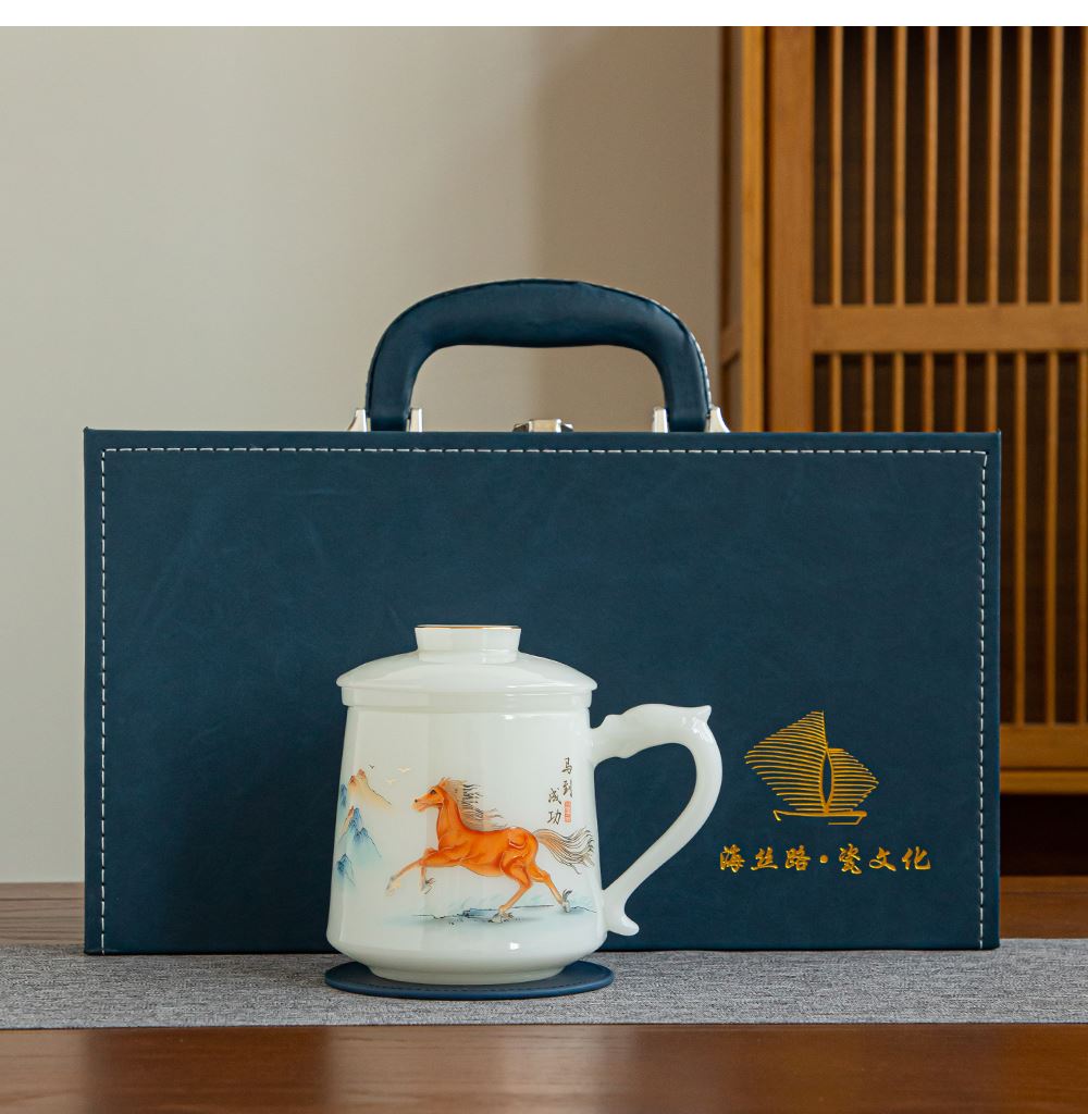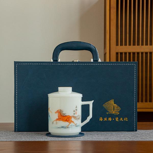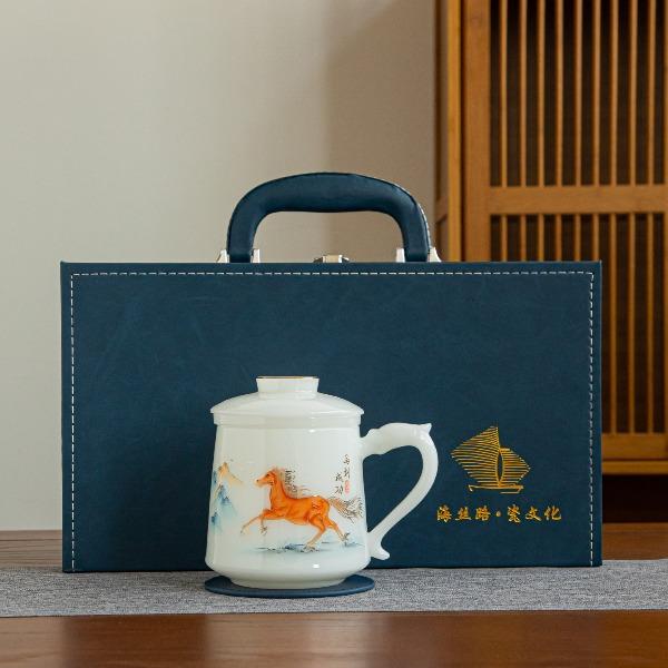 尾桥下窑冰种璞玉马到成功陶瓷三件套办公杯套装节日会议礼品