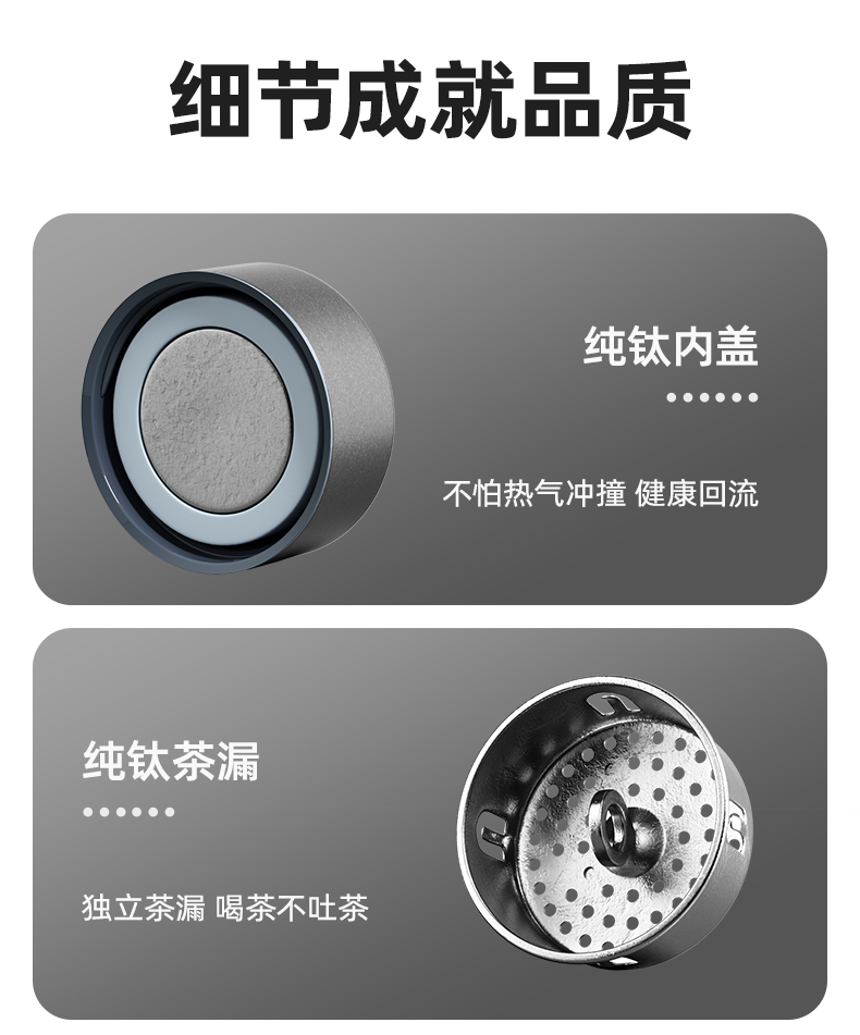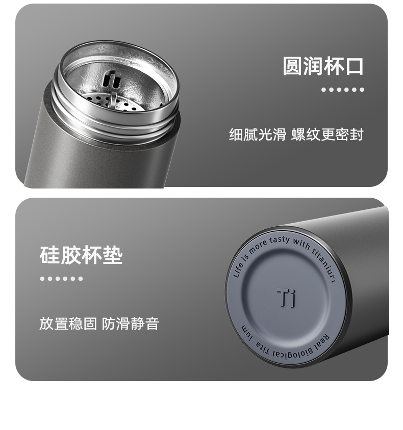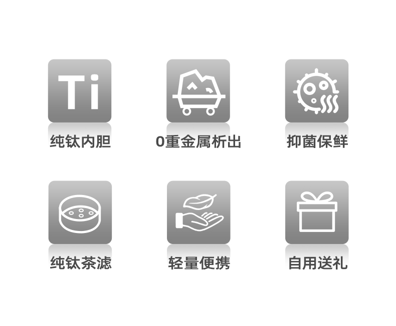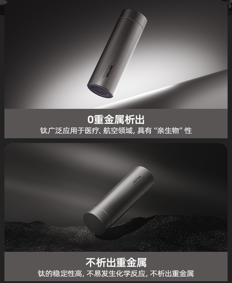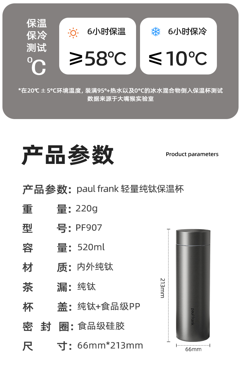 产品型号:PF907 产品容量:520ML 颜 色:灰色 产品材质:纯钛 产品尺寸:66mm*66mm*213mm 彩盒尺寸:9*9*23.7cm