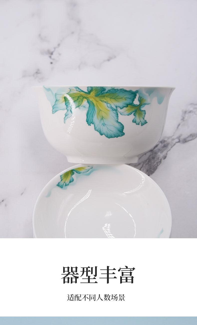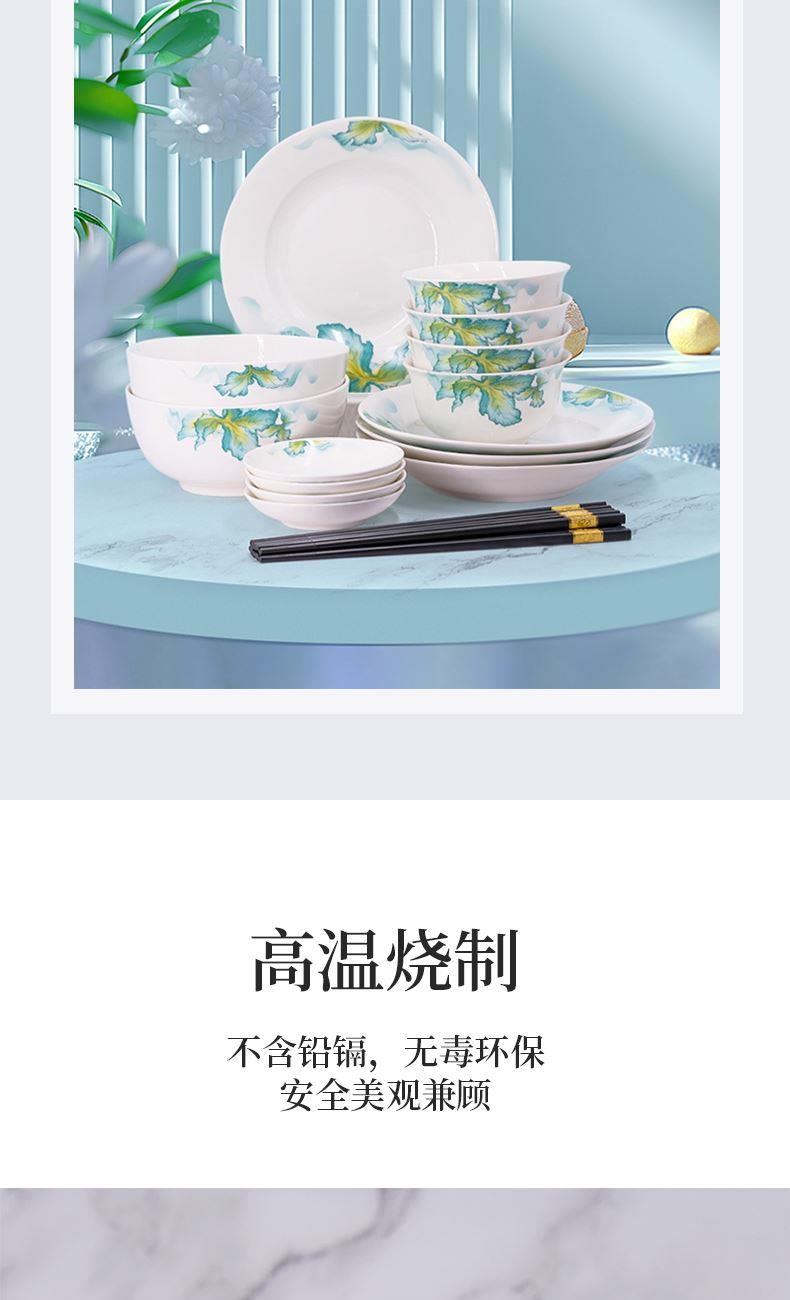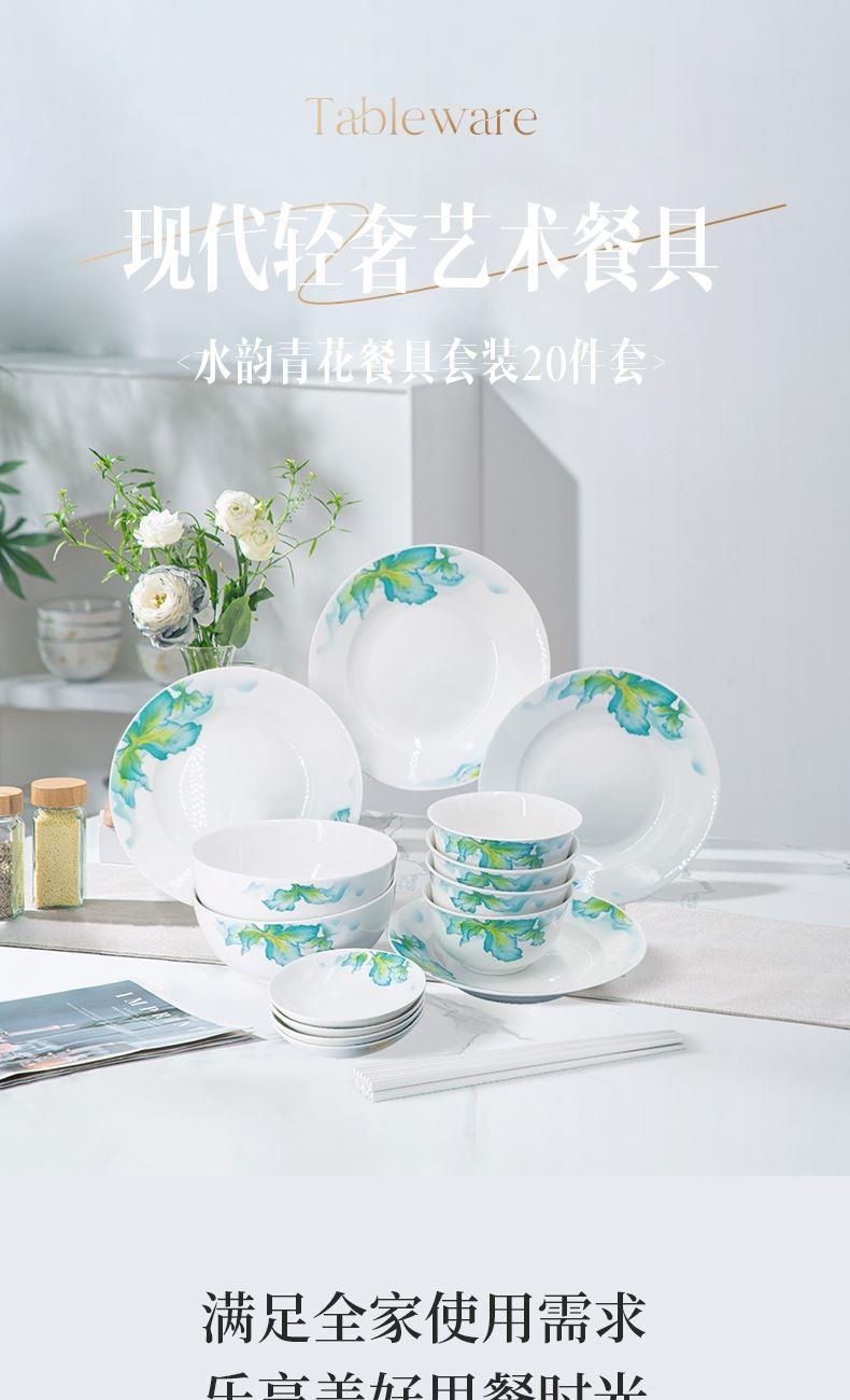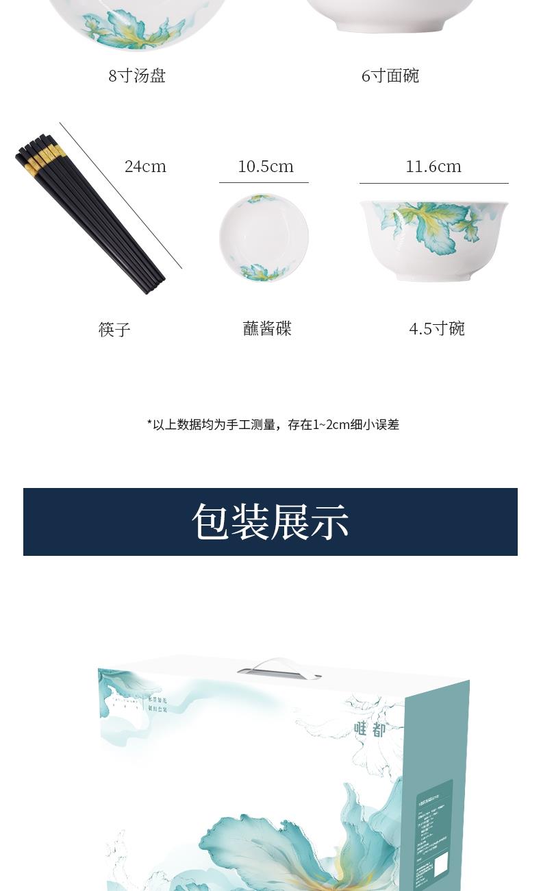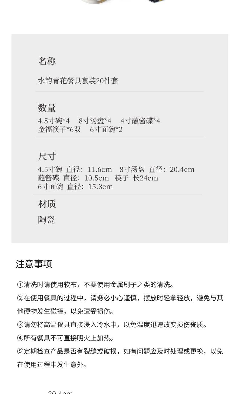 4.5寸碗*4 8寸汤盘*4 4寸蘸酱碟*4 筷子*6双 6寸面碗*2 历经1300度高温烧制,使用更健康。釉面润泽光亮,易清洗。新中式风格,器型美观典雅, 花纸采用绚丽多彩的青花设计, 寓意家庭幸福,事业昌盛的美好愿景