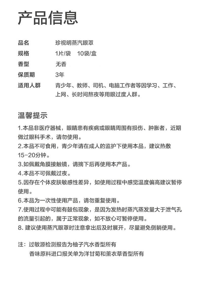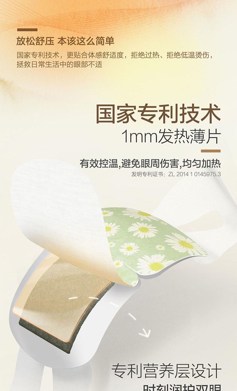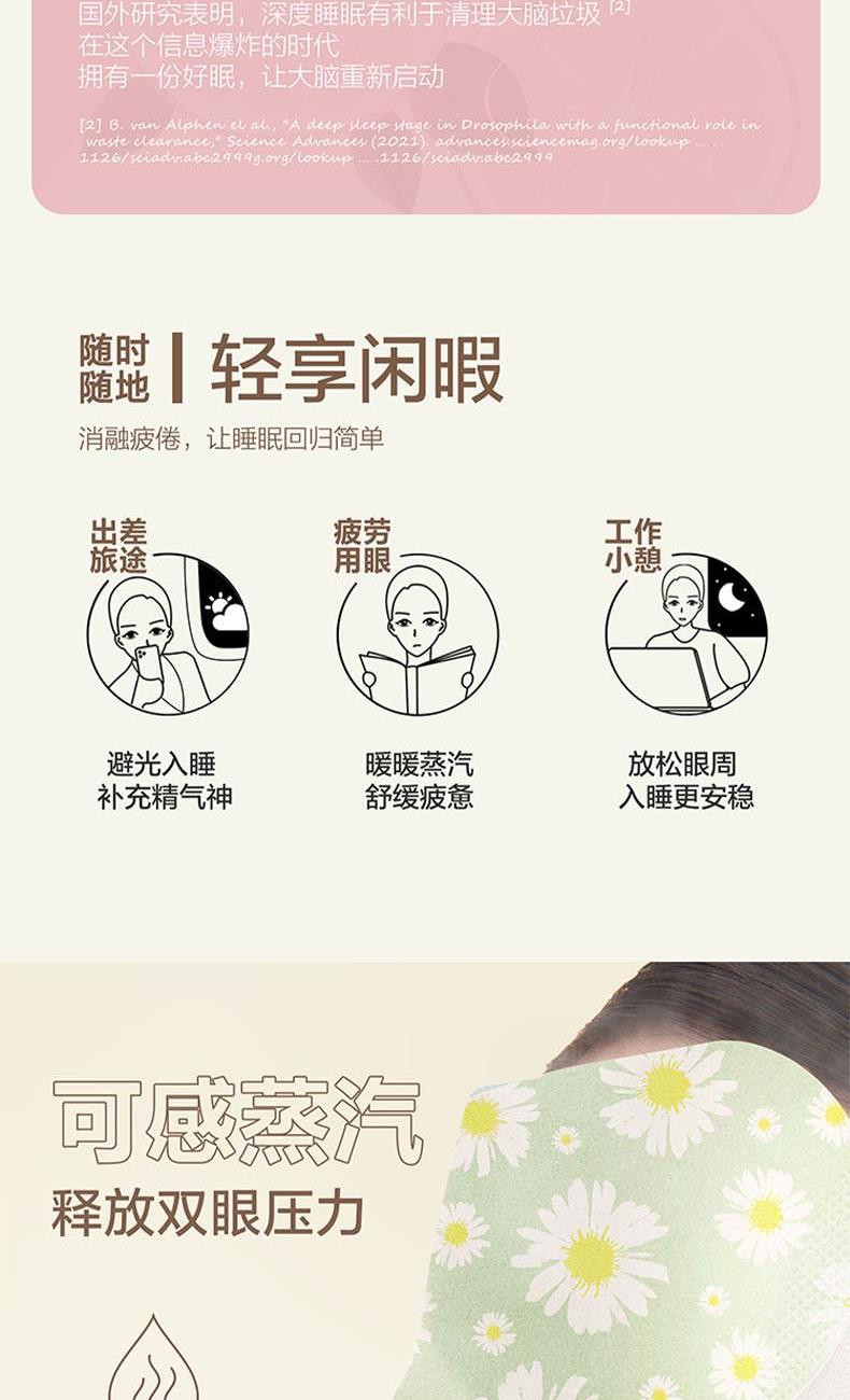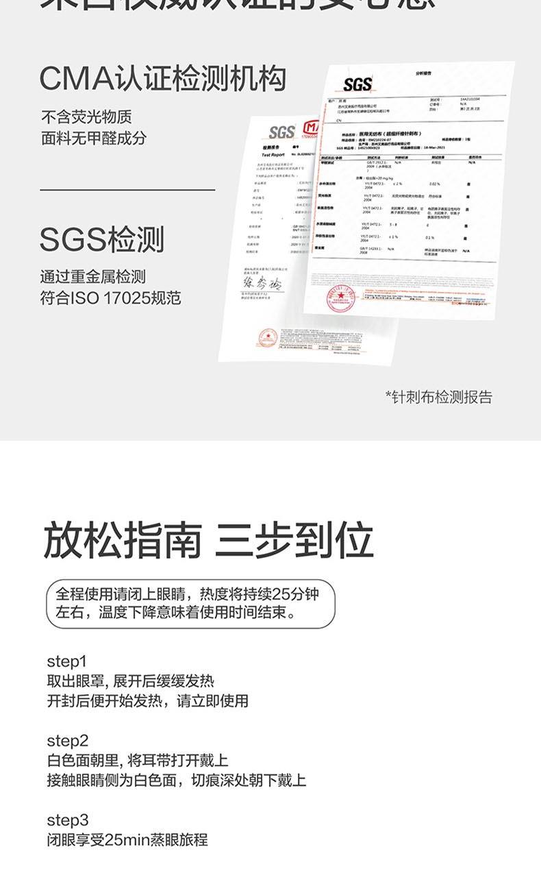 规格:1片/袋 10袋/盒 香型:无香 保质质:3年 1.可感绵密蒸汽,释放眼部压力。 2.持续20分钟以上有效控温,稳定升温不灼热,营养层添加SOD超氧化物歧化酶、透明质酸等营养物质,温润眼周肌肤。 3.添加天然萃取精油,多种香型可选,重构你的睡眠想象。 4.小云朵棉质面料、弱弹力耳挂、贴合工艺设计,呵护眼周脆弱肌肤,静享舒适体验。