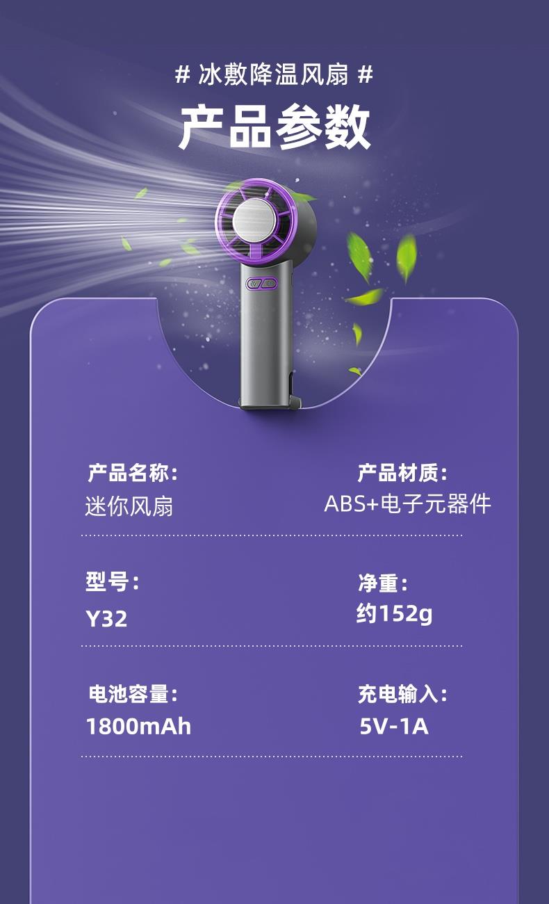 迷你风扇 型号:Y32 电池容量:1800mAh 输入:5V-1A 使用时间:约1-3h 产品材质:ABS+电子元器件 产品尺寸:178*60*56mm 产品重量:约152g 身材小巧,一手盈握,风力强劲,小巧便携,可持可立,清风随行,轻音运转。