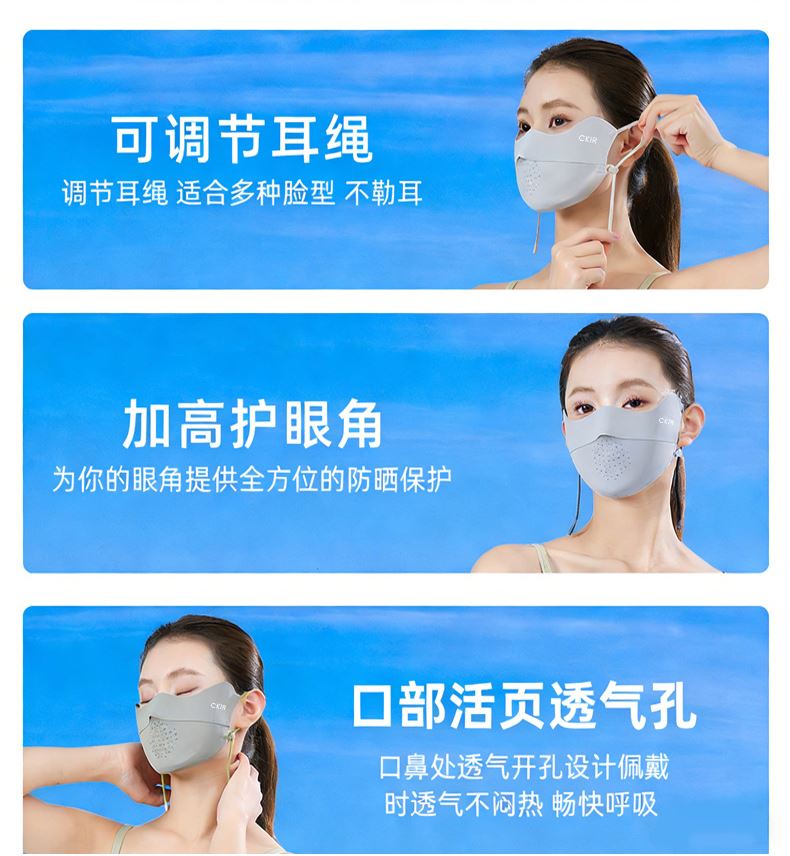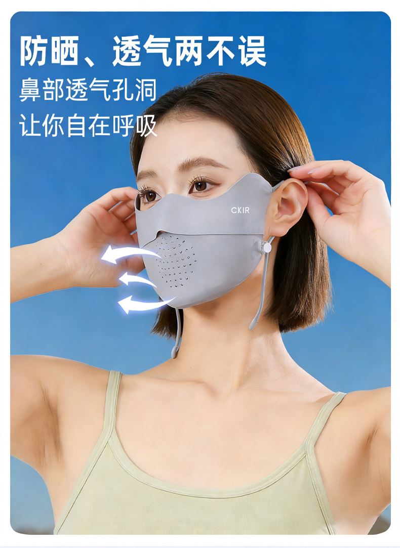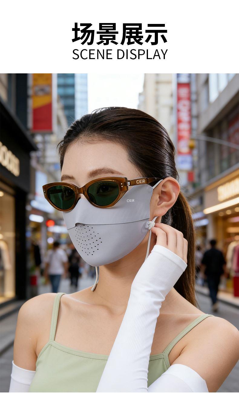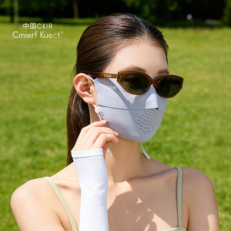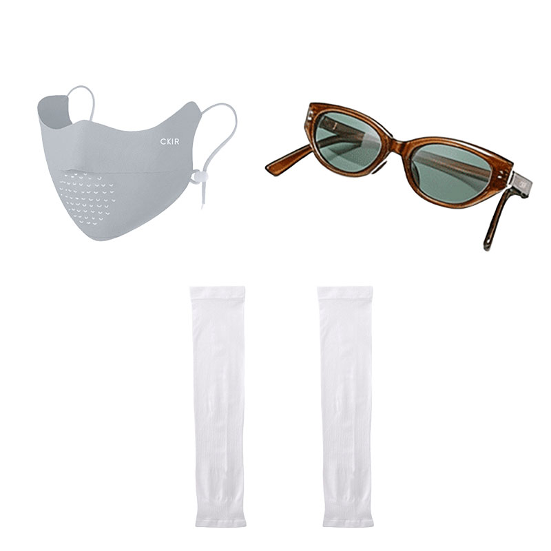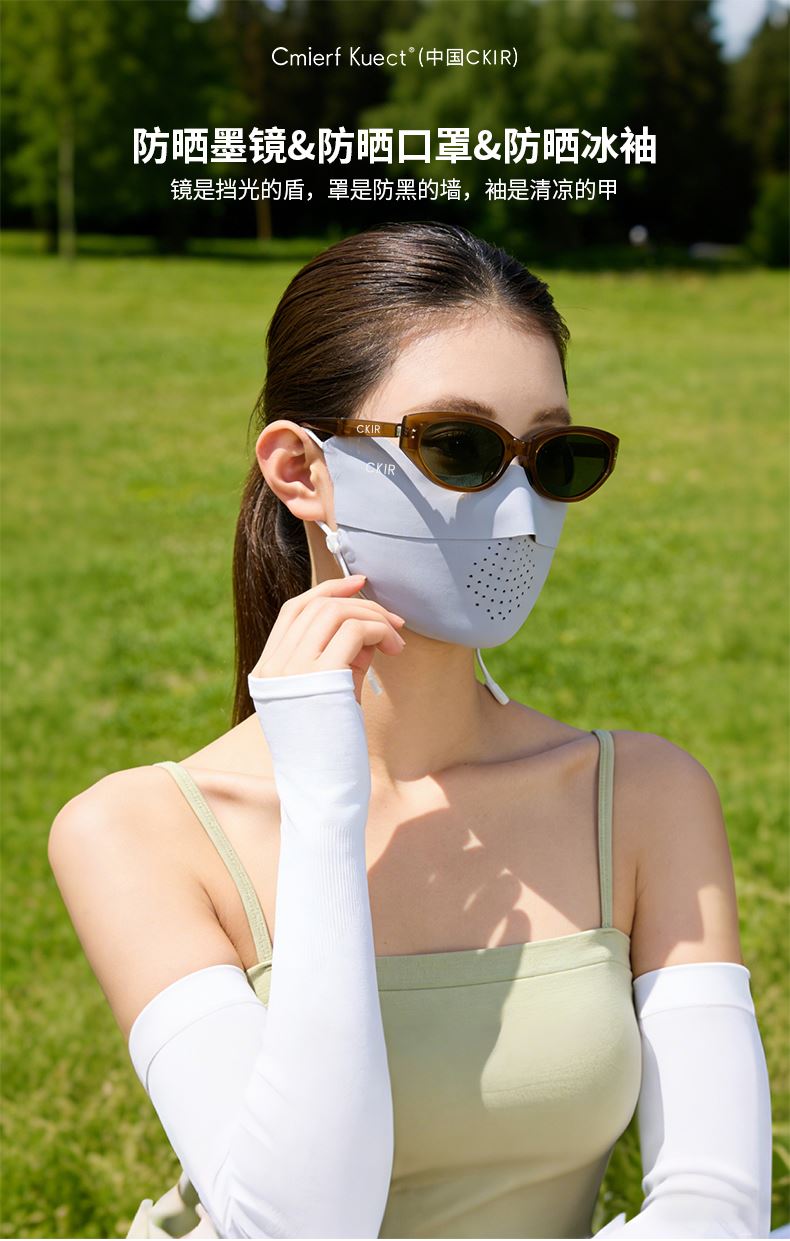 口罩与冰袖均达到 **UPF50+** 高倍防晒标准,墨镜配备 UV400 防紫外线镜片,能阻隔 99% 以上紫外线,避免晒黑、光老化