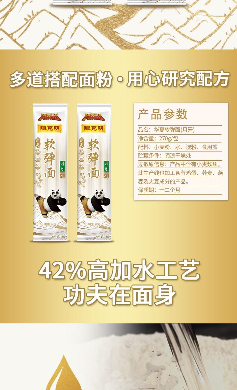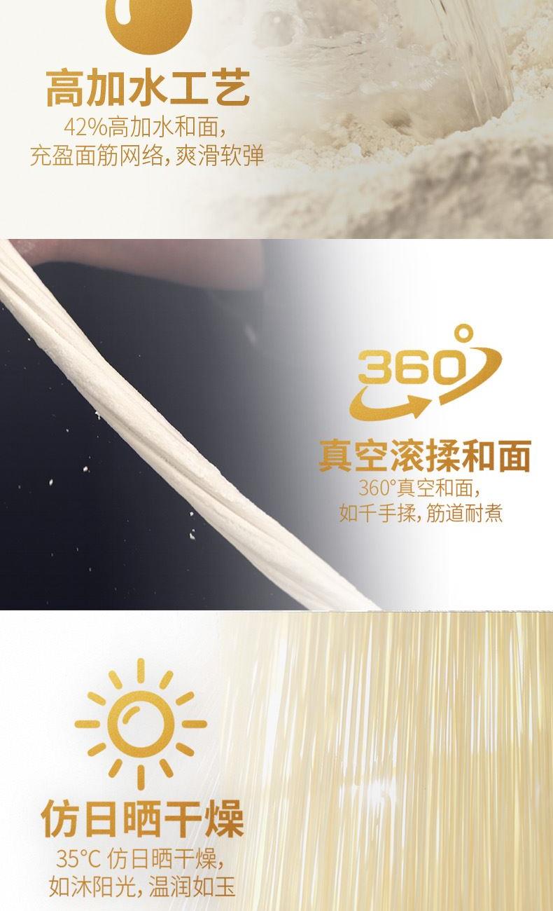 产品规格: 月牙面 270g*3包 1、42%高加水:口感更爽滑软弹 2、360°真空揉:更筋道耐煮 3、35℃仿日晒:面条品质更稳定 4、月牙形,面身圆润顺滑, 咀嚼口感软糯Q弹