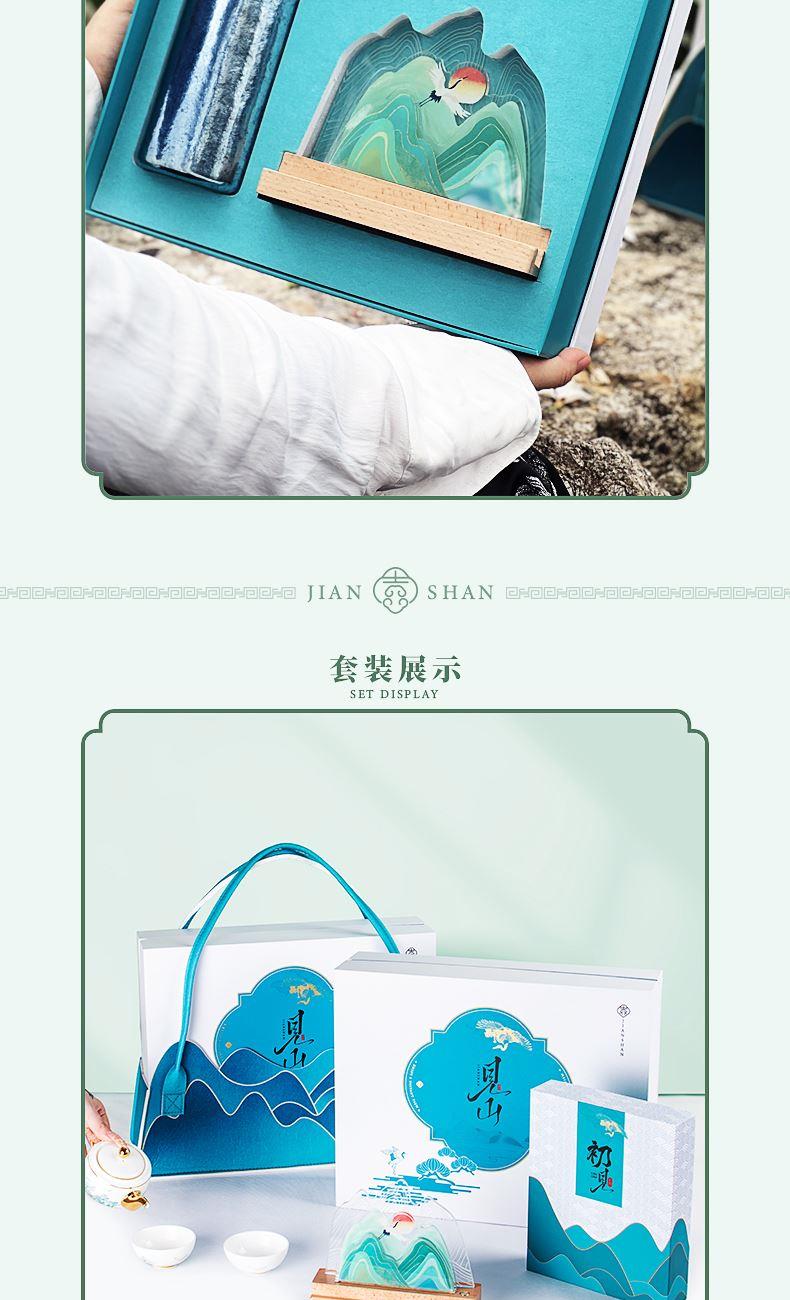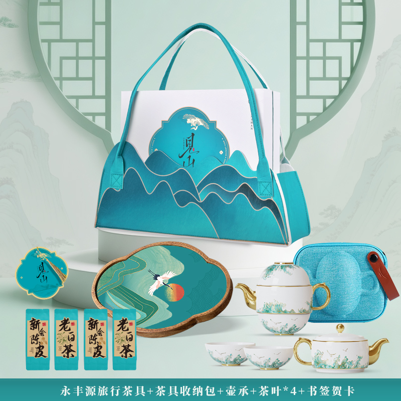 见山礼盒*1 国瓷永丰源精致陶瓷4头旅行茶具*1 胡桃木壶承(丝绸承面)*1 老白茶*2 新会陈皮茶*2 主题贺卡*1