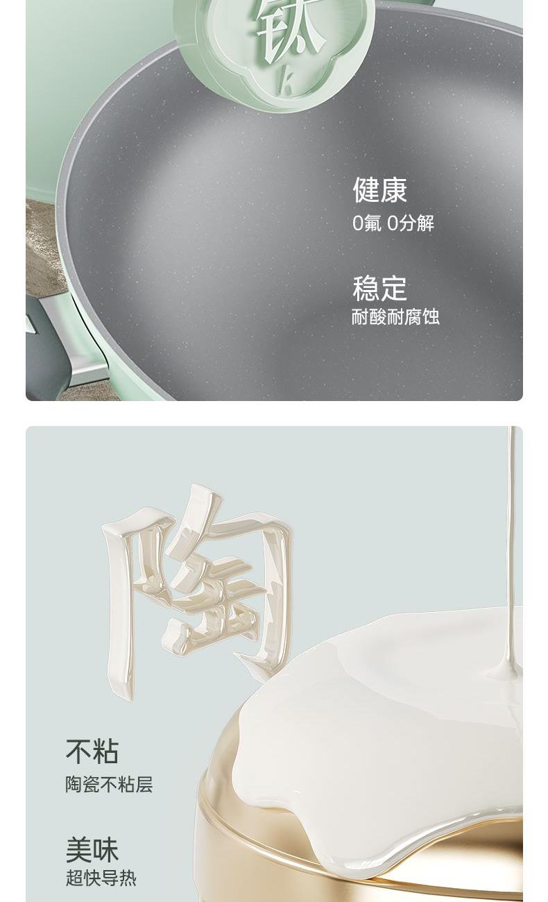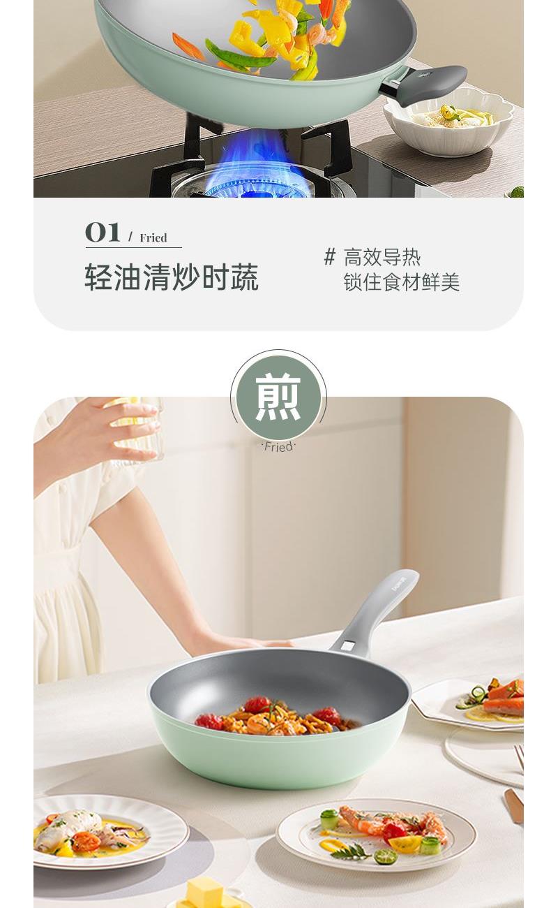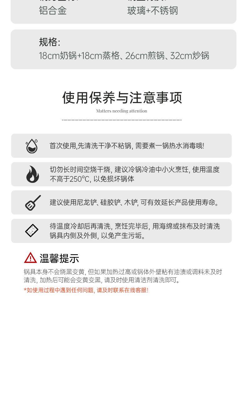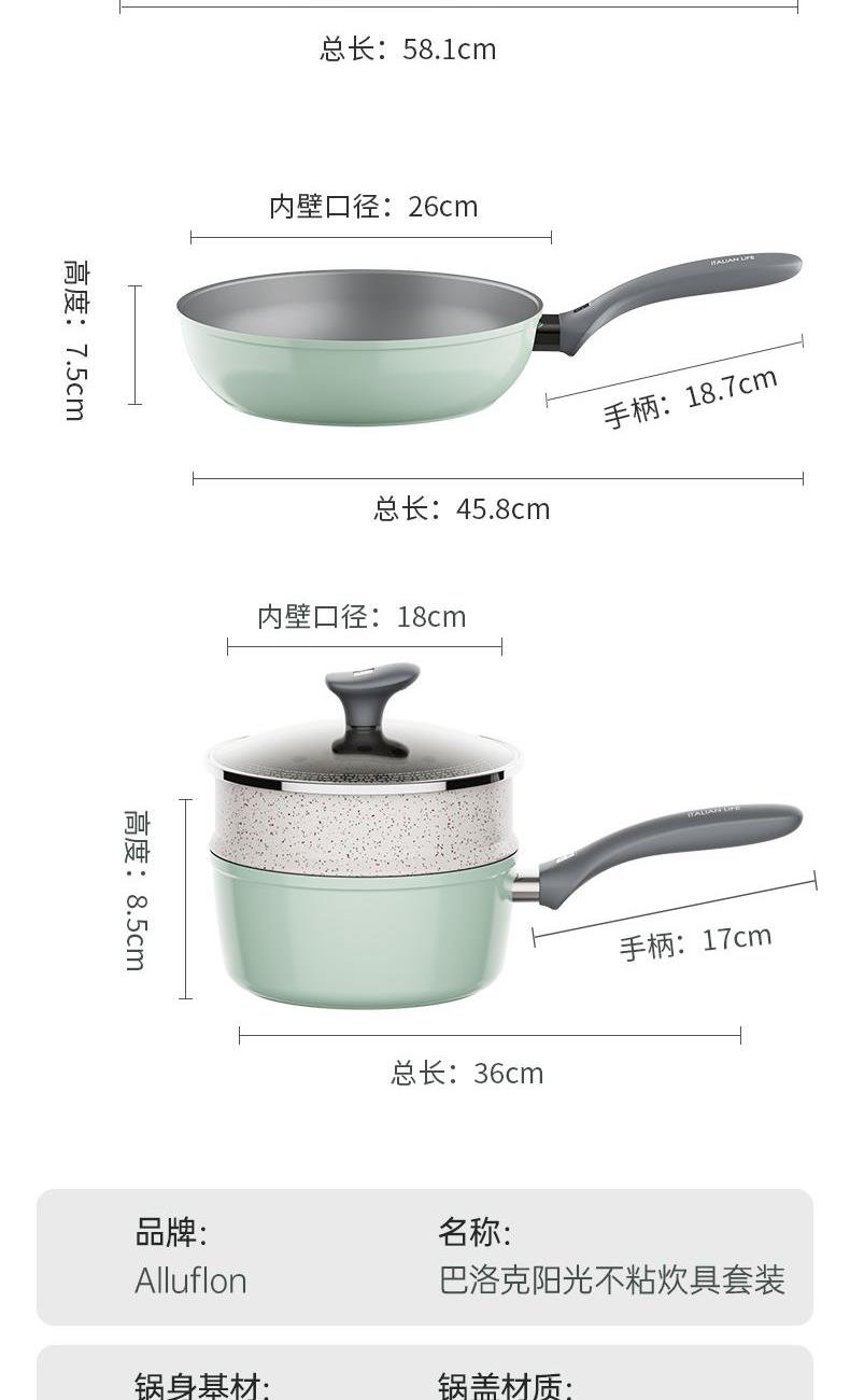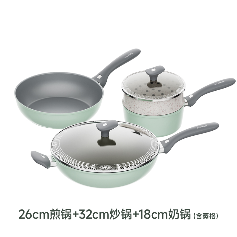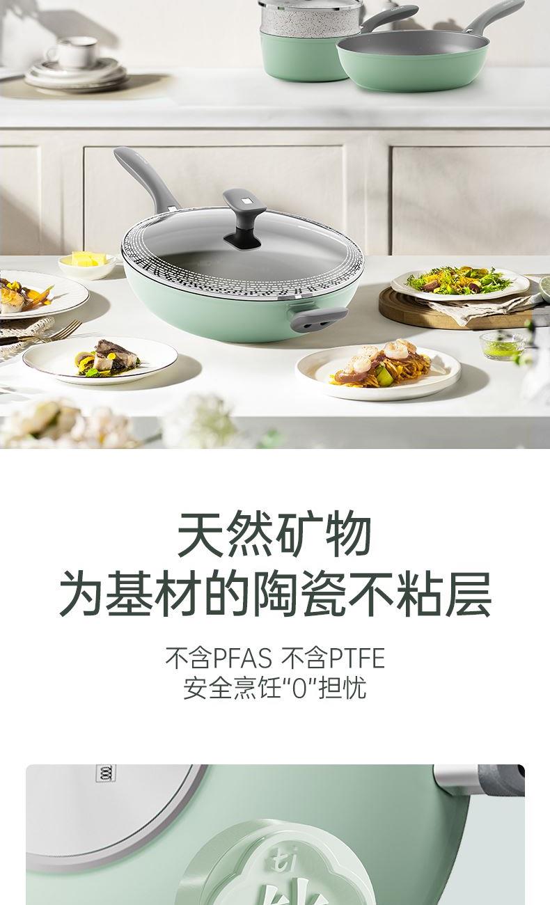 规格:32cm炒锅+18cm奶锅+18cm蒸格 材质:铝合金+陶瓷 单个尺寸:650*400*172 1、无铆钉,全锅无死角不藏污 2、配蒸笼上蒸下煮,一份时间双份美味 3、厚底薄壁,有效减少70%油烟 4、陶瓷外壁,久烧不易变色 5、不含PFAS PTEE,烹饪0担忧