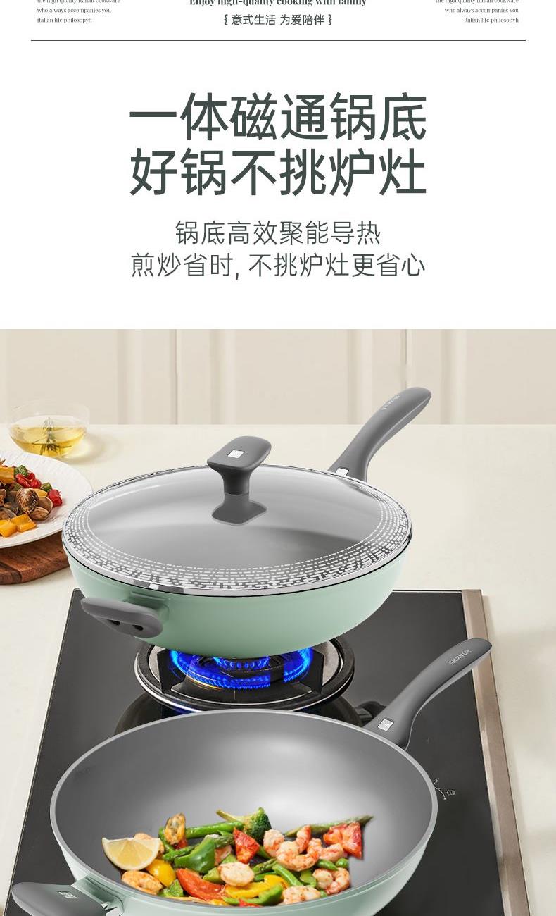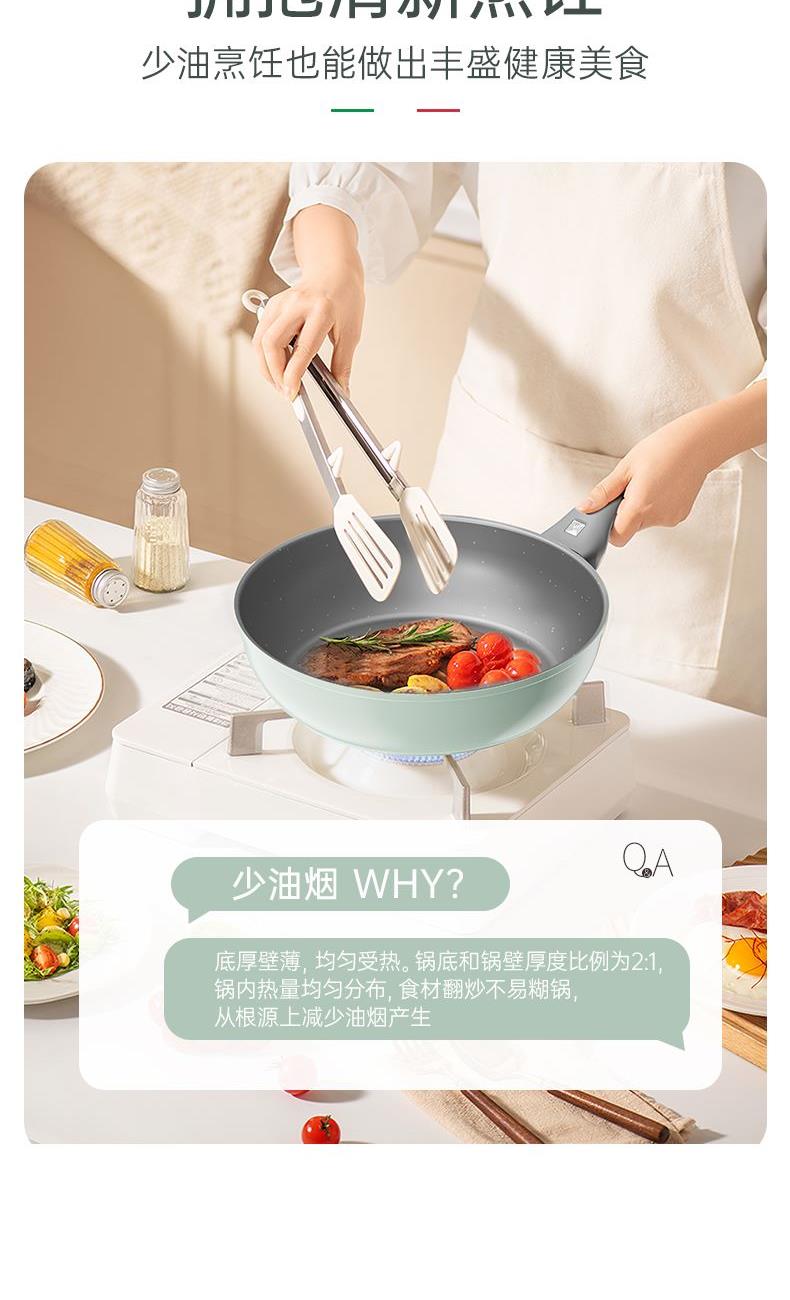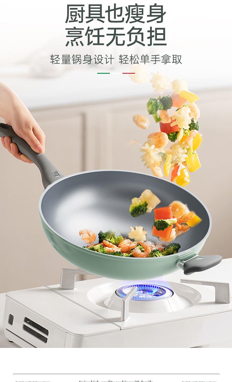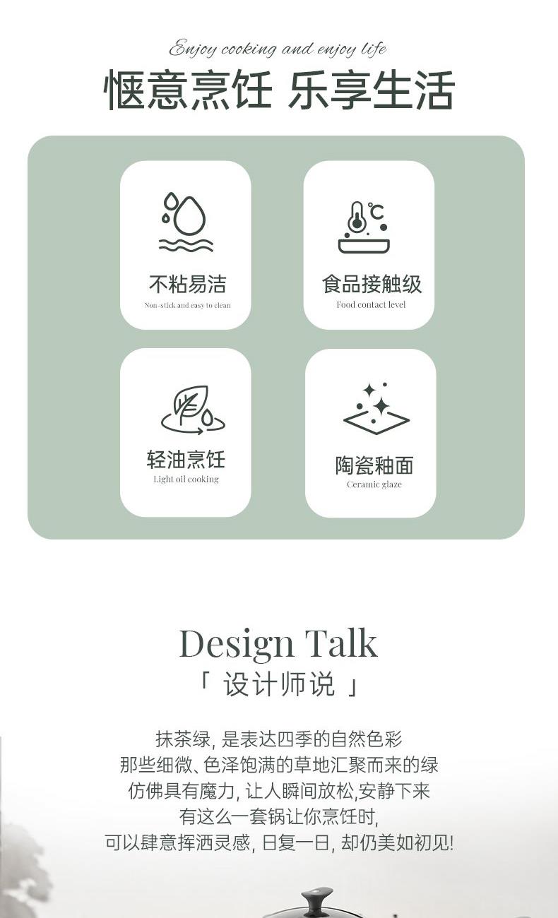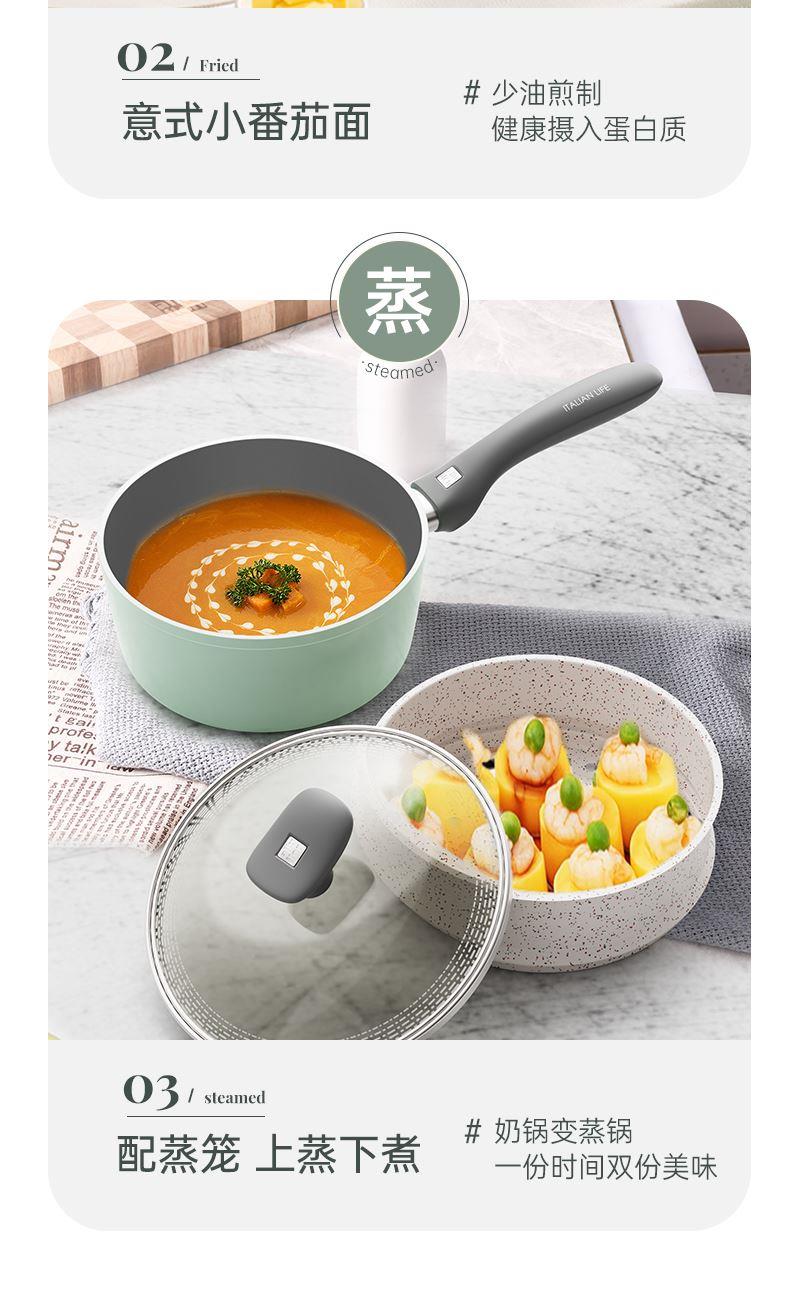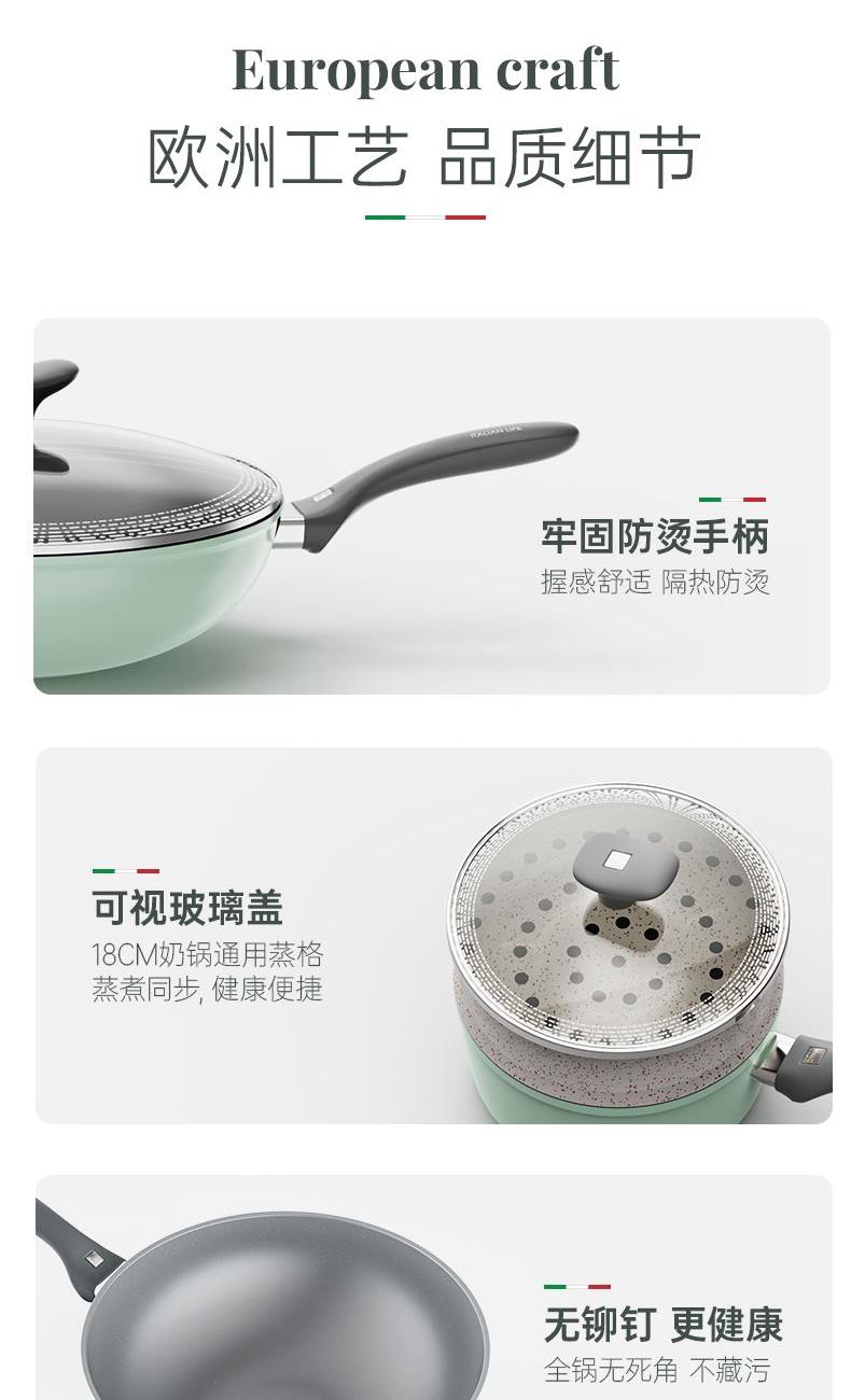 规格:32cm炒锅+18cm奶锅+18cm蒸格 材质:铝合金+陶瓷 单个尺寸:650*400*172 1、无铆钉,全锅无死角不藏污 2、配蒸笼上蒸下煮,一份时间双份美味 3、厚底薄壁,有效减少70%油烟 4、陶瓷外壁,久烧不易变色 5、不含PFAS PTEE,烹饪0担忧