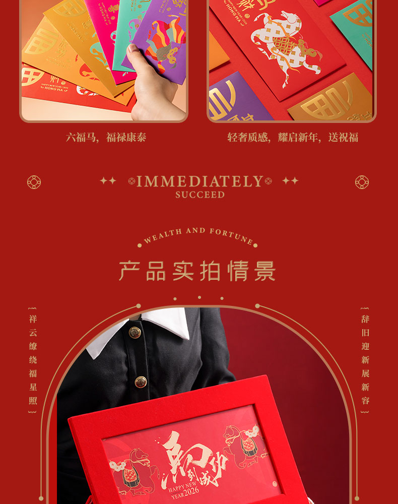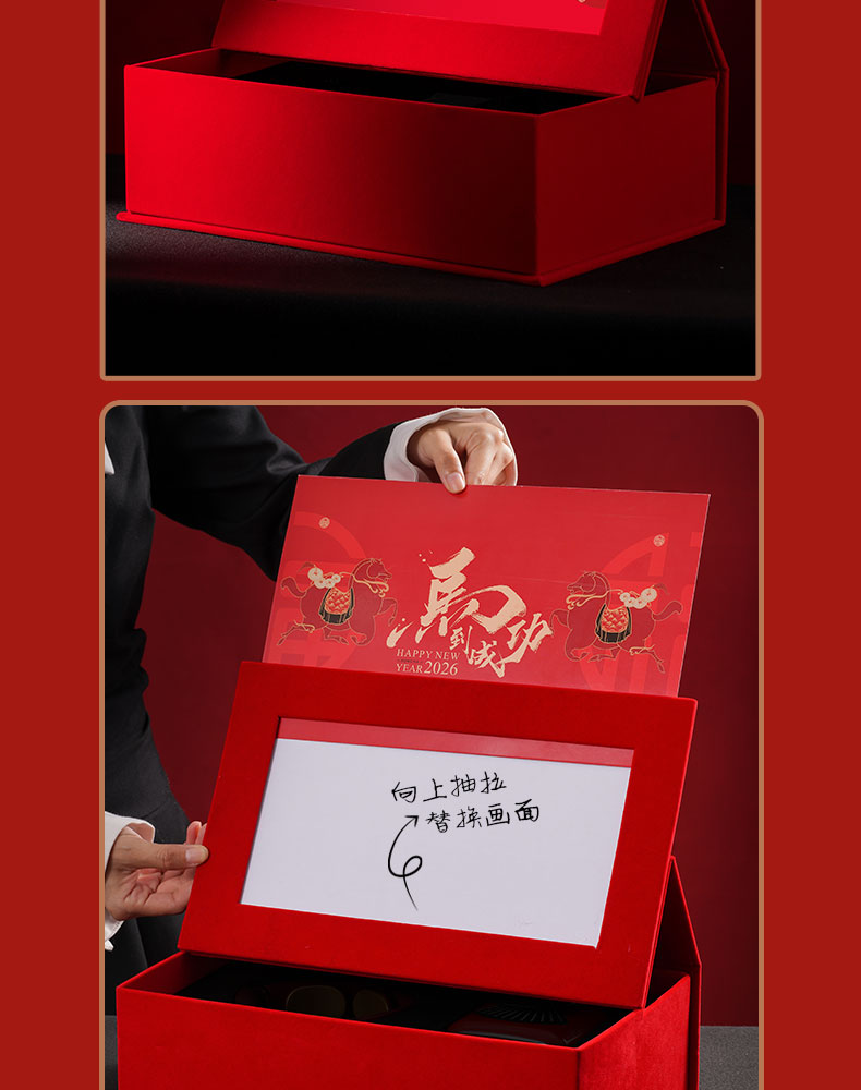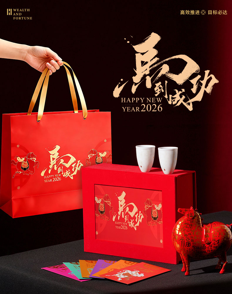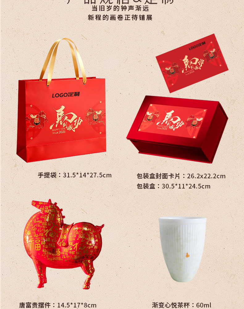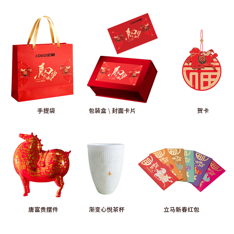 1、唐富贵百福肥马摆件 2、羊脂玉瓷主人对杯 3、新年红包*6:开启新年好运程 4、绒面礼盒:日历功能、收纳功能 用完不闲置, 注:礼盒可专版定制画面