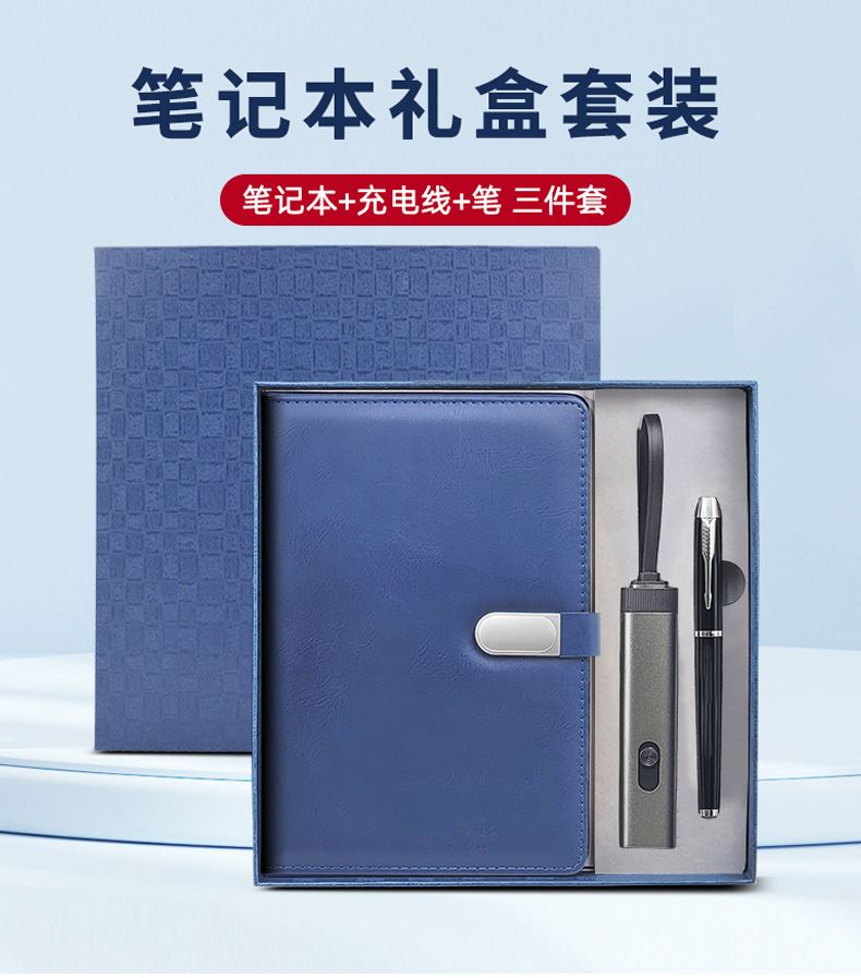 礼盒配置 1、A5搭扣硬皮PU皮笔记本 2、一拖三充电线,小巧便捷、随身携带、快速充电;苹果、安卓、TYPE-C充电接口设计,满足不同机型的充电需求;外观简洁、美观、时尚,尊贵典雅; 3、金属烤漆签字笔 4、蓝色包装盒尺寸:227*227*35mm 5、蓝色手提袋尺寸:270*270*55mm 6、重量:约34kg/箱