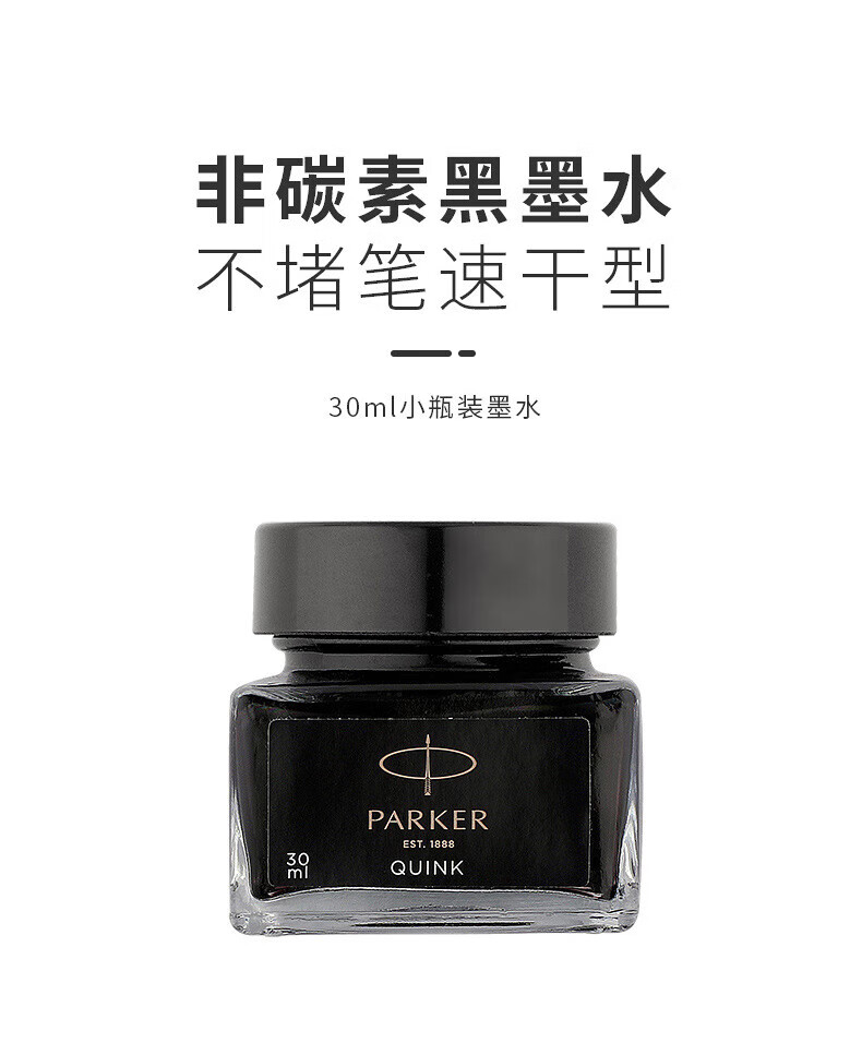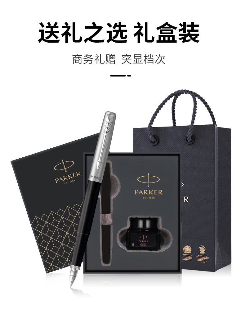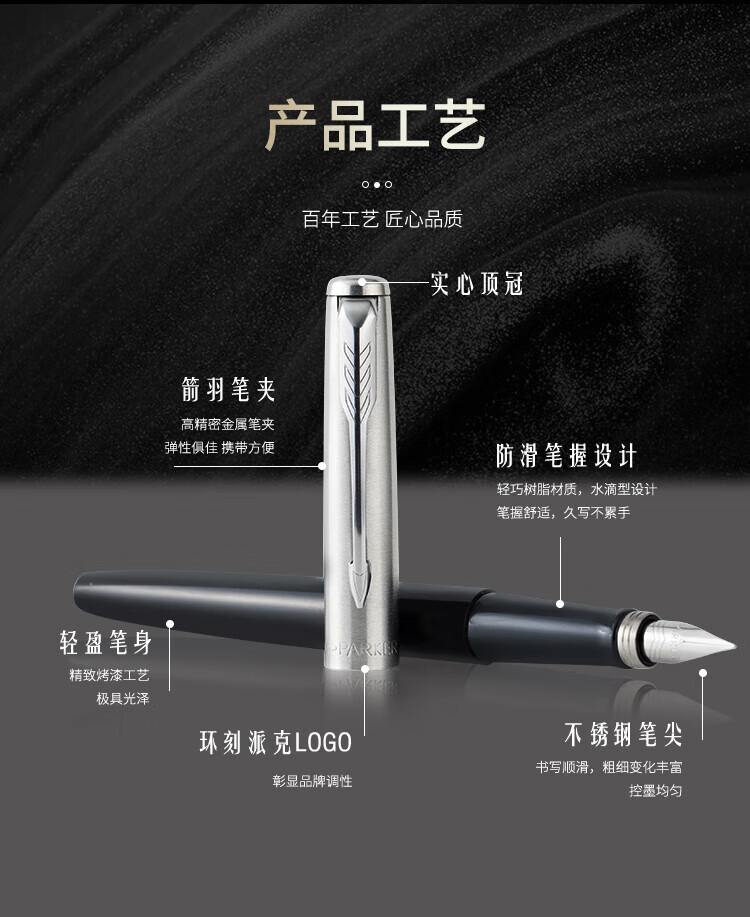 [规格] 笔长128mm 直径10mm [粗细] F尖 [笔尖] 不锈钢笔尖 [材质] 树脂材质笔身,不锈钢笔夹 [配置] 笔、墨水、保修卡、使用说明书、派克手提袋、礼盒 特点 1、笔帽雕刻派克LOGO; 2、不锈钢笔尖雕刻派克LOGO; 3、树脂材质笔身; 4、金色笔冠,商务伙伴。