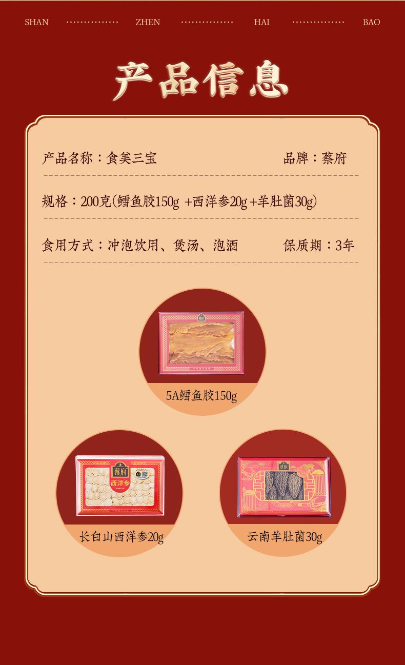 • 蔡府食美三宝礼盒200g(鳕鱼胶+西洋参+羊肚菌)