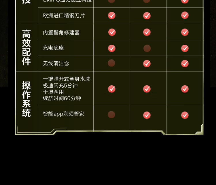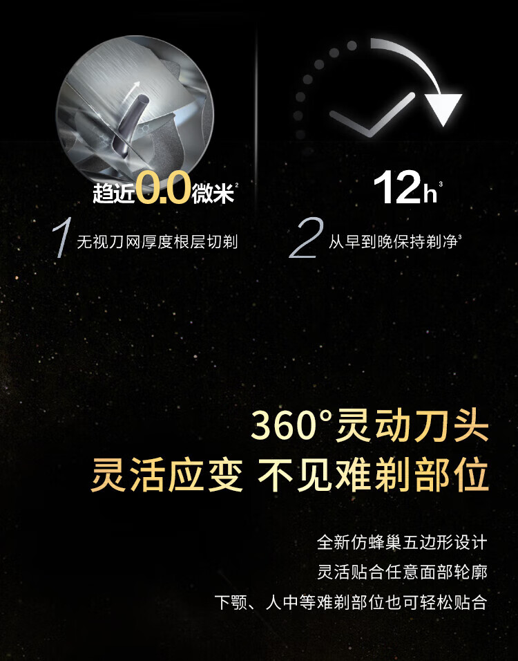 • SkinIQ 肌能感应科技 360度灵动刀头 • 采用多轨须发引入槽,增强表面性能 • 手柄中集成修剪器 是留须髭和修剪鬓角的理想方式。 • 45 片欧洲进口的锋利自研磨刀片,每分钟可完成高达 90,000 次切剃• 充满电后,可提供 60 分钟无线剃须,5 分钟快速充电