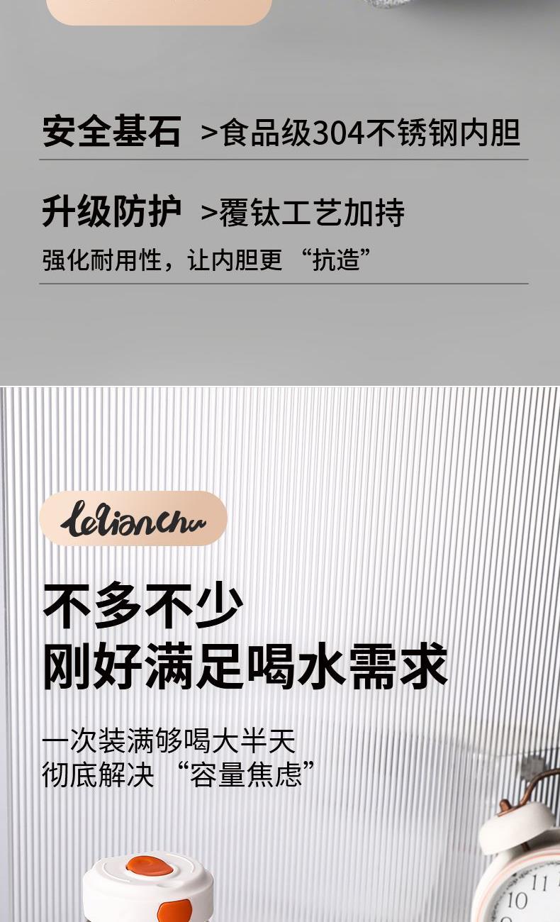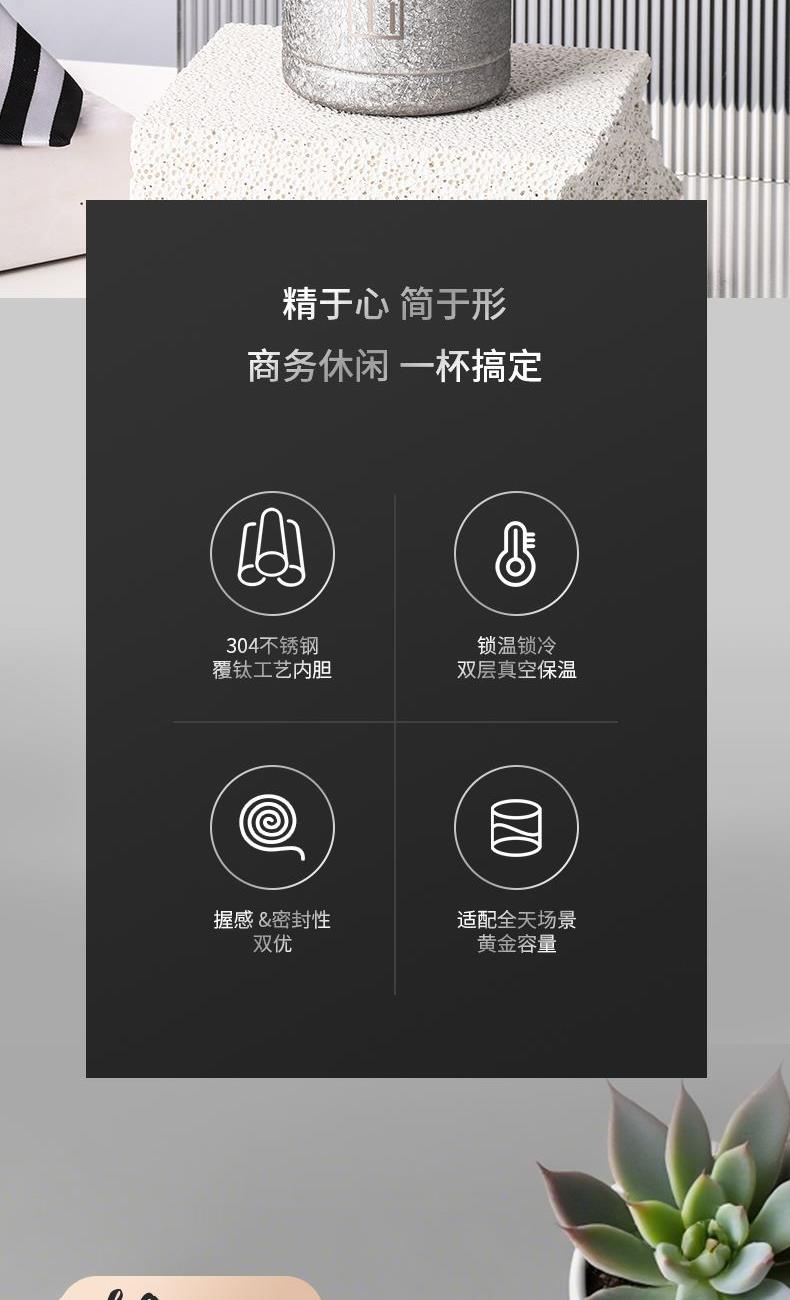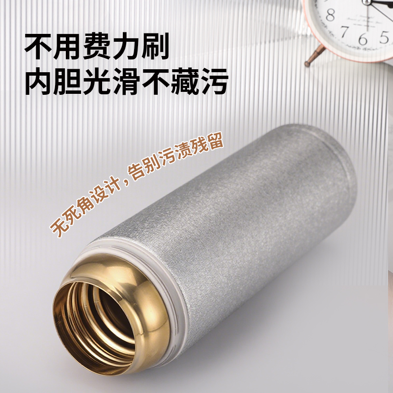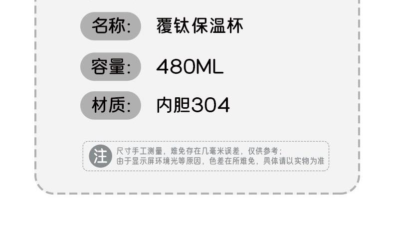 材 质:SUS304 容 量:480ml 彩盒尺寸:7.1*7.1*23.5 外箱尺寸:37*58.5*25cm 1:食品级304不锈钢内胆:采用符合国内标准的304不锈钢打造覆钛工艺内胆,抗腐蚀、耐氧化,不释放有害物质,盛装饮品更安全 2:500ml黄金容量:恰到好处的容量设计,满足日常通勤、办公或短途出行需求,既能保证足够饮水量 3:长效锁温锁冷:双层真空保温技术,不仅能让热水在6-12小时内保持适宜温度,夏季装冰饮也能长时间保冷,一年四季都能用,喝到适口饮品 4:内胆光滑不藏污,简单冲洗即可清洁,长期使用依旧洁净如新。