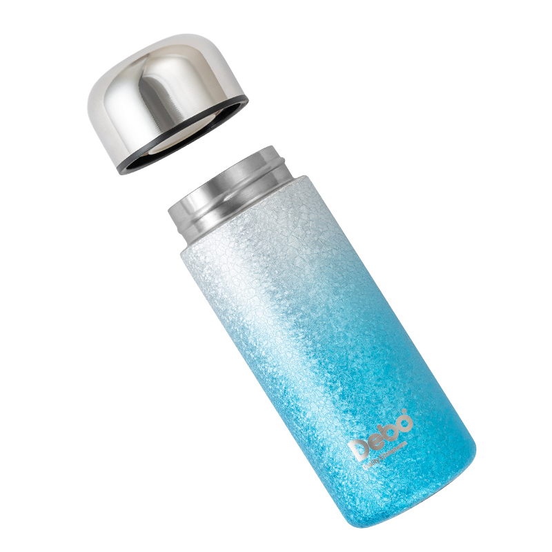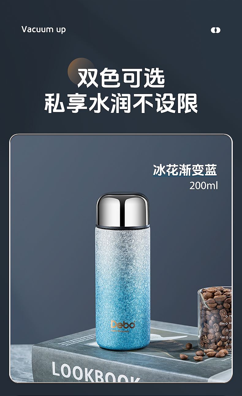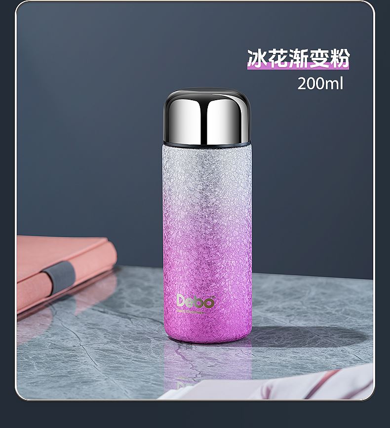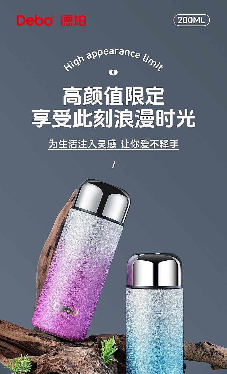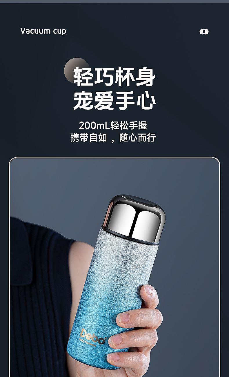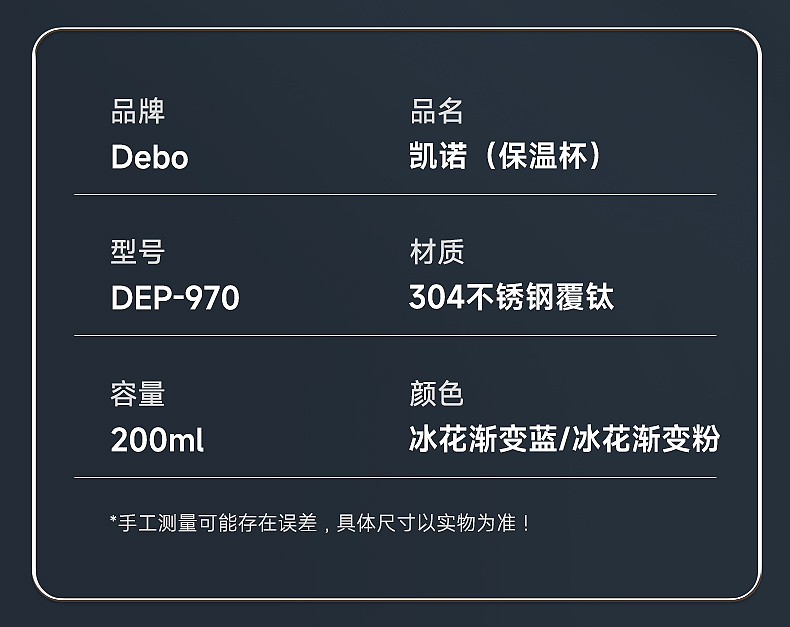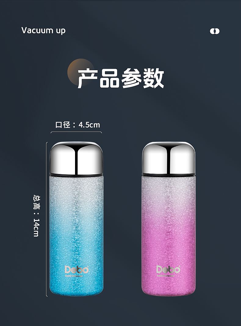 型号:DEP-970 容量:200ml 材质:钛覆层+304不锈钢 颜色:渐变蓝/渐变粉 包装尺寸:80*80*184mm 配置:盖子*1、保温杯身*1 1. 口袋里的保温杯,纤巧轻盈,健康有钛; 2. 高温结晶工艺,冰花纹理颜值担当; 3. 钛覆层内胆,双层真空长效保温; 4. 轻巧手感体验,健康随行,轻盈无感。