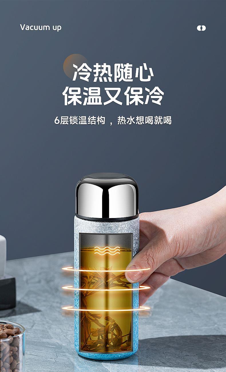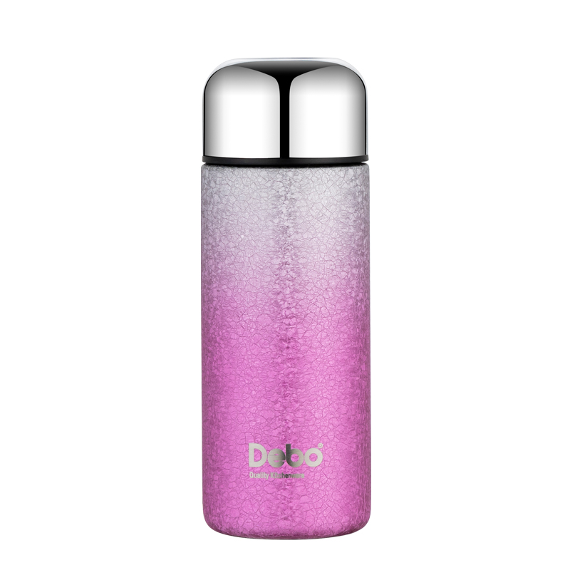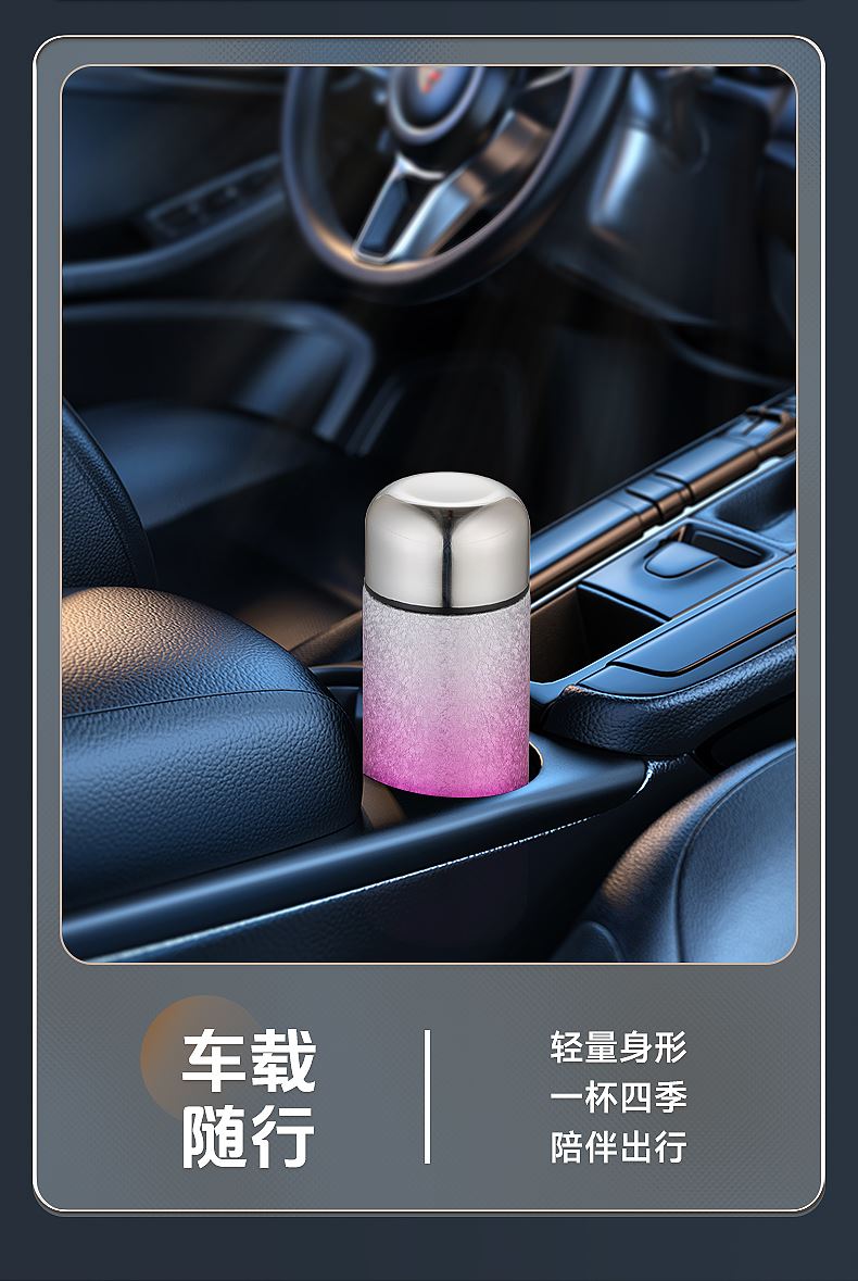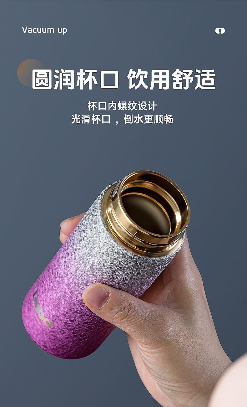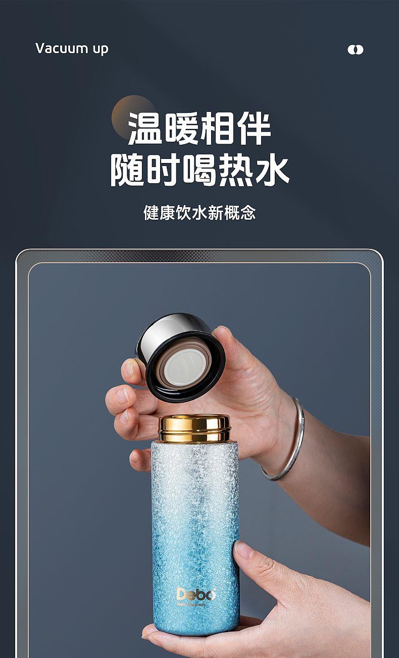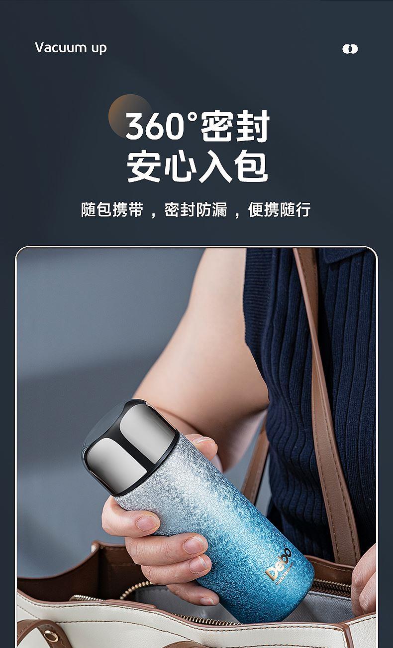型号:DEP-970 容量:200ml 材质:钛覆层+304不锈钢 颜色:渐变蓝/渐变粉 包装尺寸:80*80*184mm 配置:盖子*1、保温杯身*1 1. 口袋里的保温杯,纤巧轻盈,健康有钛; 2. 高温结晶工艺,冰花纹理颜值担当; 3. 钛覆层内胆,双层真空长效保温; 4. 轻巧手感体验,健康随行,轻盈无感。