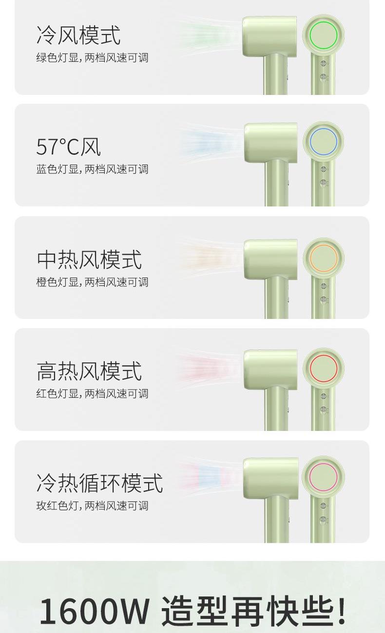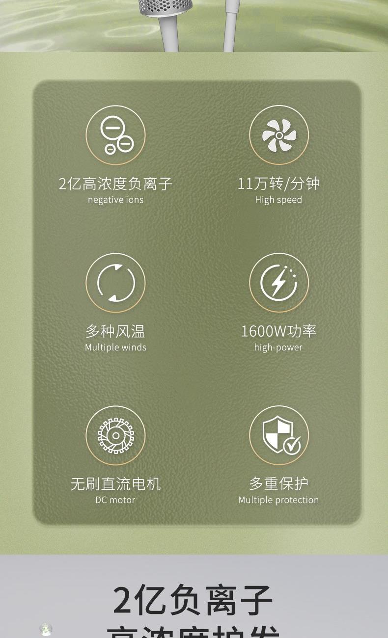 米技生活(Design Germany) 商品编号:72226544218 特色功能:高速吹风 功率:800W-2000W(含) 护发类型:负离子 认证型号:HD-P16G68 热风档位:三档 风速:20m/s 额定功率:1600W