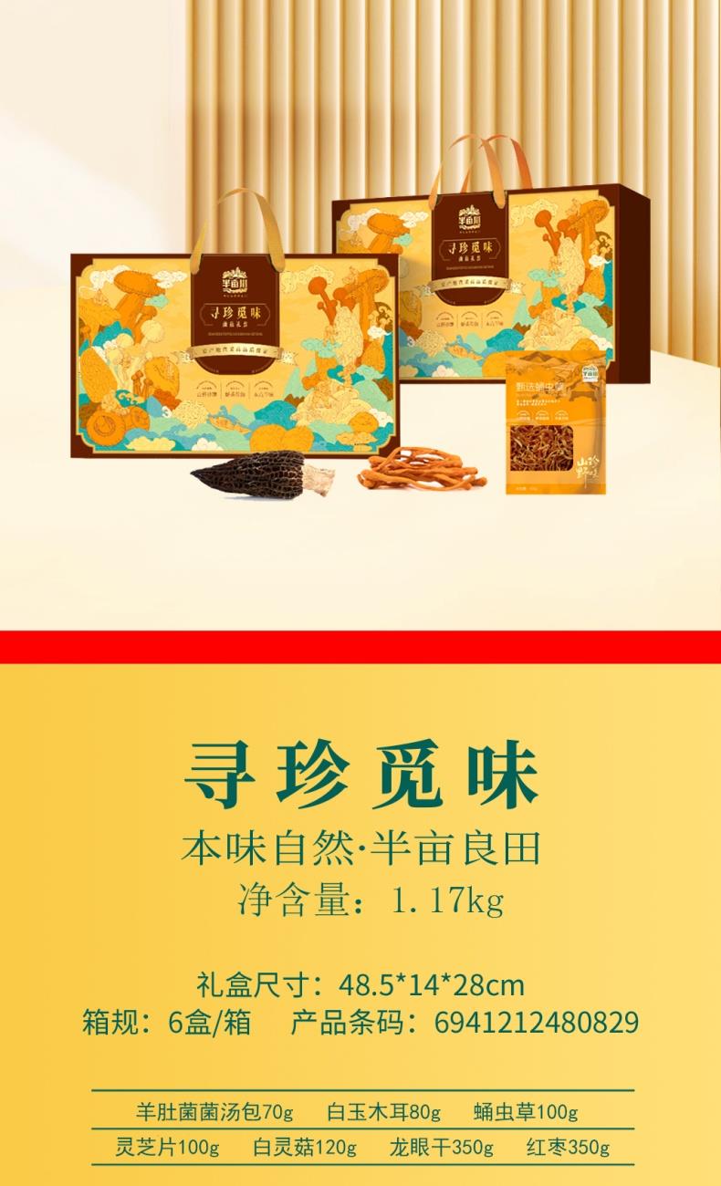 产品配置: 羊肚菌菌汤包70g 精选白玉木耳80g 精选蛹虫草100g 精选灵芝片100g 野生白灵菇120g 泰国龙眼干350g 新 疆 红 枣350g 净含量:1.17kg 礼盒尺寸:48.5*14*28cm 半亩川珍养礼盒,汇聚羊肚菌、灵芝片等珍菌干货,搭配新疆红枣、龙眼干,天然滋补,营养均衡。