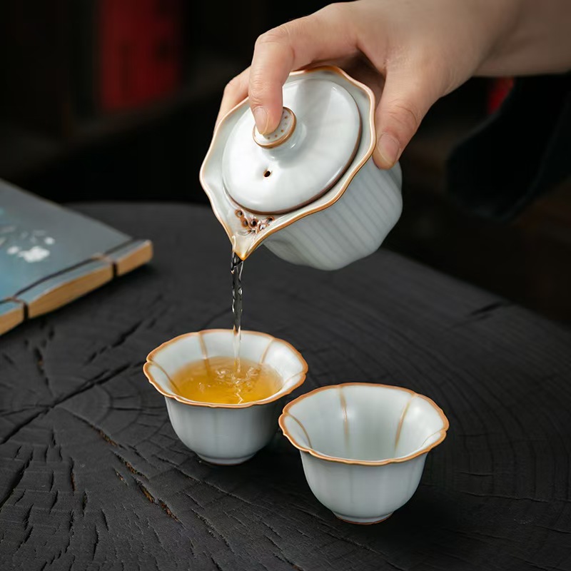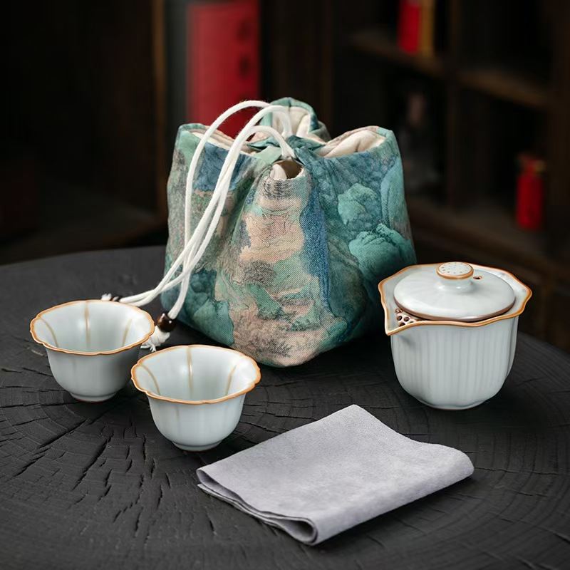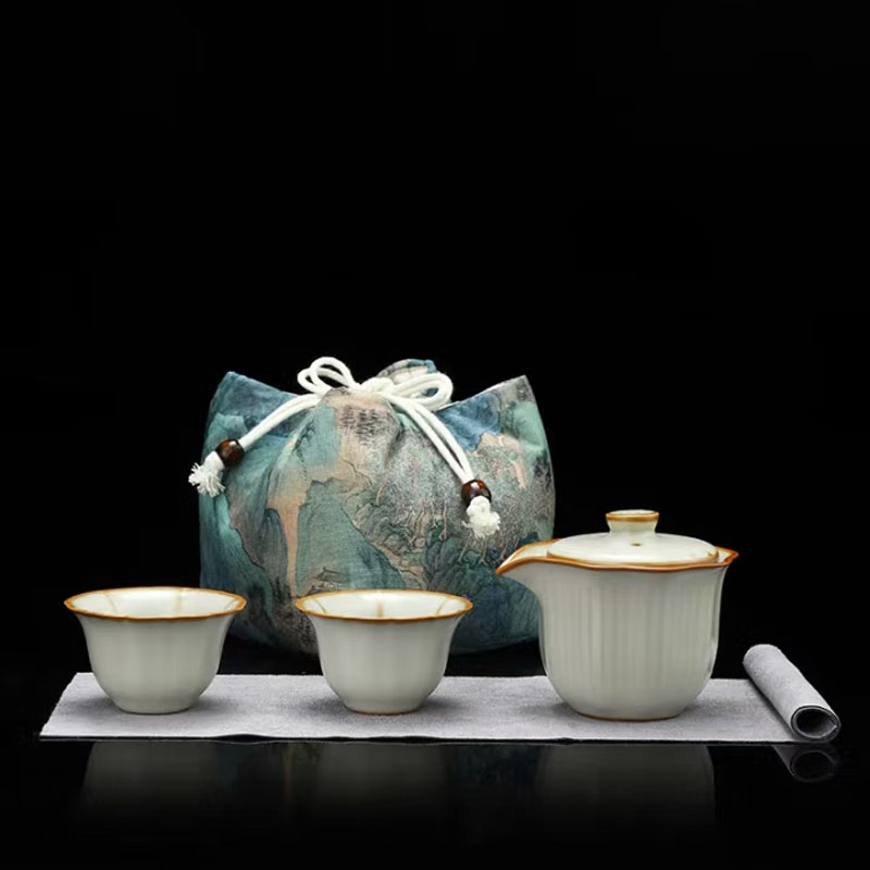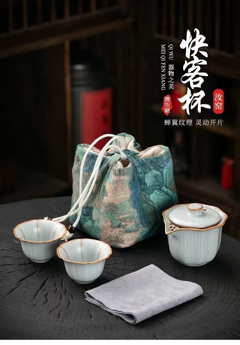 配 制: 1壶 2杯 1茶巾 1旅行袋 规格:壶:9.8*8cm 杯7.1*4.2cm 材质:黄汝瓷 布袋 推荐说明:亚黄汝瓷,玛瑙入釉,蝉翼开片。技术新品,采用高价优质瓷土,紫口铁足。立体浮雕杯身。杯身开片,可养瓷。