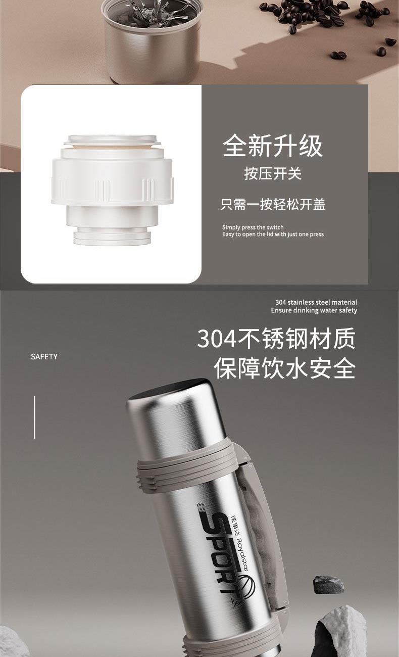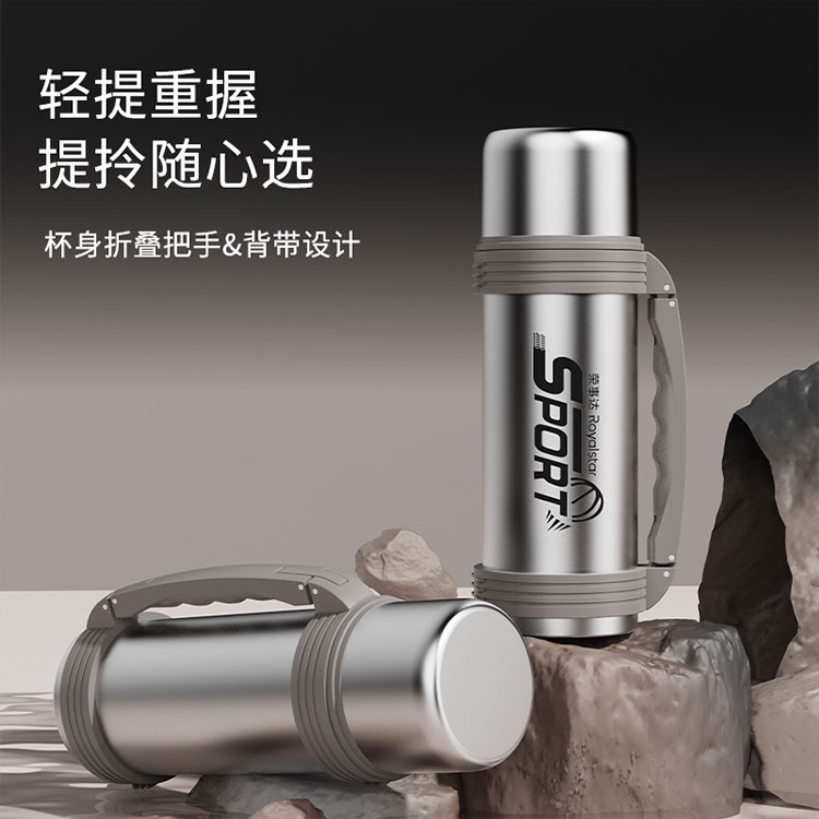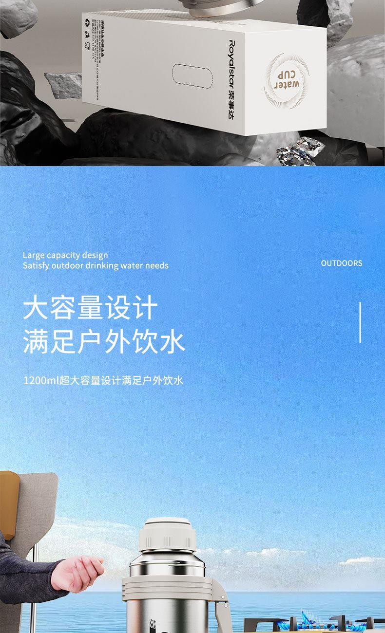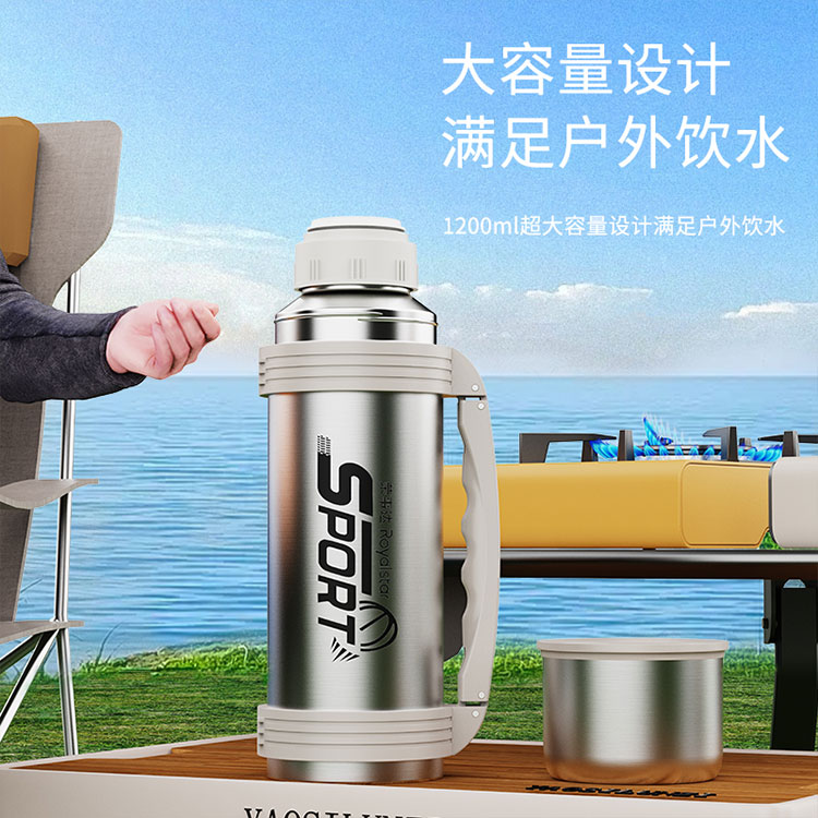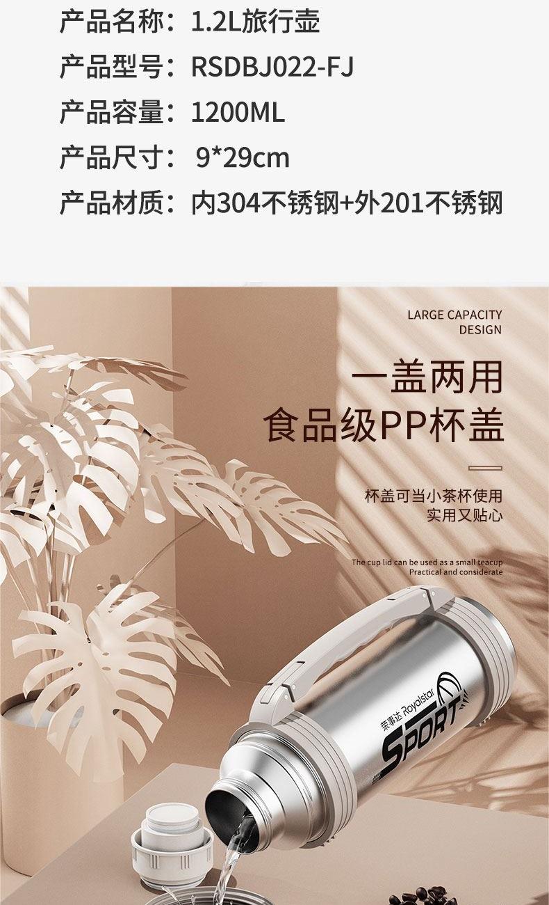 产品型号:RSDBJ022-FJ 产品容量:1200ML 产品尺寸: 9*29cm 产品材质:内304不锈钢+外201不锈钢 彩盒尺寸:11.5*11.5*29.8cm 外箱尺寸:71*47.5*31.5cm 采用高精密锁温结构和双层不锈钢抽真空设计,持久保温保冷; 304不锈钢内胆安全健康无异味,24小时长效保温保冷,1200ml超大容量设计满足户外饮水; 一盖两用食品级PP杯盖,按压开关只需一按轻松开盖,杯盖可当小茶杯使用实用又贴心; 杯身折叠把手&背带设计,把手便捷好用不占空间,背带长短随意调节,满足不同需求。