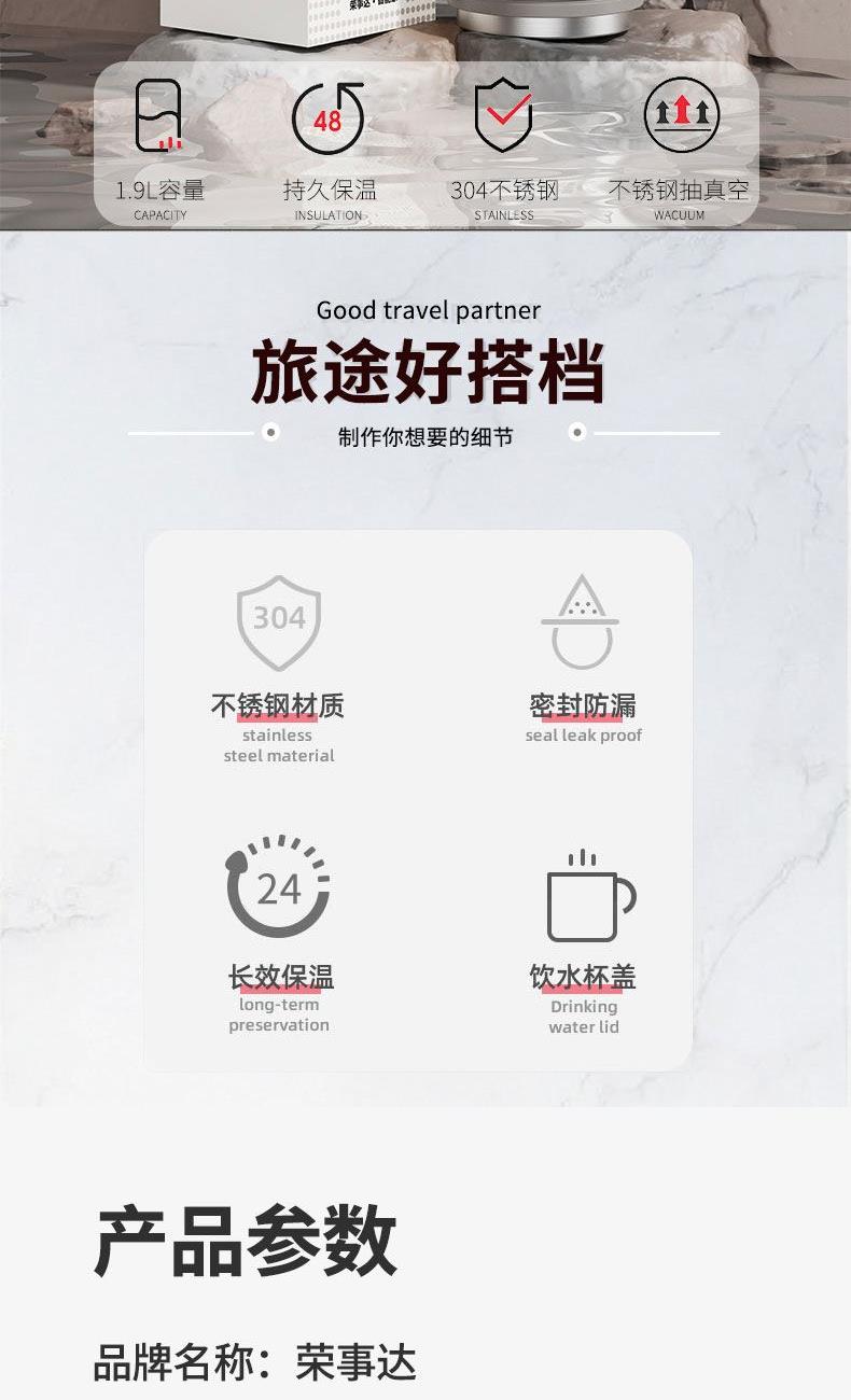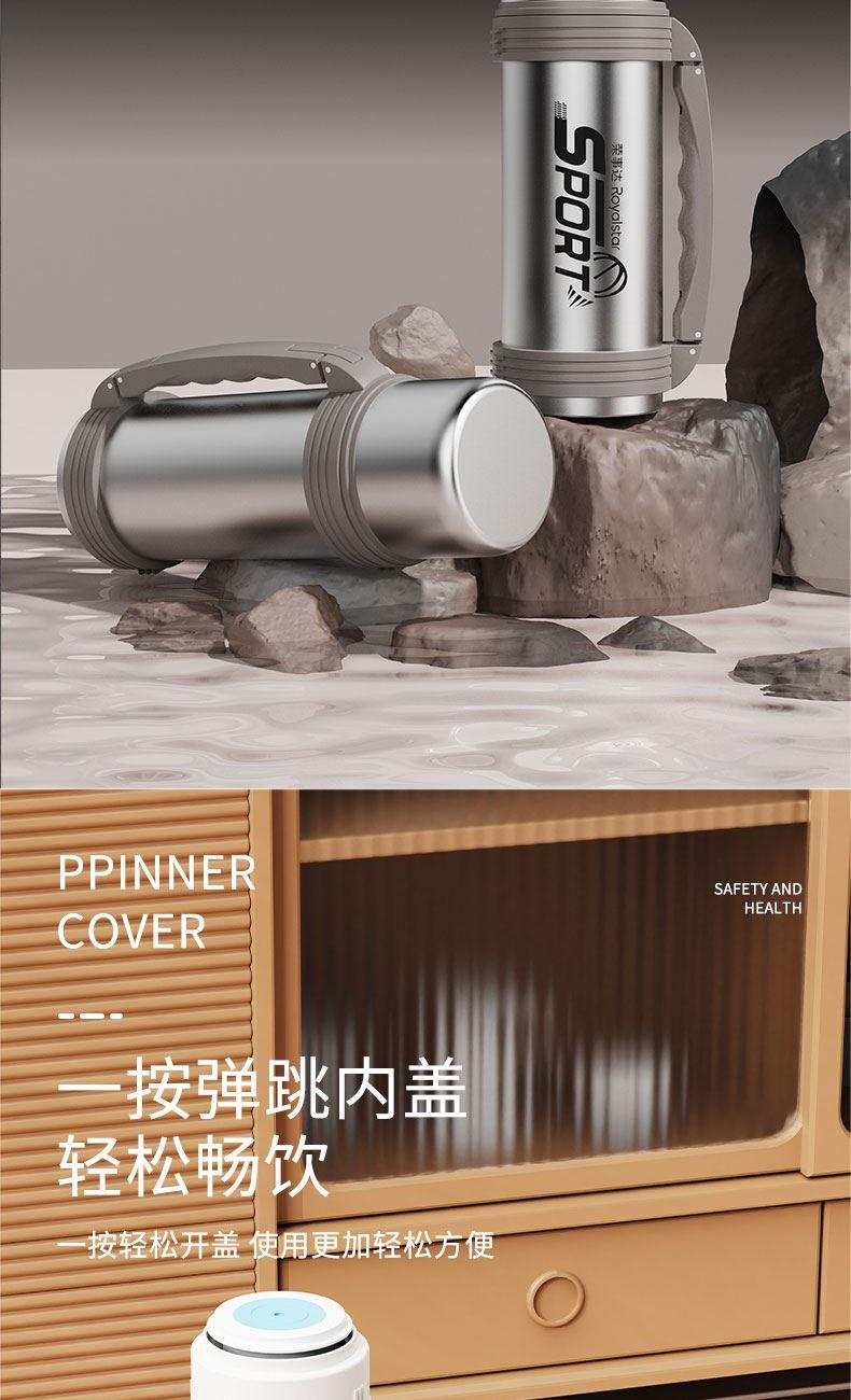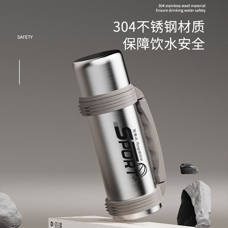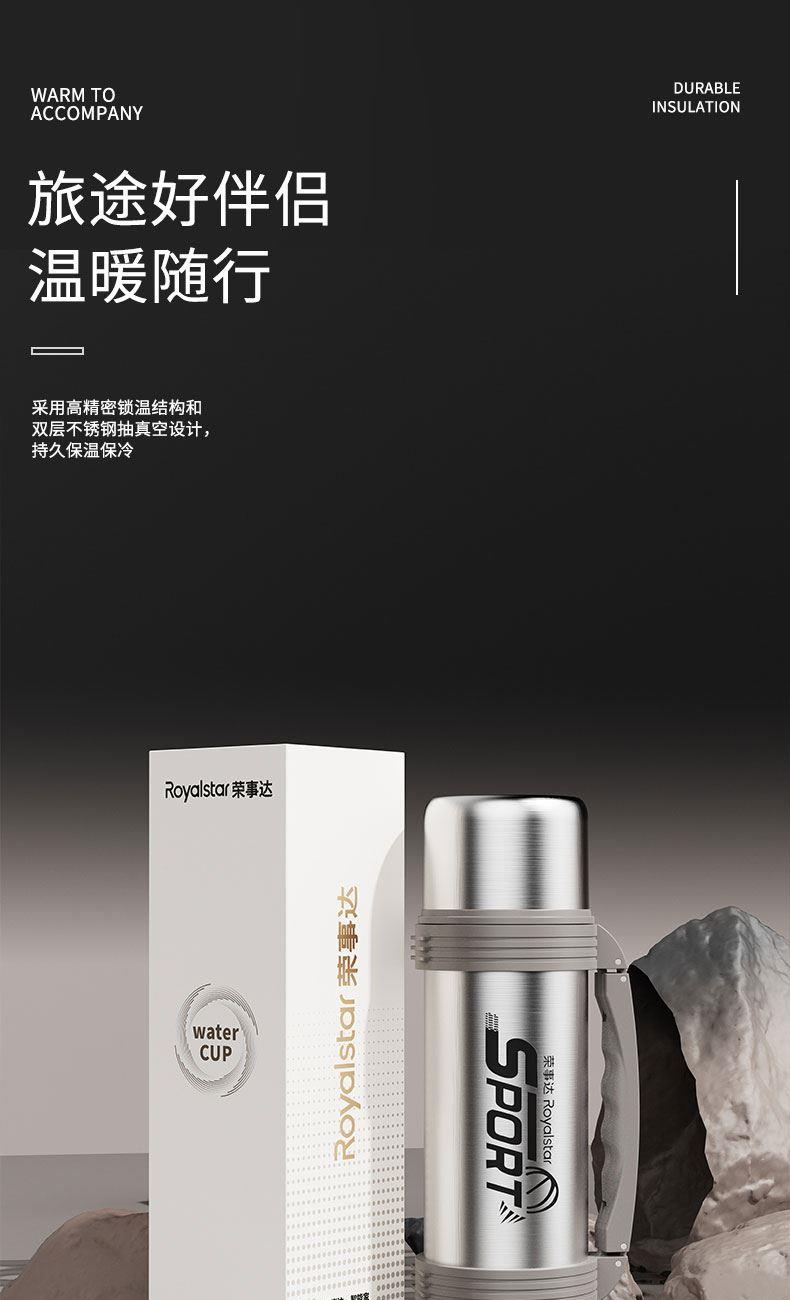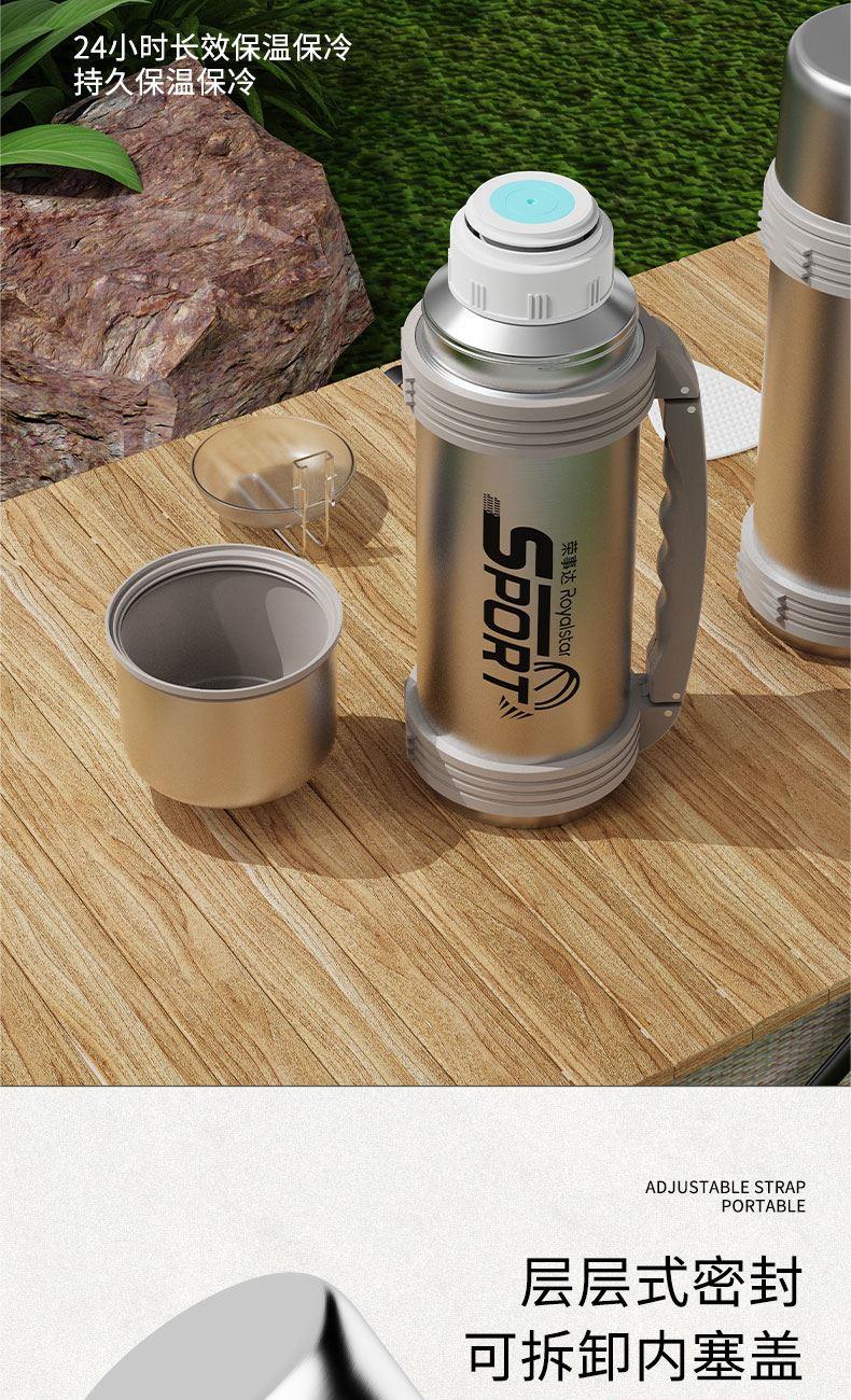 产品型号:RSDBJ022-FJ 产品容量:1200ML 产品尺寸: 9*29cm 产品材质:内304不锈钢+外201不锈钢 彩盒尺寸:11.5*11.5*29.8cm 外箱尺寸:71*47.5*31.5cm 采用高精密锁温结构和双层不锈钢抽真空设计,持久保温保冷; 304不锈钢内胆安全健康无异味,24小时长效保温保冷,1200ml超大容量设计满足户外饮水; 一盖两用食品级PP杯盖,按压开关只需一按轻松开盖,杯盖可当小茶杯使用实用又贴心; 杯身折叠把手&背带设计,把手便捷好用不占空间,背带长短随意调节,满足不同需求。