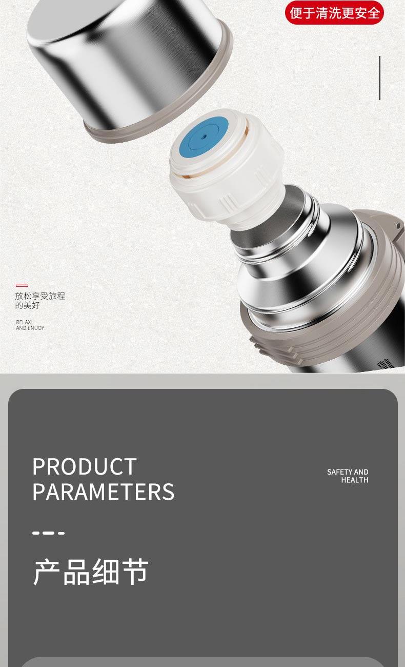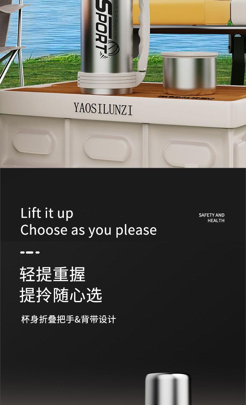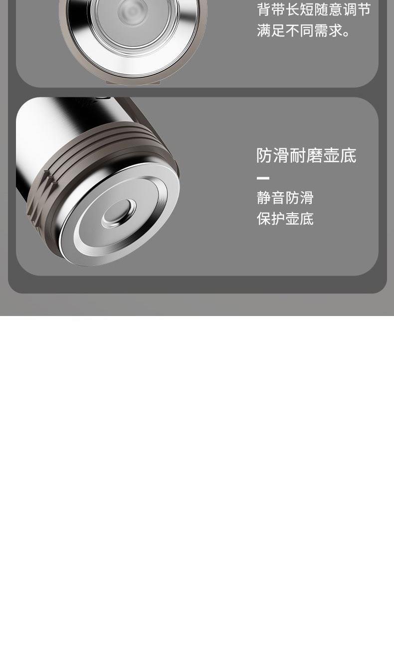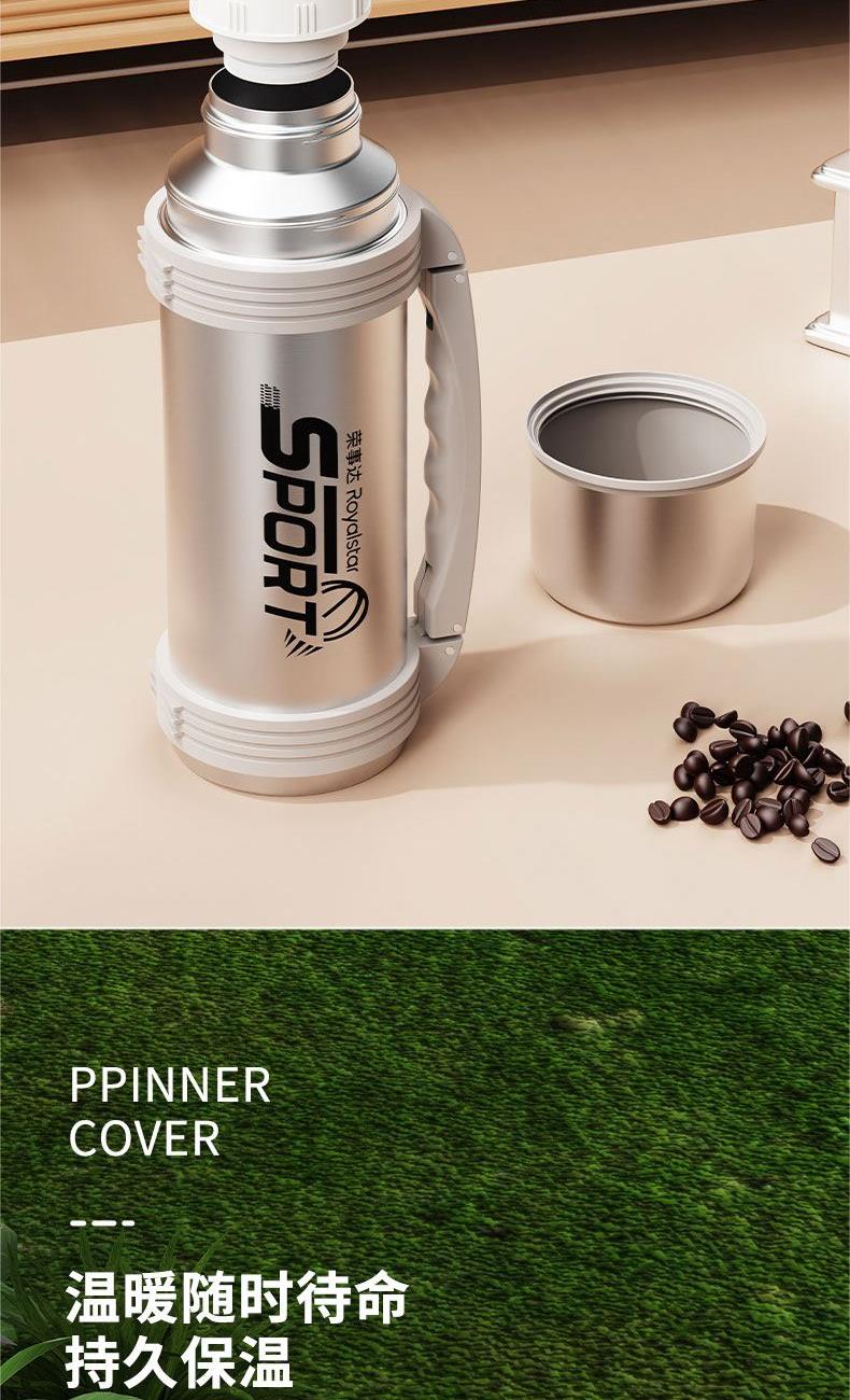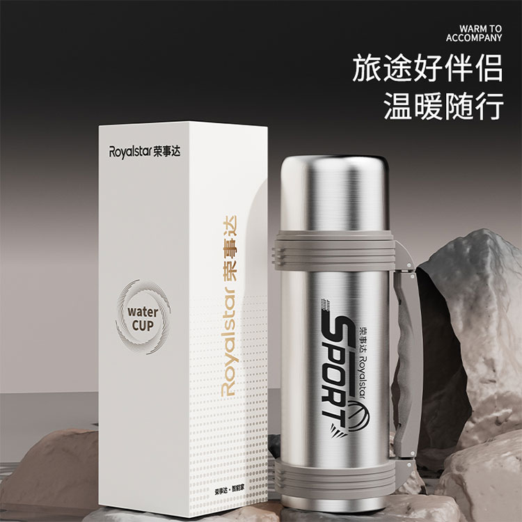 产品型号:RSDBJ022-FJ 产品容量:1200ML 产品尺寸: 9*29cm 产品材质:内304不锈钢+外201不锈钢 彩盒尺寸:11.5*11.5*29.8cm 外箱尺寸:71*47.5*31.5cm 采用高精密锁温结构和双层不锈钢抽真空设计,持久保温保冷; 304不锈钢内胆安全健康无异味,24小时长效保温保冷,1200ml超大容量设计满足户外饮水; 一盖两用食品级PP杯盖,按压开关只需一按轻松开盖,杯盖可当小茶杯使用实用又贴心; 杯身折叠把手&背带设计,把手便捷好用不占空间,背带长短随意调节,满足不同需求。