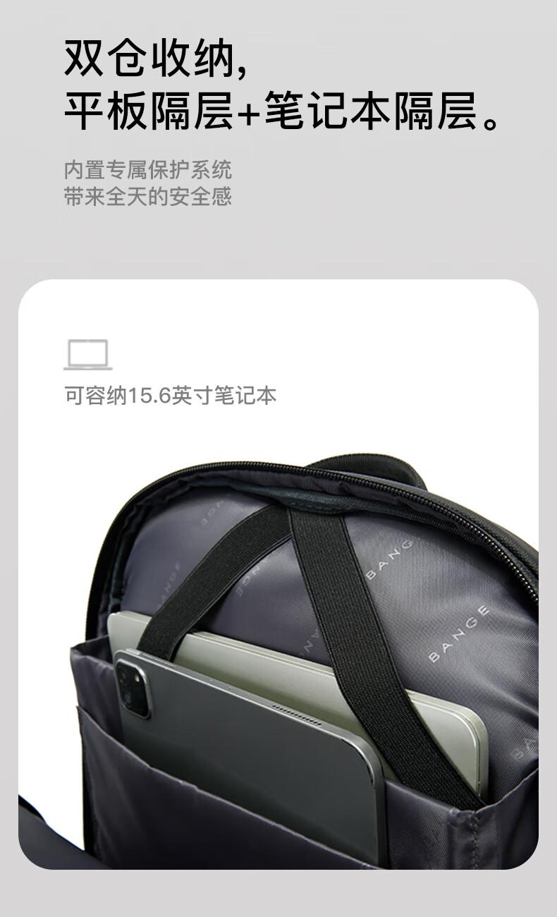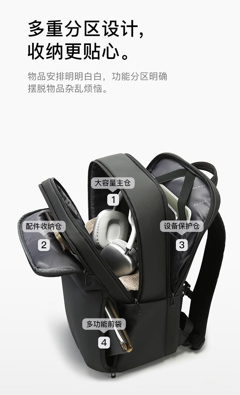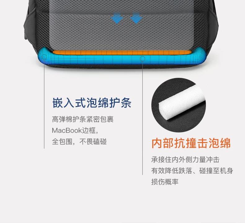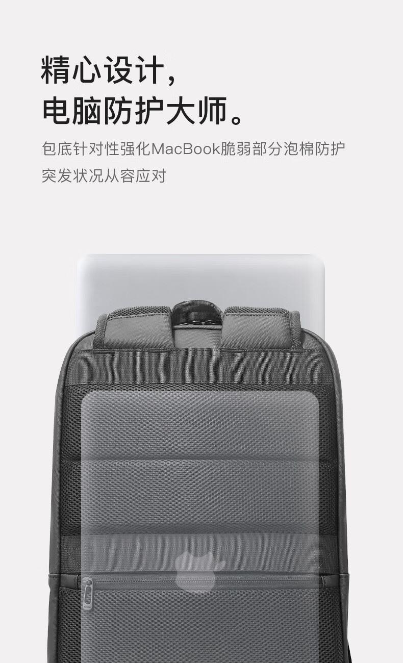 革新面料高效防水性能 多重分区设计:收纳更贴心。 繁琐配件1S归位。 双仓收纳平板隔层+笔记本隔层。 精心设计,电脑防护大师, 立体挺阔空包也有型
