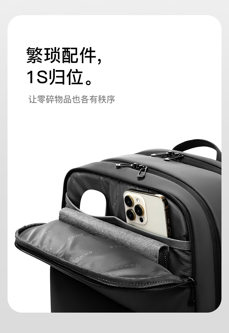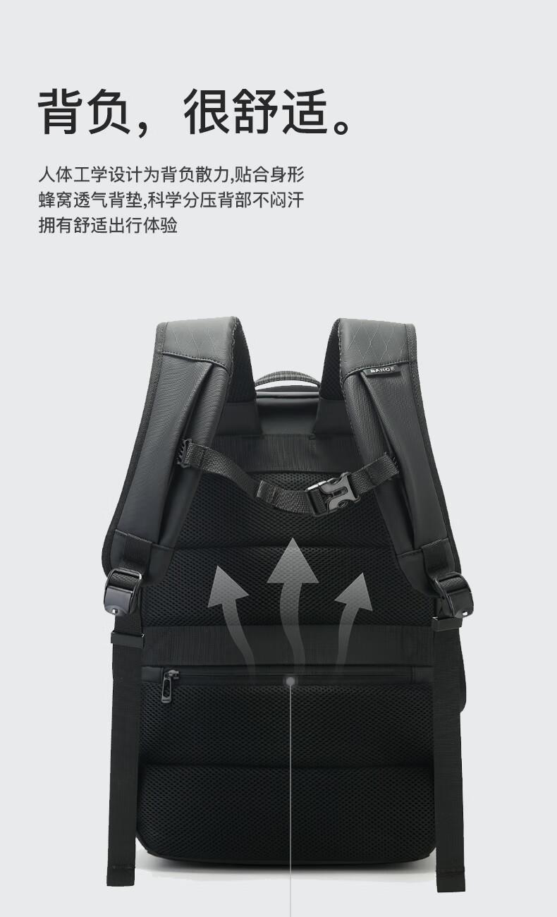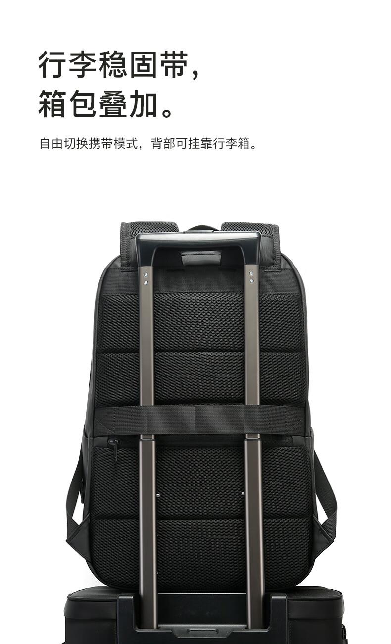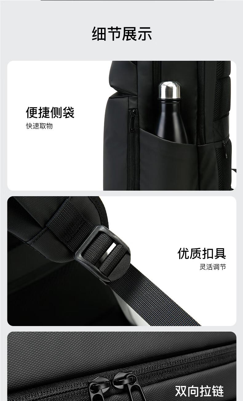 革新面料高效防水性能 多重分区设计:收纳更贴心。 繁琐配件1S归位。 双仓收纳平板隔层+笔记本隔层。 精心设计,电脑防护大师, 立体挺阔空包也有型