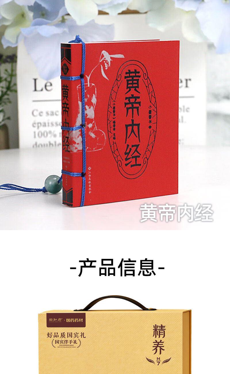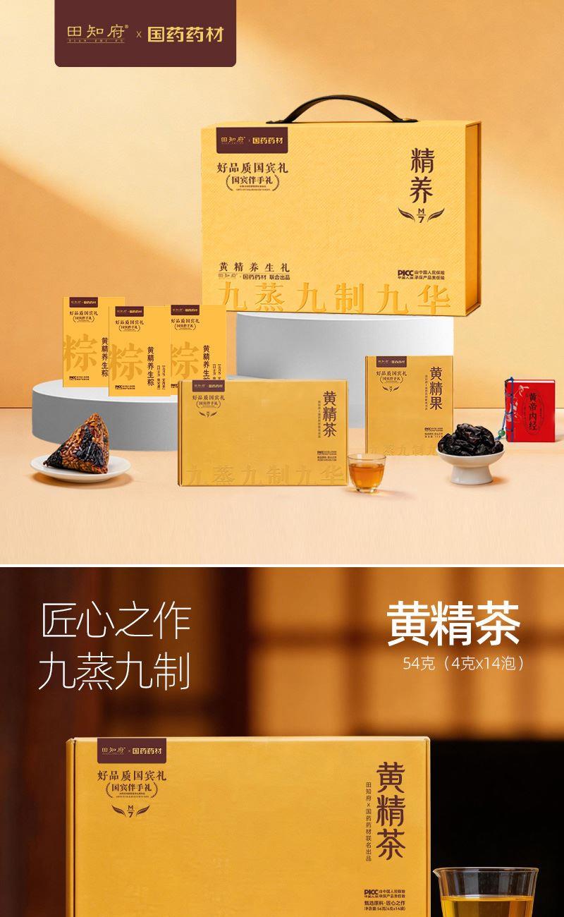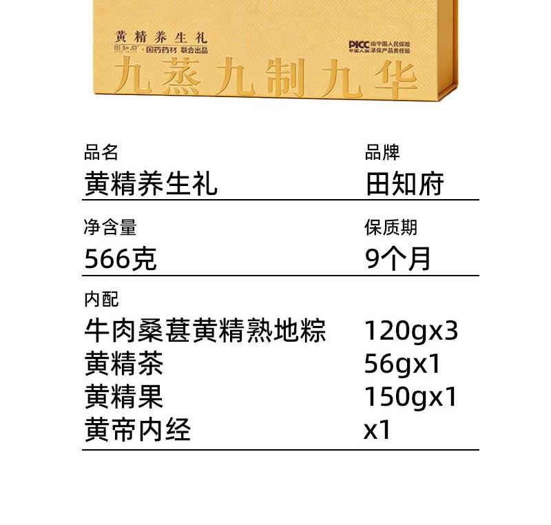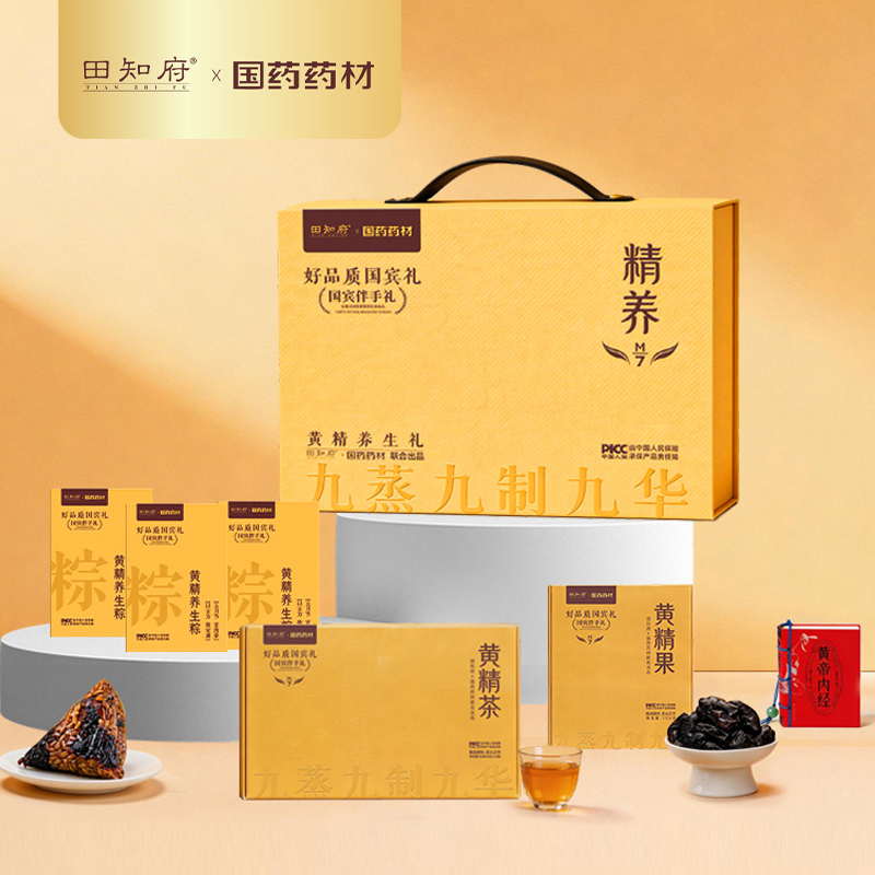 康养生礼赠+国宾伴手礼+国药药材联名出品+中国人保险承保产品 产品参数:120g牛肉桑葚黄精熟地粽*3个+56g黄精茶(4*14)*1盒+150g黄精果*1盒+黄帝内经*1本 产品卖点:九蒸九晒九露,约49天,黄精多糖高于药典标准20%以上,硒,氨基酸,微量元素,补气养阴,有助睡眠,生发固发。