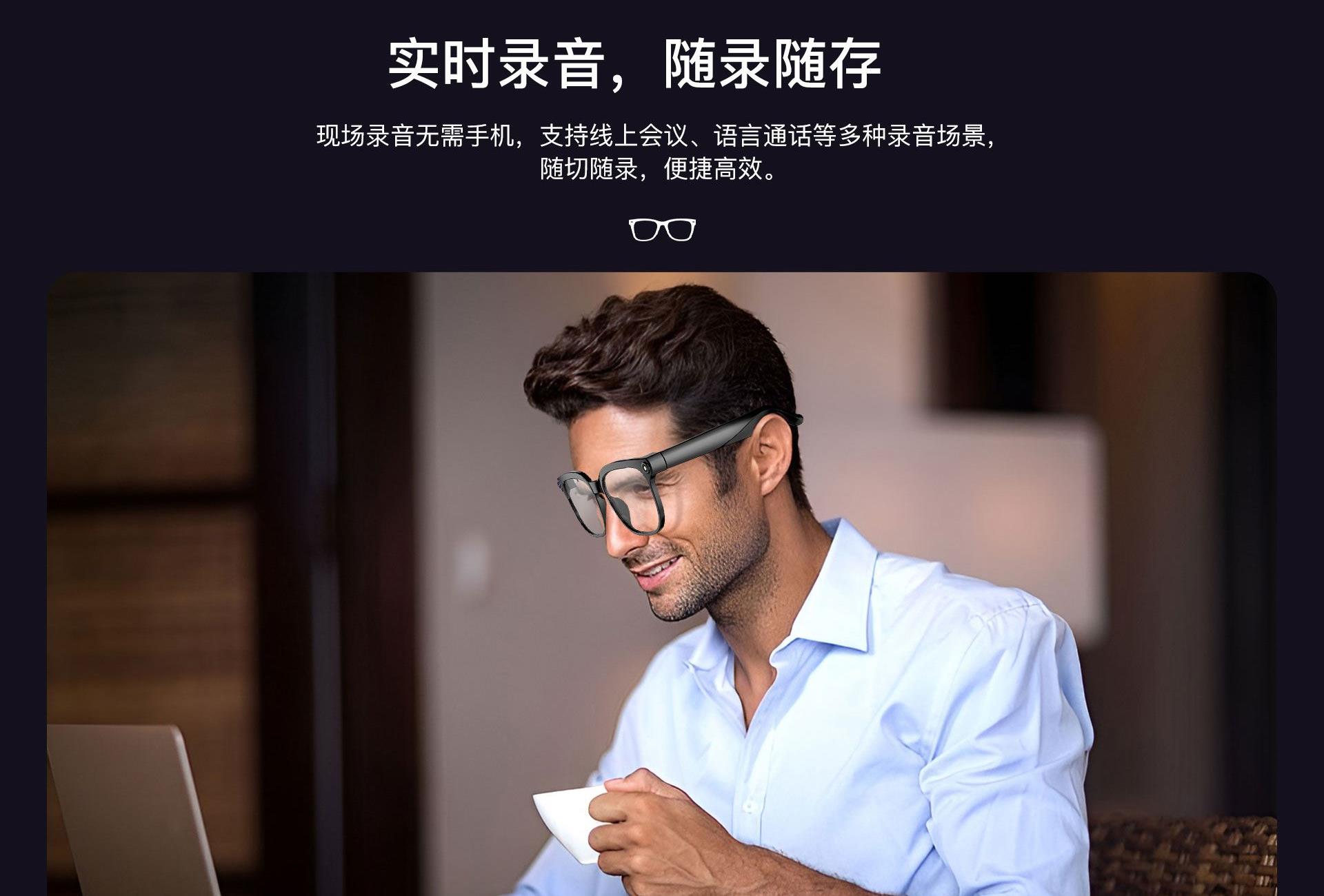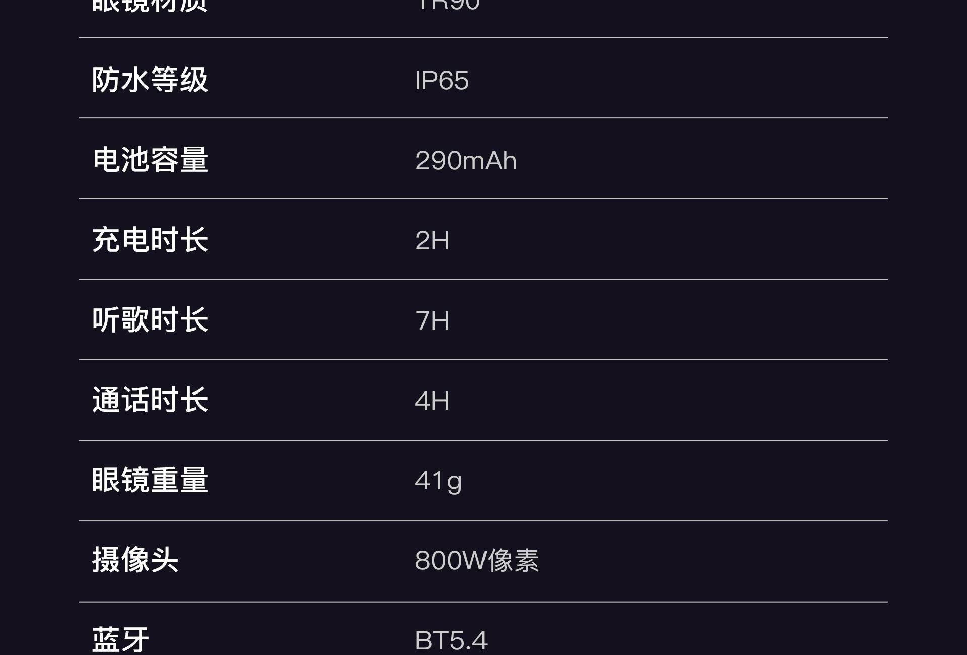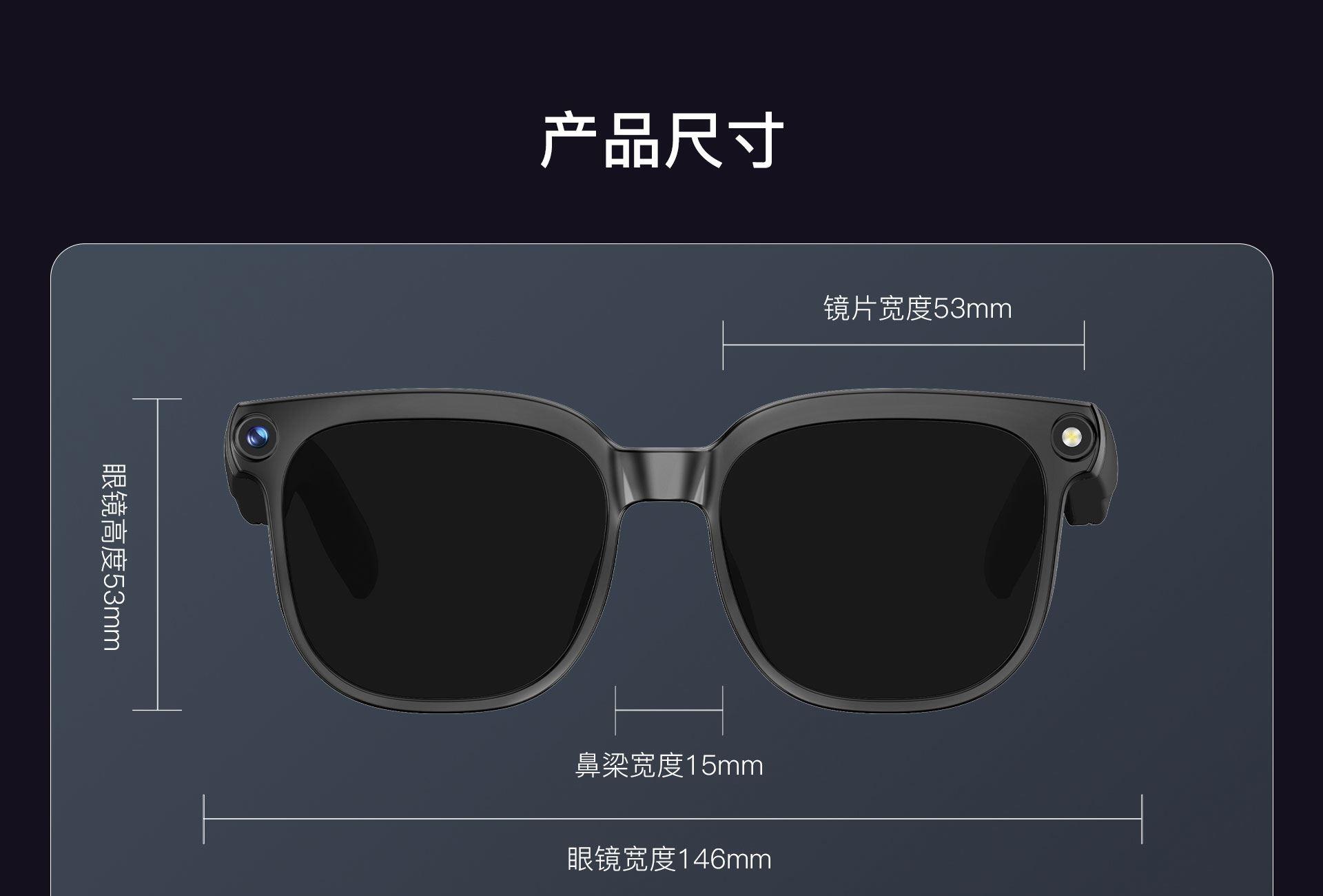 镜片:光致变镜片(室内透明,遇到紫外线变灰) 蓝牙:BT5.4 蓝牙距离:15米 喇叭 : 15*10*2 防水等级:IP65 电池容量:290mAh 充电时间:2H 听歌时间:7H 通话时间:4H左右 ◆800万高清镜头,拍照清晰、录像稳定,真实还原场景 ◆实时翻译眼镜,对话 实时互译,跨境交流、出行更顺畅 ◆AI智能交互,支持AI聊天、问答咨询,智能助手随叫随到 ◆一物多用,集拍照、录像、听音乐、蓝牙通话于一体,解放双手 ◆便捷操作体验,一键启动拍摄/通话,骑行、户外、工作记录更安全 ◆AI实物识别,拍照即可识别物品,获取信息、翻译解说一步到位