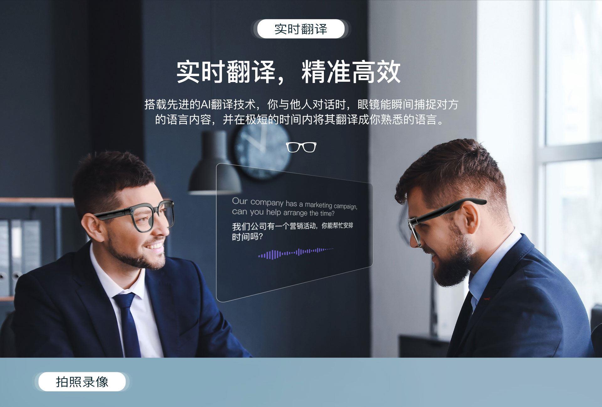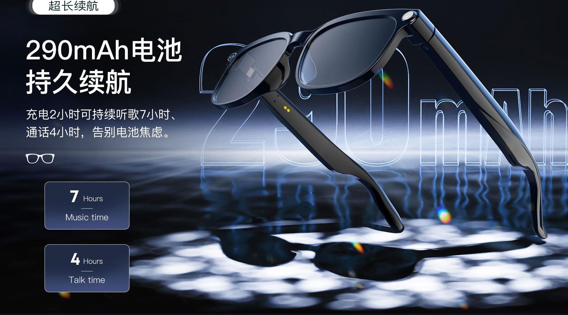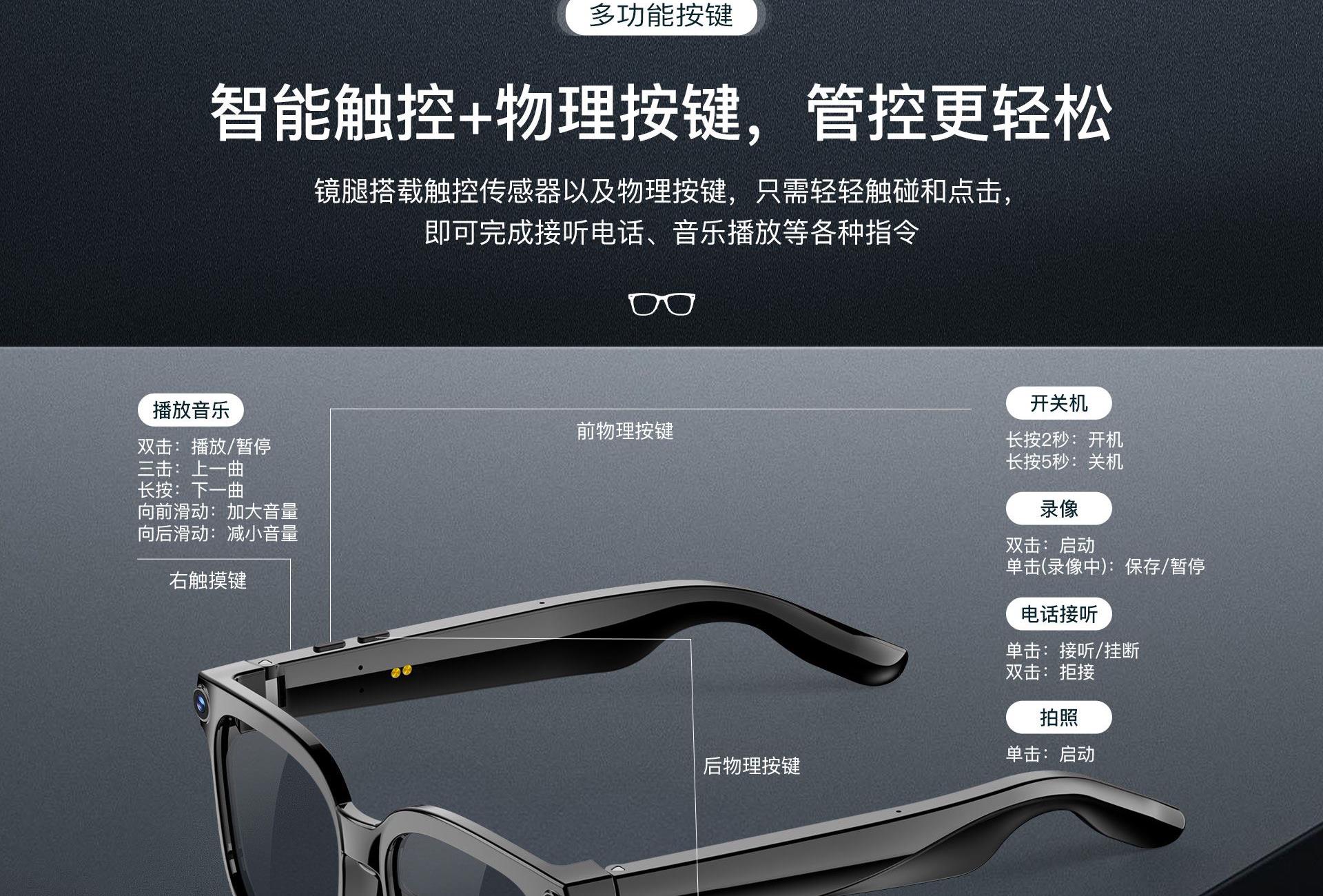 镜片:光致变镜片(室内透明,遇到紫外线变灰) 蓝牙:BT5.4 蓝牙距离:15米 喇叭 : 15*10*2 防水等级:IP65 电池容量:290mAh 充电时间:2H 听歌时间:7H 通话时间:4H左右 ◆800万高清镜头,拍照清晰、录像稳定,真实还原场景 ◆实时翻译眼镜,对话 实时互译,跨境交流、出行更顺畅 ◆AI智能交互,支持AI聊天、问答咨询,智能助手随叫随到 ◆一物多用,集拍照、录像、听音乐、蓝牙通话于一体,解放双手 ◆便捷操作体验,一键启动拍摄/通话,骑行、户外、工作记录更安全 ◆AI实物识别,拍照即可识别物品,获取信息、翻译解说一步到位
