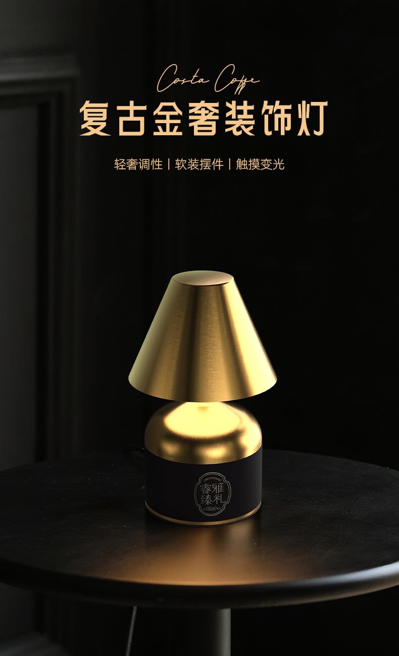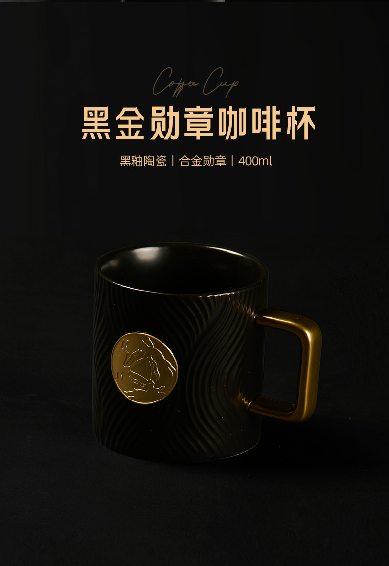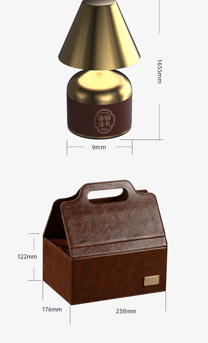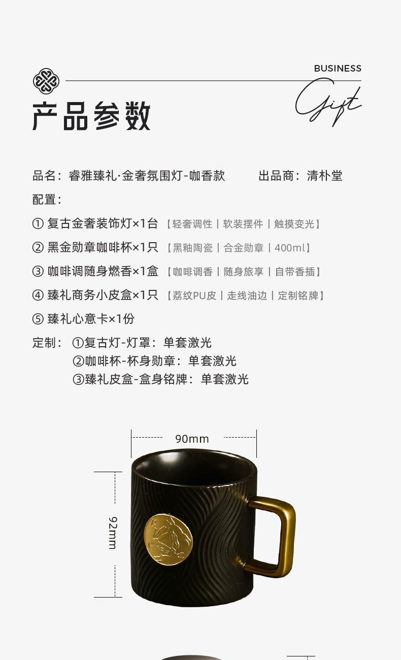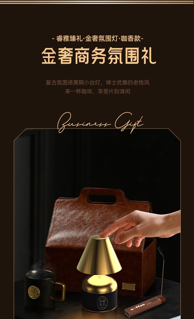 配置 · ① 复古金奢装饰灯×1台 【轻奢调性丨软装摆件丨触摸变光】 ② 黑金勋章咖啡杯×1只 【黑釉陶瓷丨合金勋章丨400ml】 ③ 咖啡调随身燃香×1盒 【咖啡调香丨随身旅享丨自带香插】 ④ 臻礼商务小皮盒×1只 【荔纹PU皮丨走线油边丨定制铭牌】 ⑤ 臻礼心意卡×1份